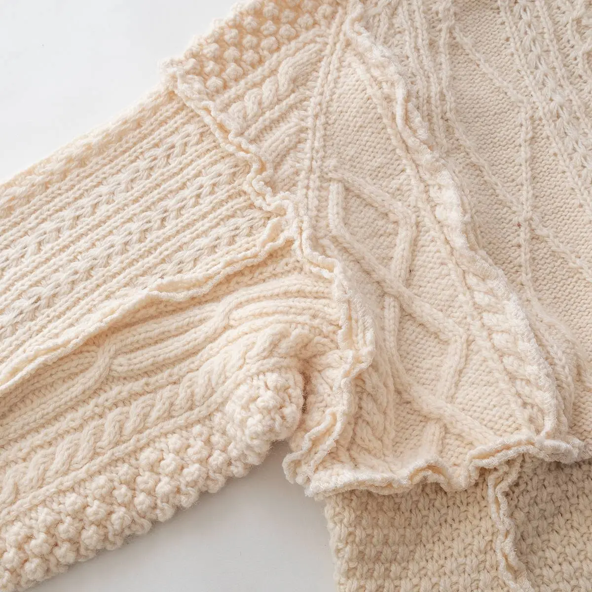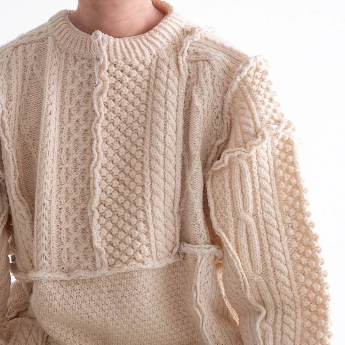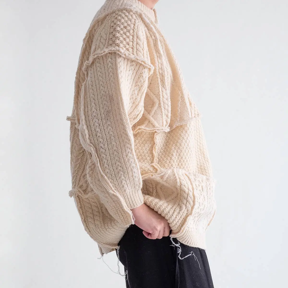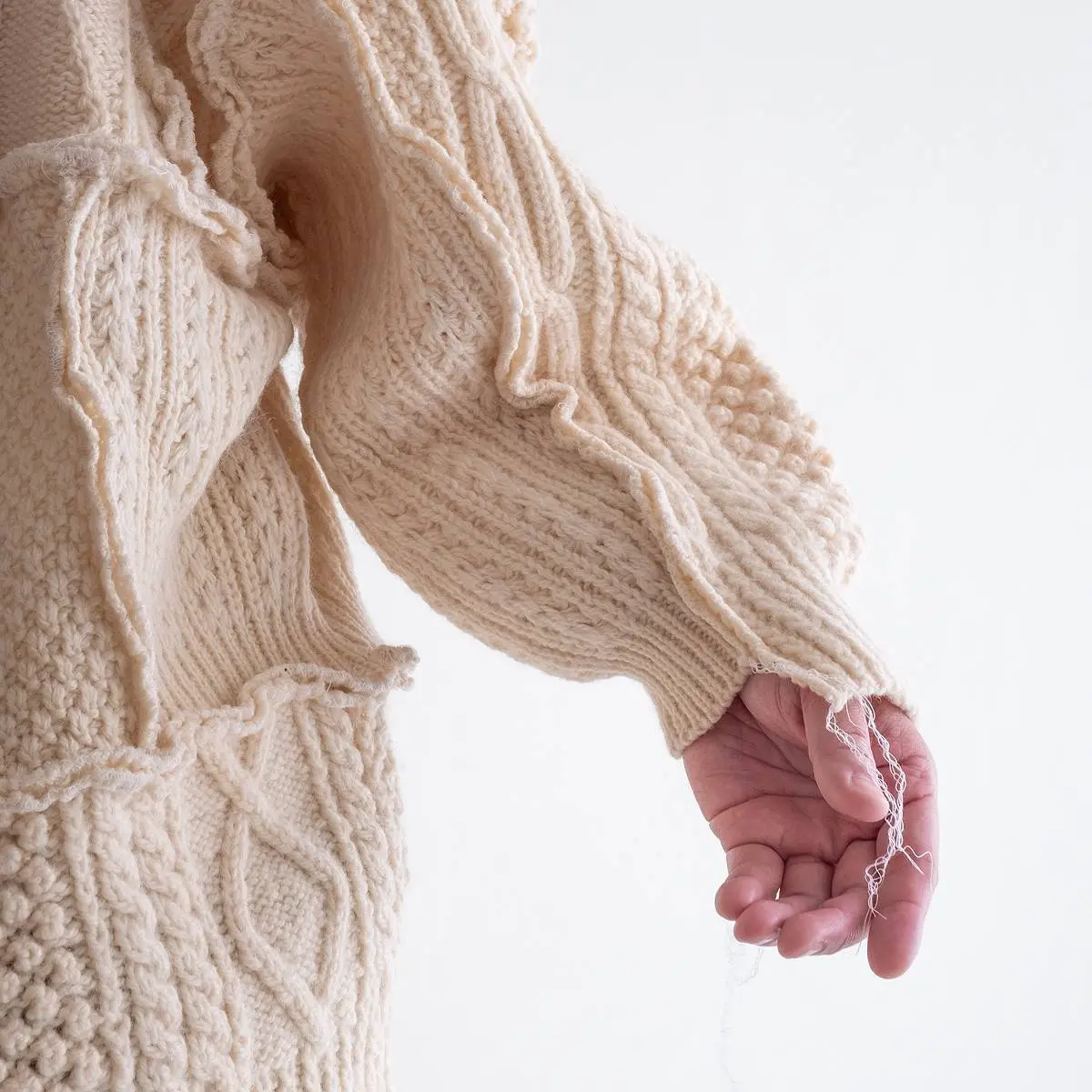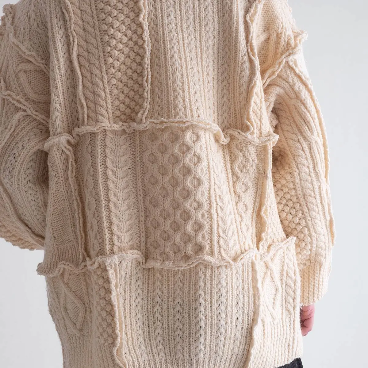 ヴィンテージのフィッシャーマンニットを数枚解体した後、編み地のバランスを⾒ながら再構築。ボリュームのあるシルエットと編み地のコントラストが魅⼒的なアイテム。日本製。※こちらのアイテムは古着をリメイクしています。そのため、製品の多少の歪み・しわ等が見られますが、これは古着&リメイクの特徴で、そのディティールをお楽しみいただけるアイテムとなっております。
