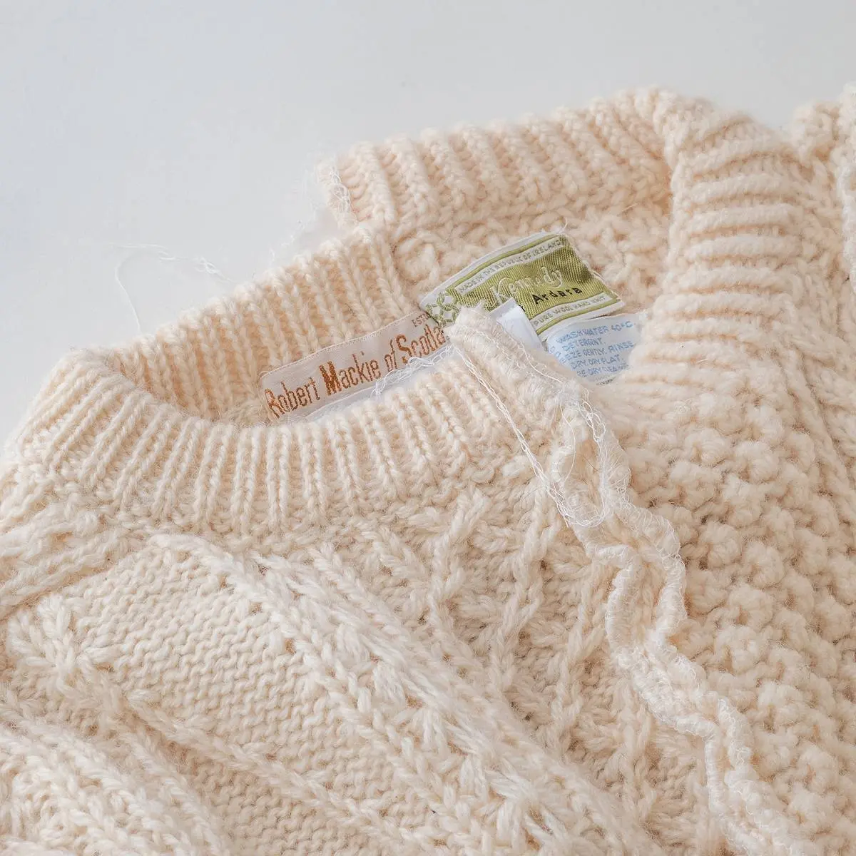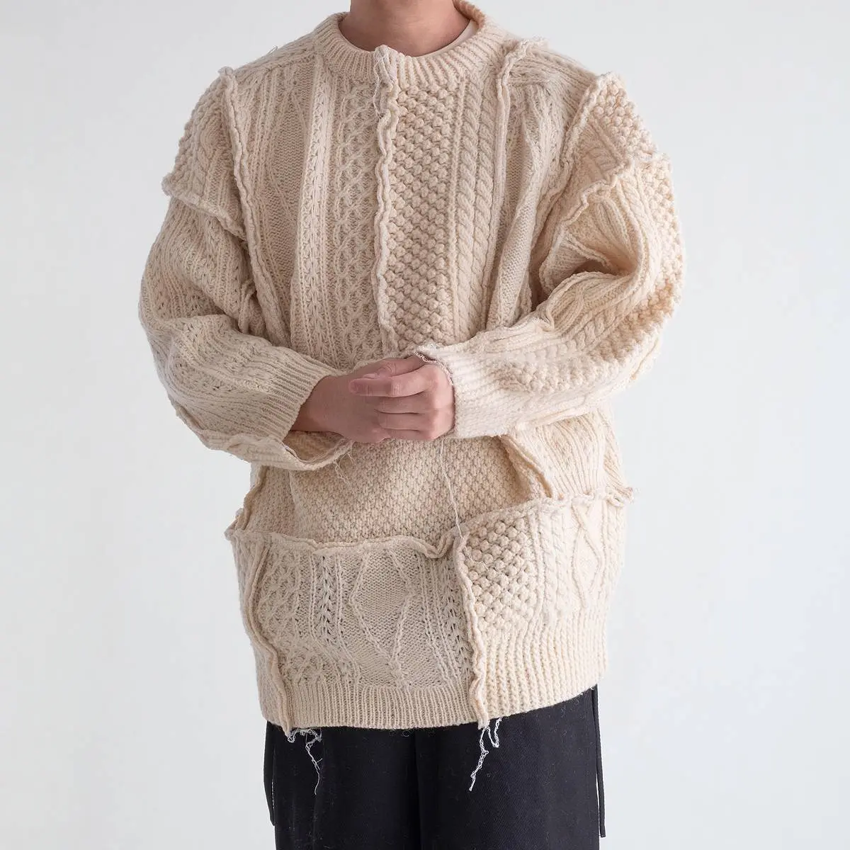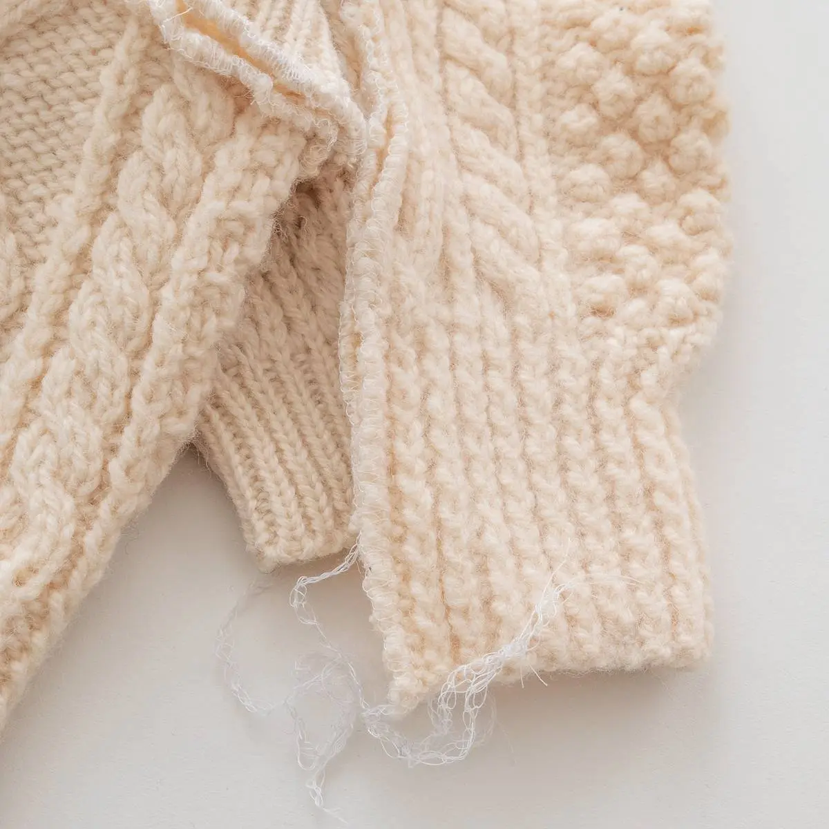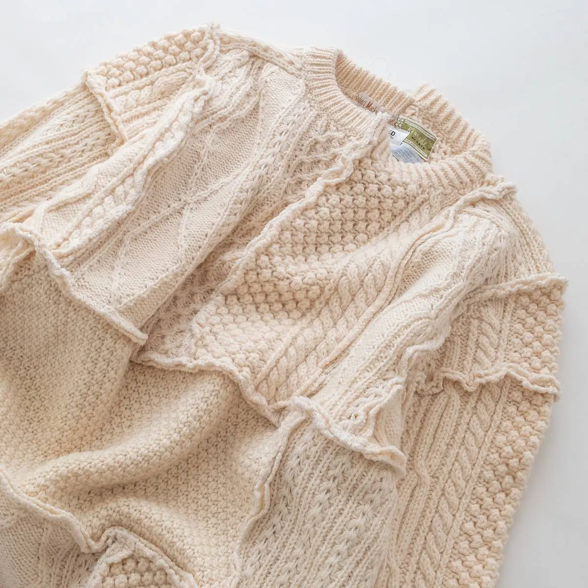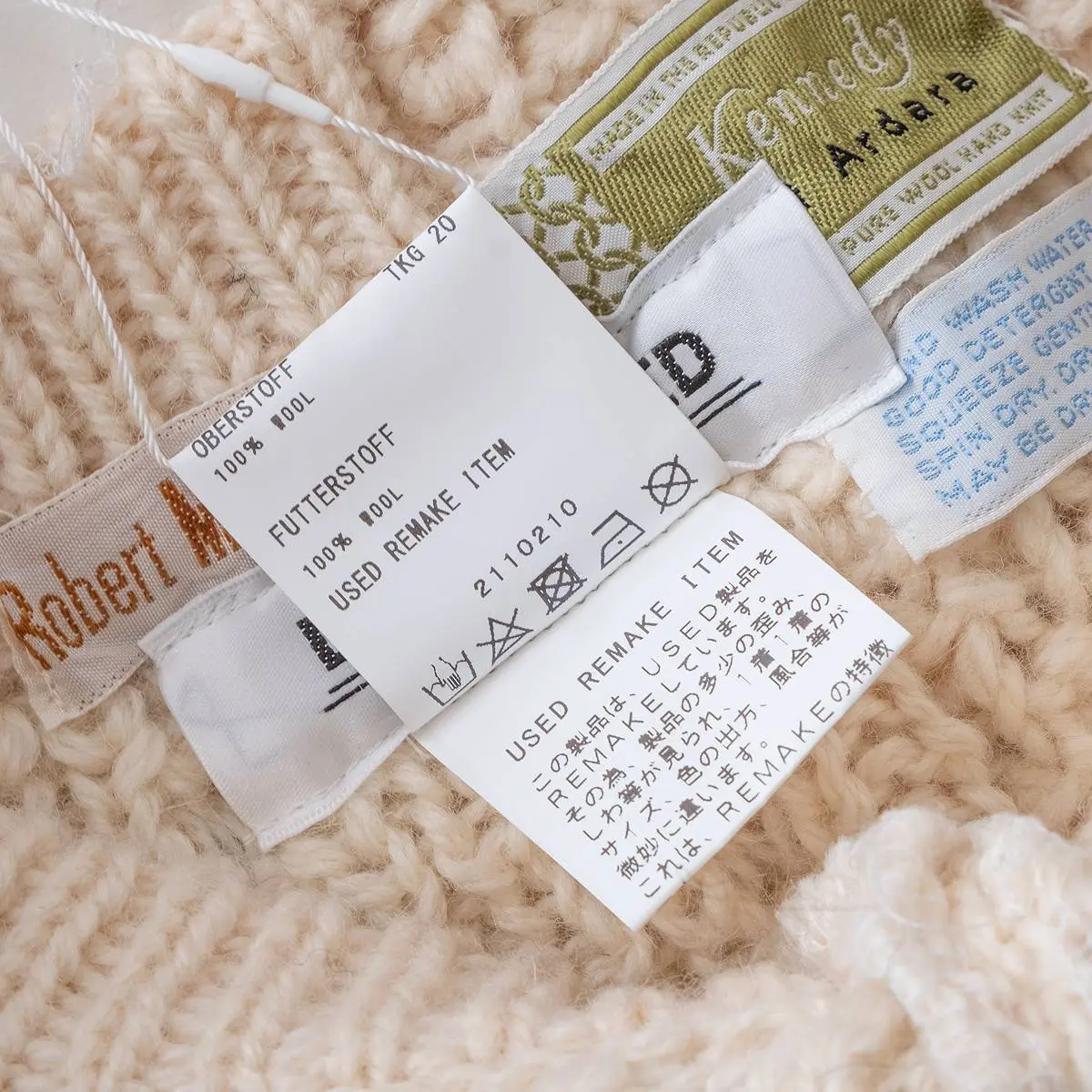ヴィンテージのフィッシャーマンニットを数枚解体した後、編み地のバランスを⾒ながら再構築。ボリュームのあるシルエットと編み地のコントラストが魅⼒的なアイテム。日本製。※こちらのアイテムは古着をリメイクしています。そのため、製品の多少の歪み・しわ等が見られますが、これは古着&リメイクの特徴で、そのディティールをお楽しみいただけるアイテムとなっております。