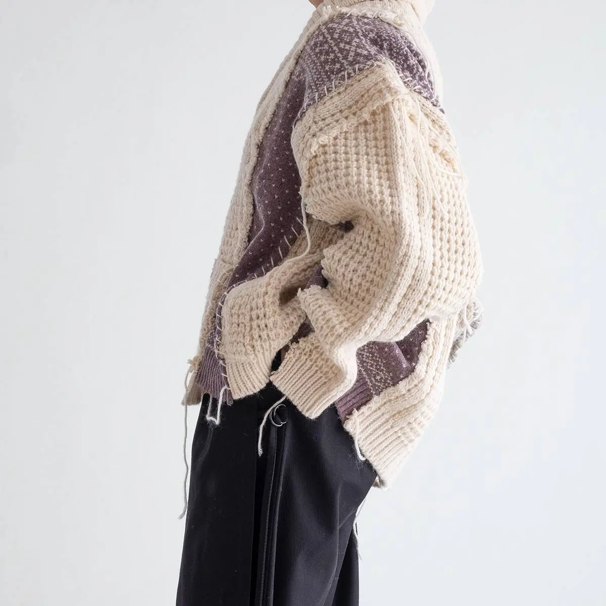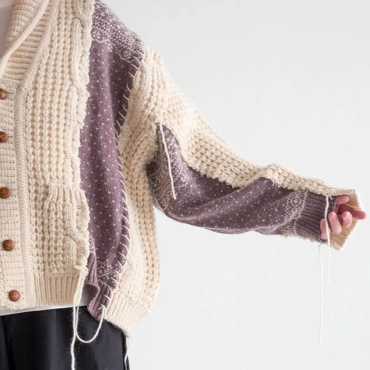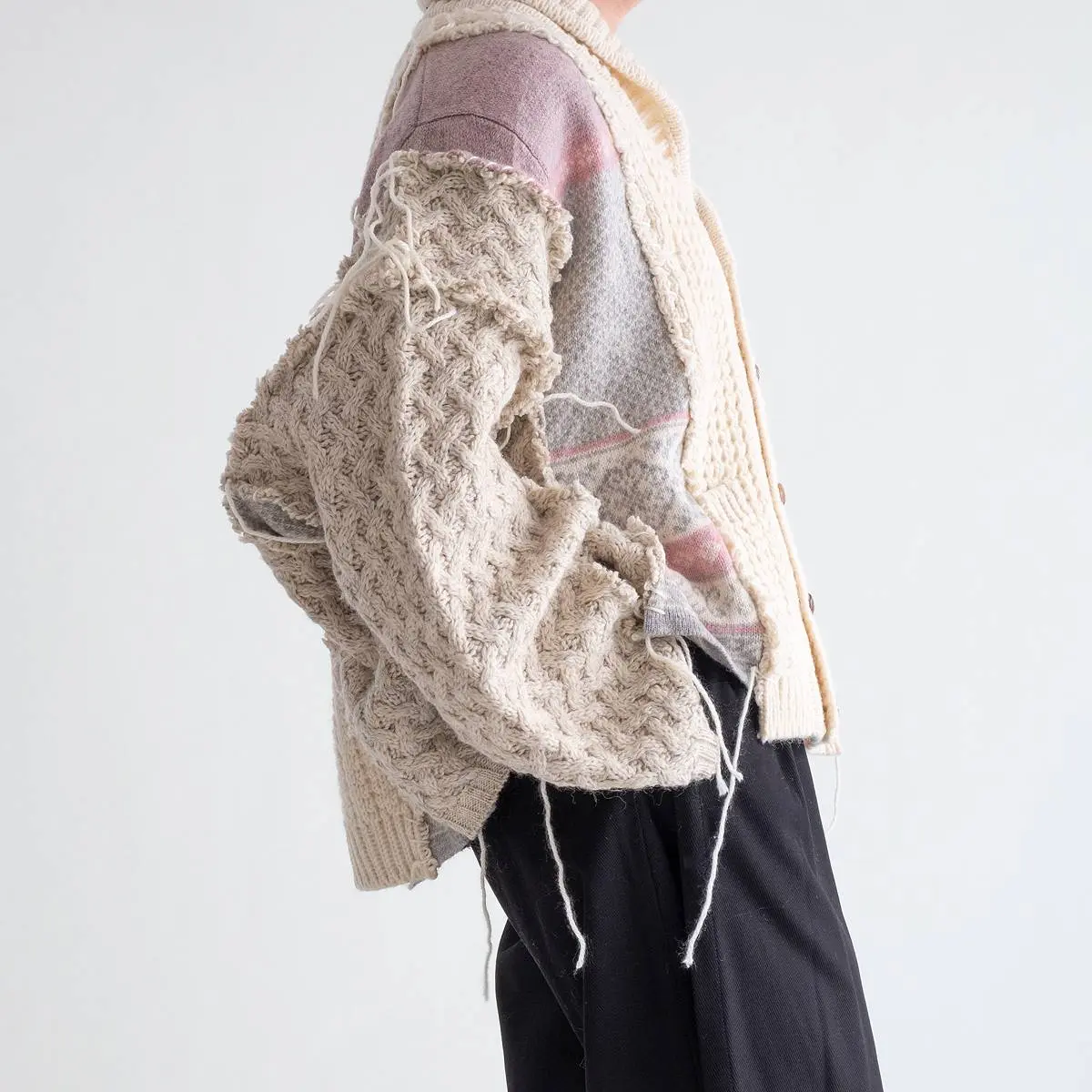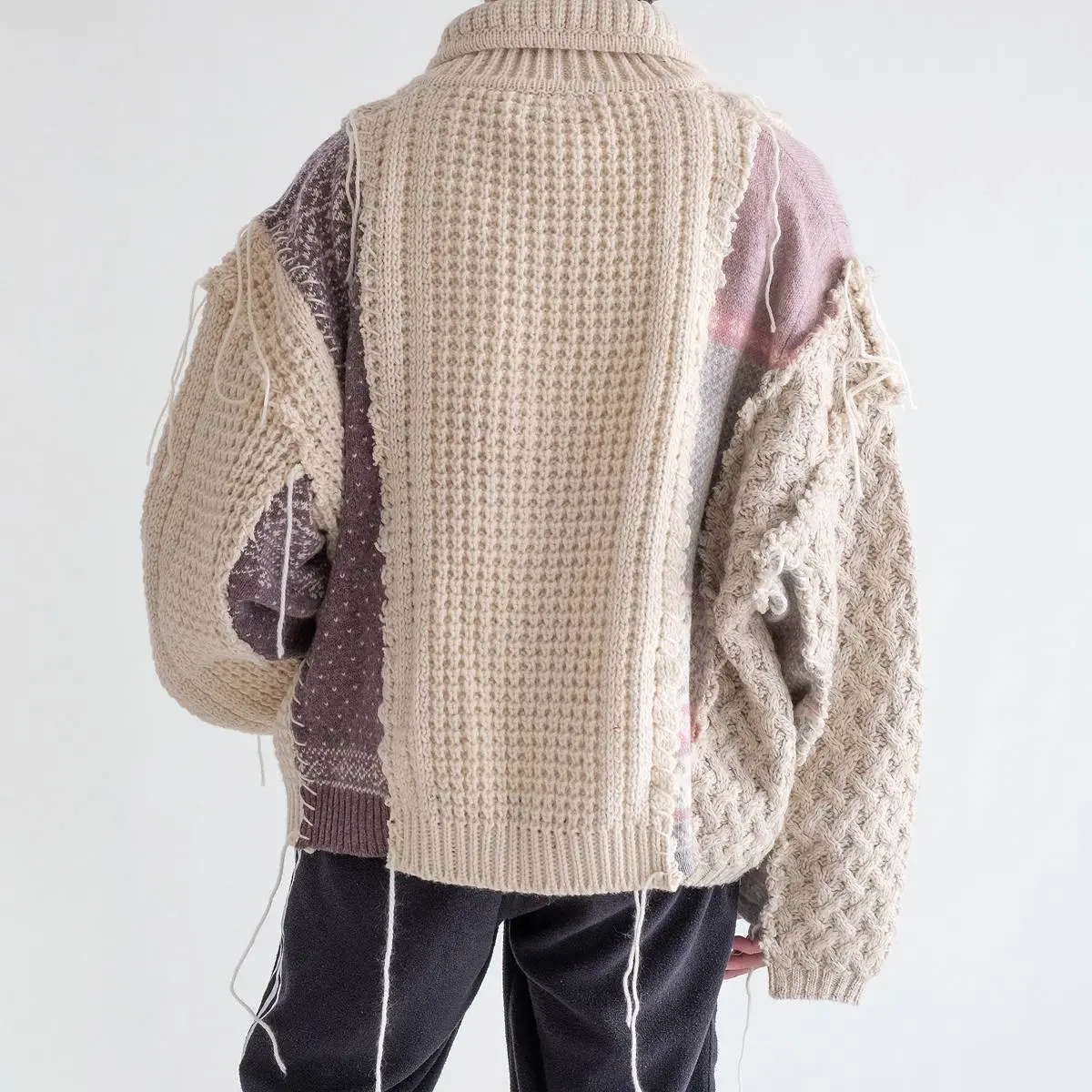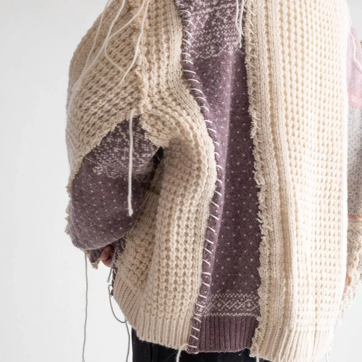 ヴィンテージのフィッシャーマンニットとノルディックニットを解体した後、編み地のバランスを⾒ながら再構築。ボリュームのあるシルエットと異なるニットの編み地のコントラスト、ハンドステッチがポイントとなったアイテム。日本製。※こちらのアイテムは古着をリメイクしています。そのため、製品の多少の歪み・しわ等が見られますが、これは古着&リメイクの特徴で、そのディティールをお楽しみいただけるアイテムとなっております。