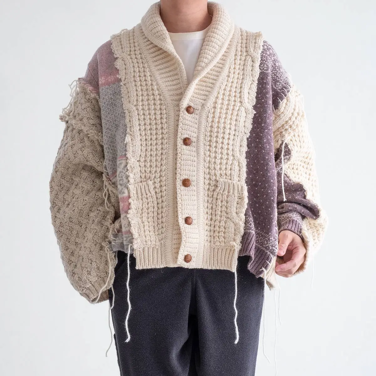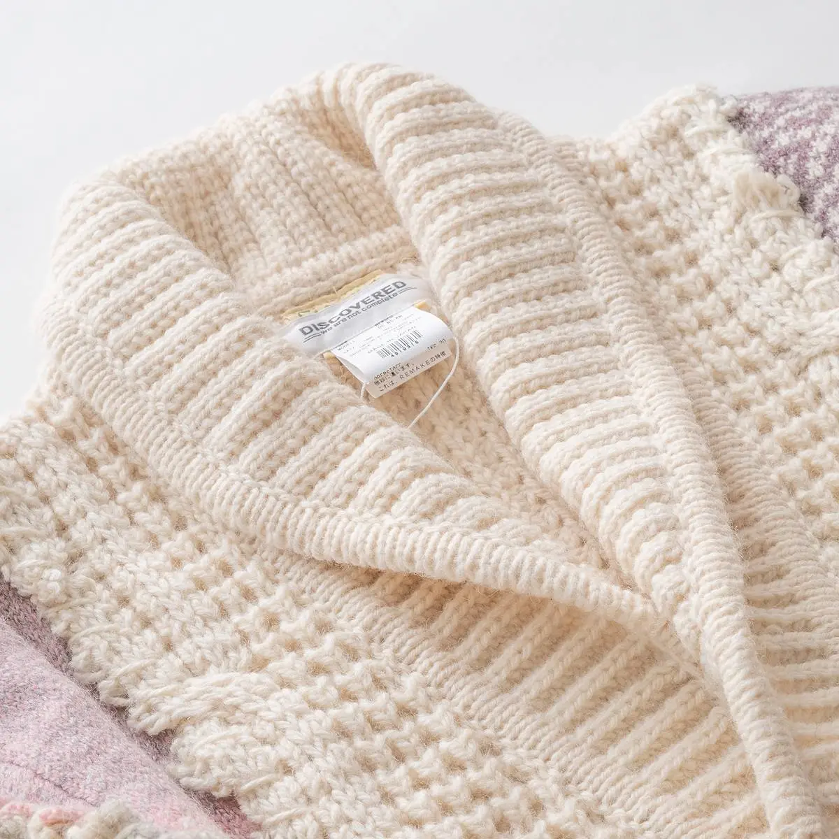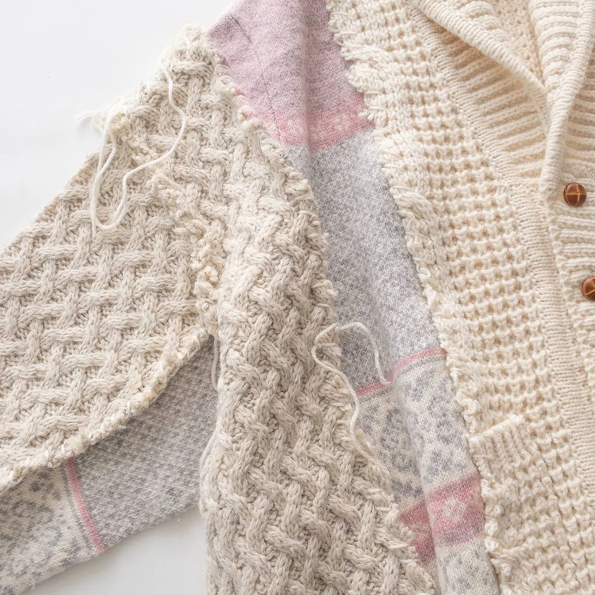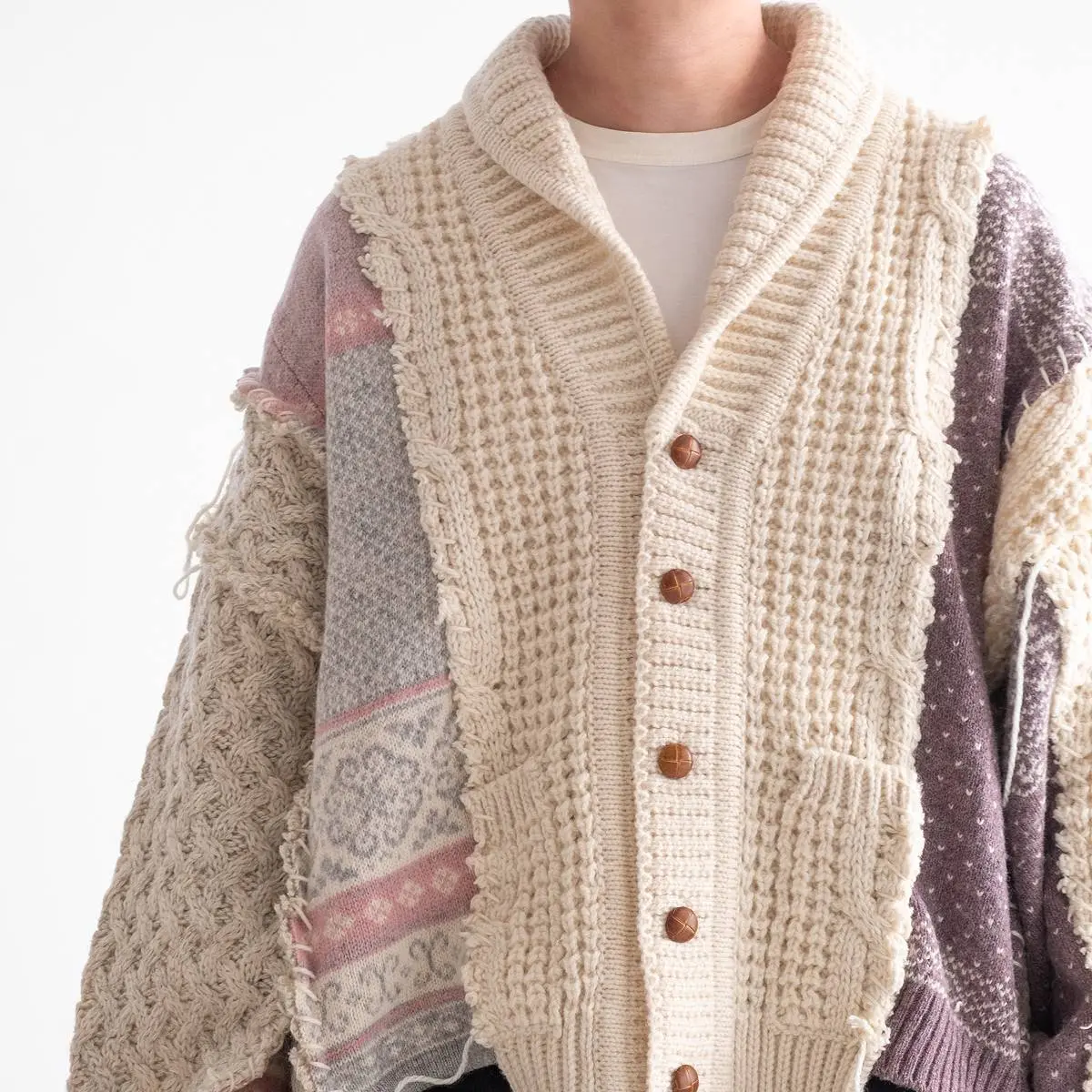 ヴィンテージのフィッシャーマンニットとノルディックニットを解体した後、編み地のバランスを⾒ながら再構築。ボリュームのあるシルエットと異なるニットの編み地のコントラスト、ハンドステッチがポイントとなったアイテム。日本製。※こちらのアイテムは古着をリメイクしています。そのため、製品の多少の歪み・しわ等が見られますが、これは古着&リメイクの特徴で、そのディティールをお楽しみいただけるアイテムとなっております。