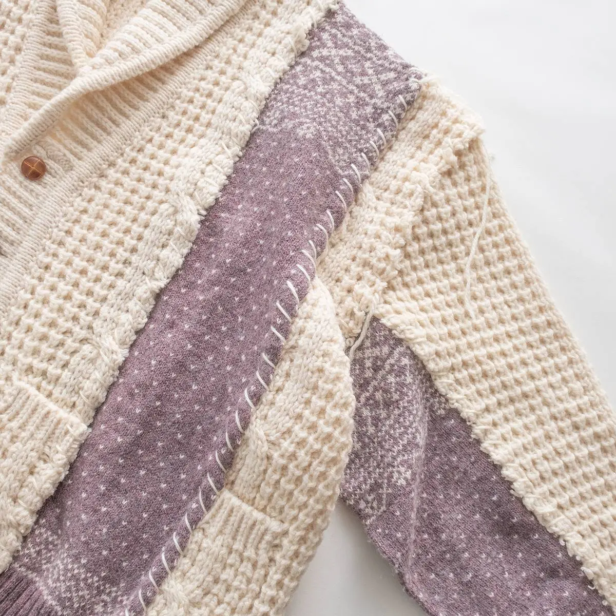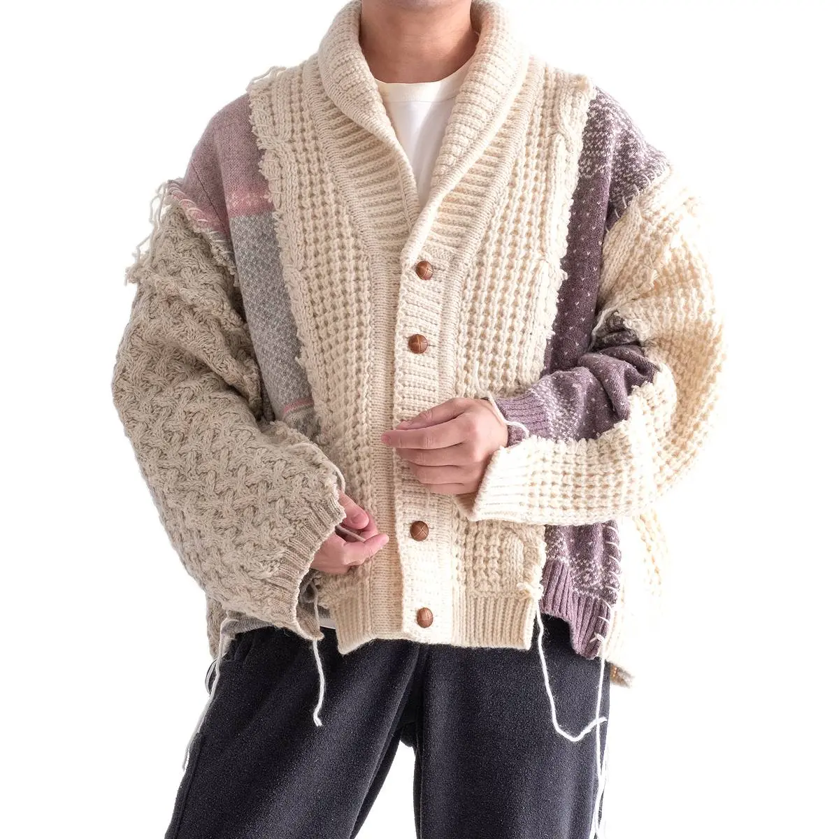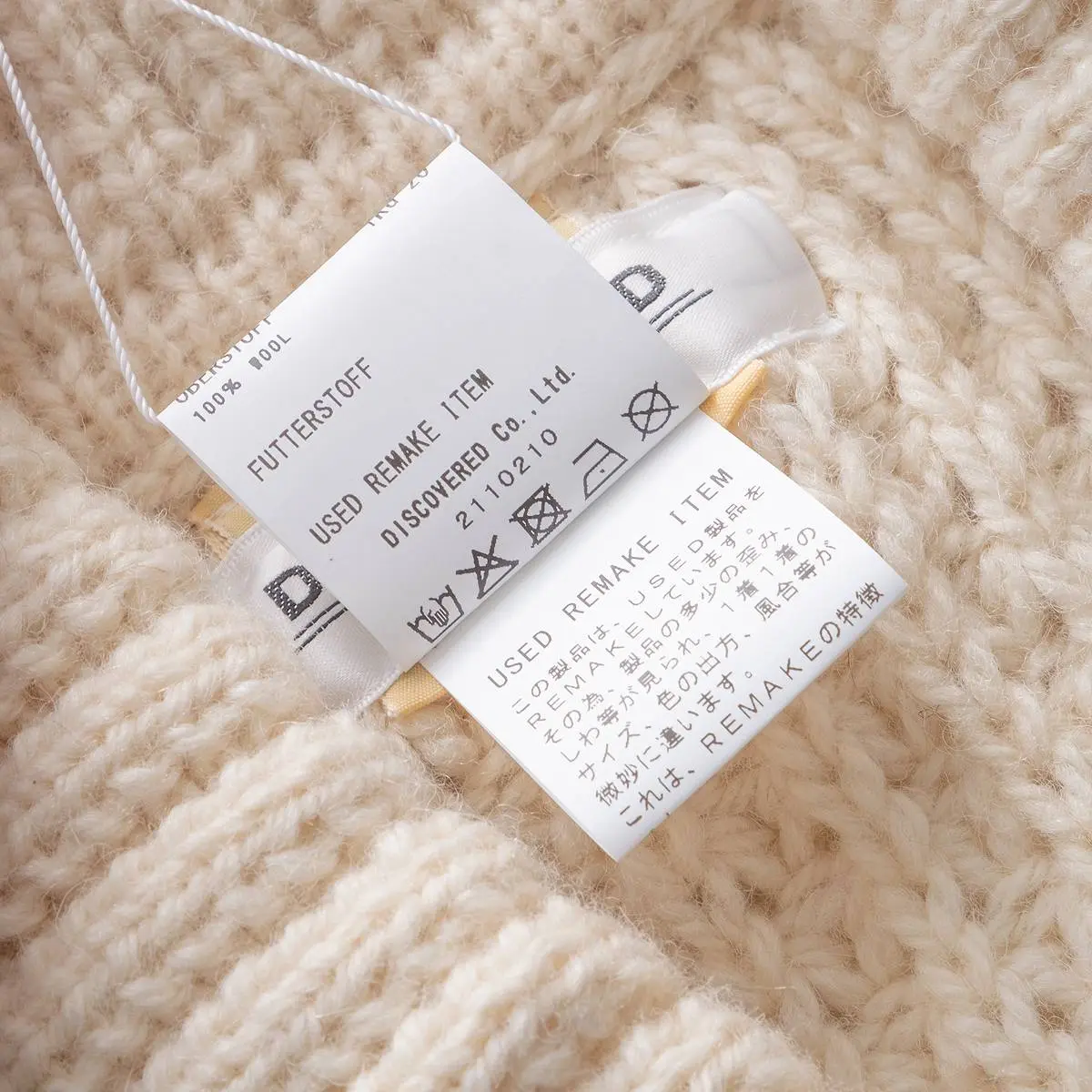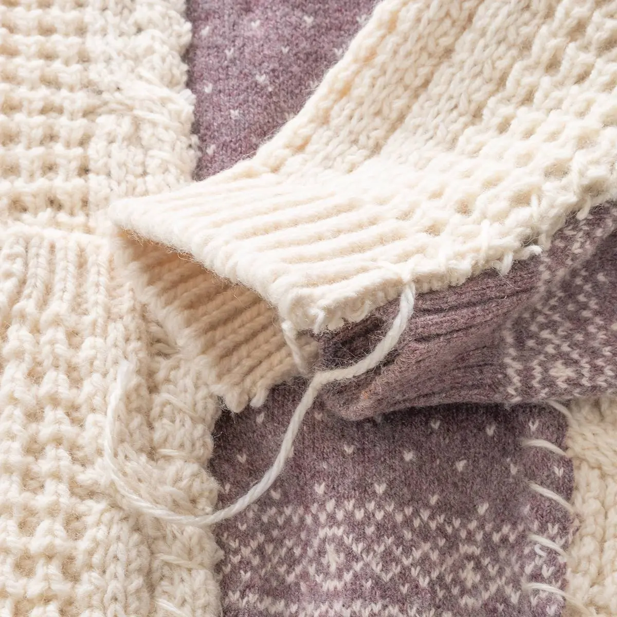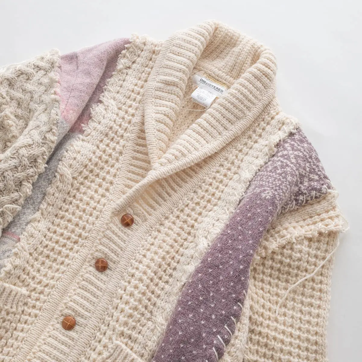 ヴィンテージのフィッシャーマンニットとノルディックニットを解体した後、編み地のバランスを⾒ながら再構築。ボリュームのあるシルエットと異なるニットの編み地のコントラスト、ハンドステッチがポイントとなったアイテム。日本製。※こちらのアイテムは古着をリメイクしています。そのため、製品の多少の歪み・しわ等が見られますが、これは古着&リメイクの特徴で、そのディティールをお楽しみいただけるアイテムとなっております。