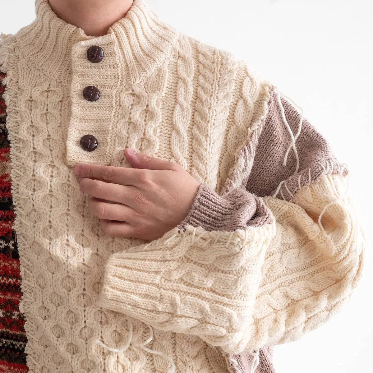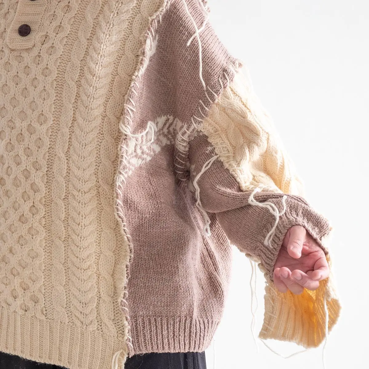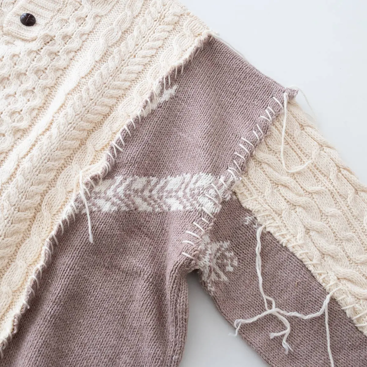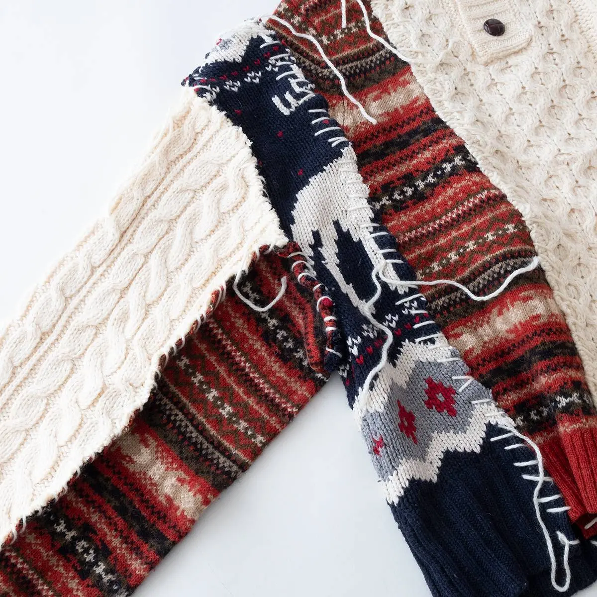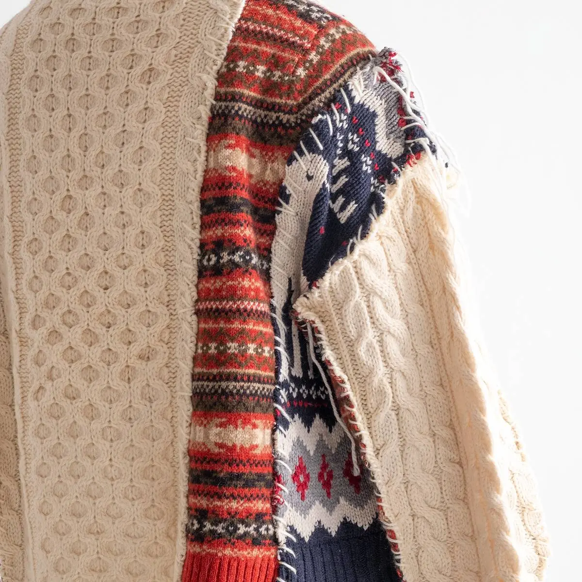 ヴィンテージのフィッシャーマンニットとノルディックニットを解体した後、コラージュニットを再構築。ポイントは、ニットのコントラストや⼿仕事の異なるステッチをアレンジしたことです。日本製。※こちらのアイテムは古着をリメイクしています。そのため、製品の多少の歪み・しわ等が見られますが、これは古着&リメイクの特徴で、そのディティールをお楽しみいただけるアイテムとなっております。