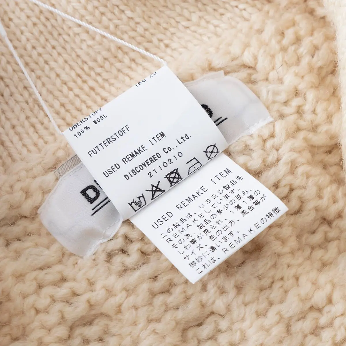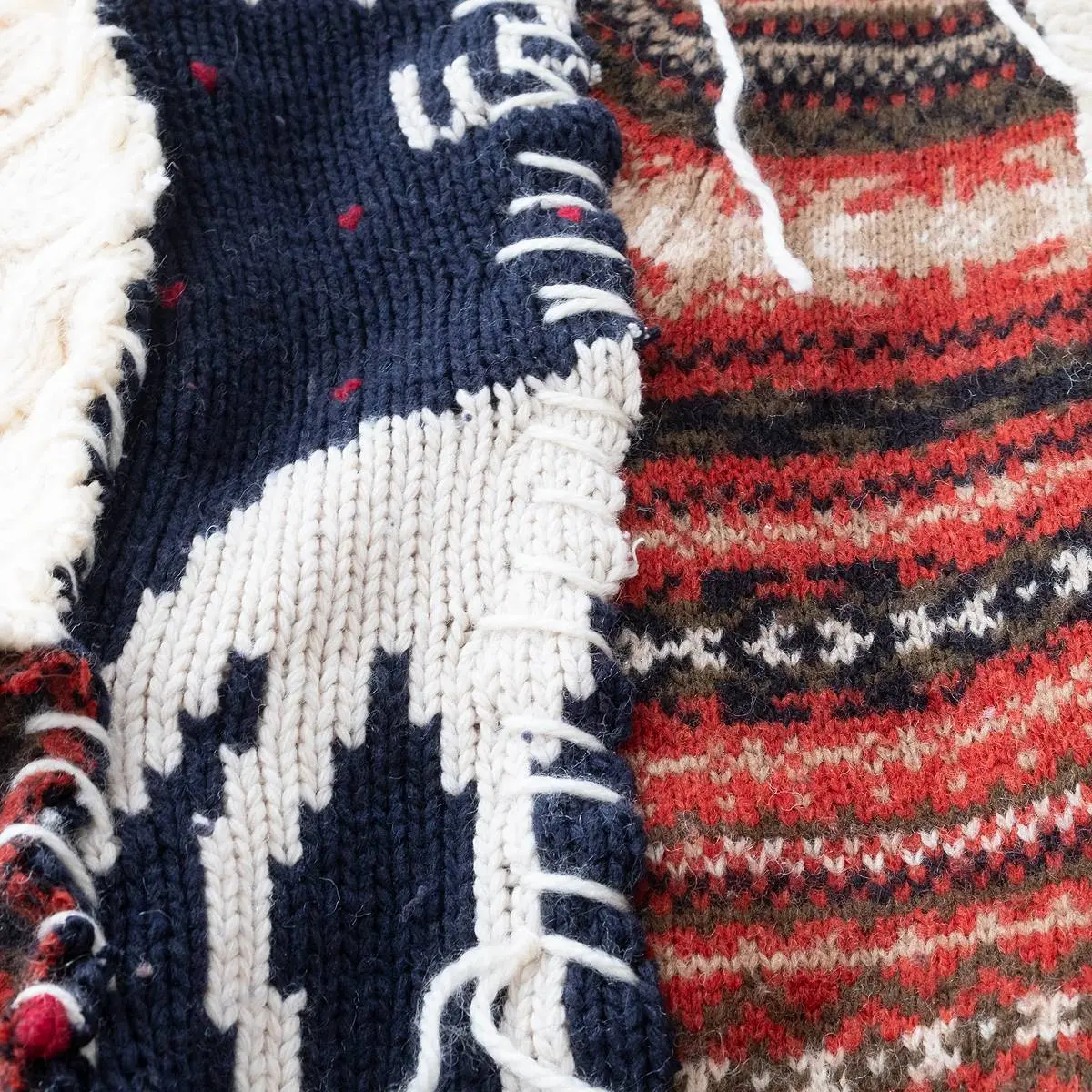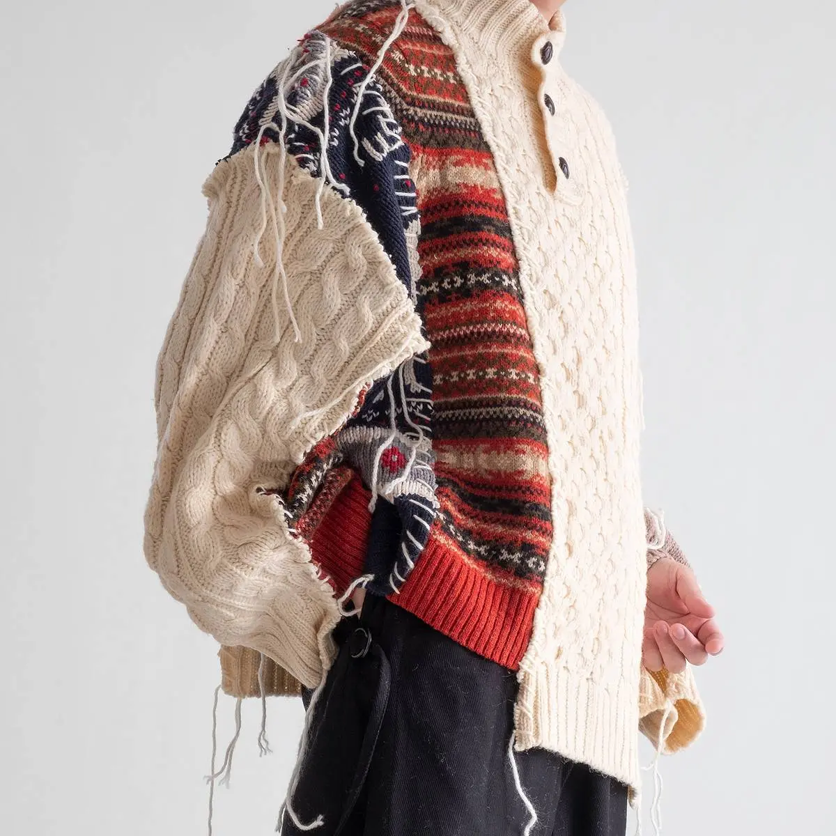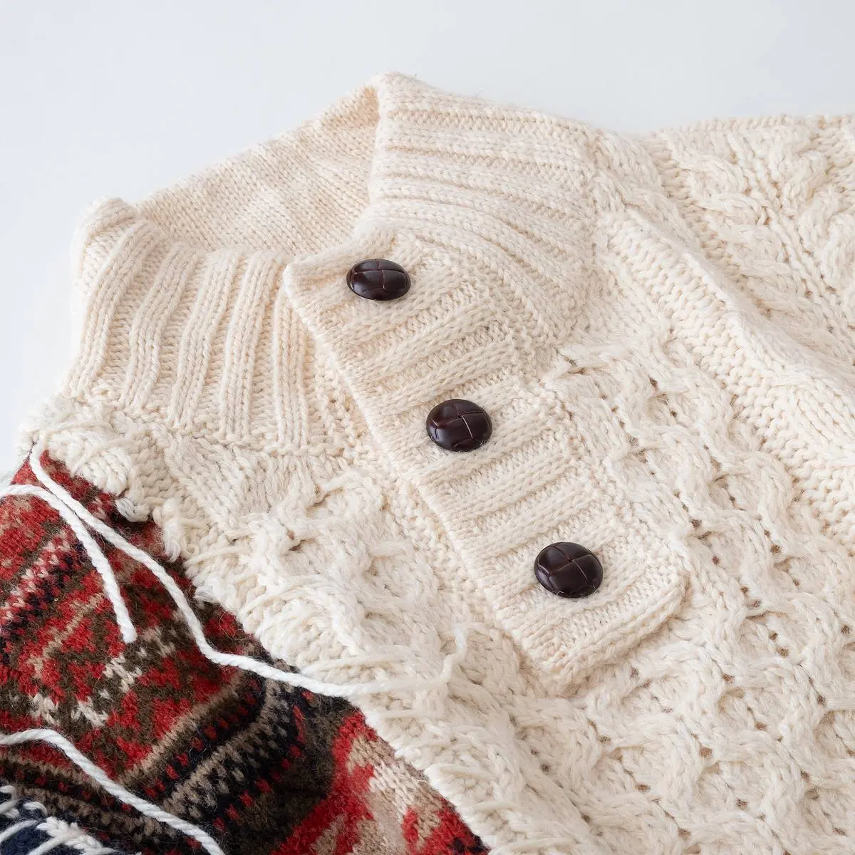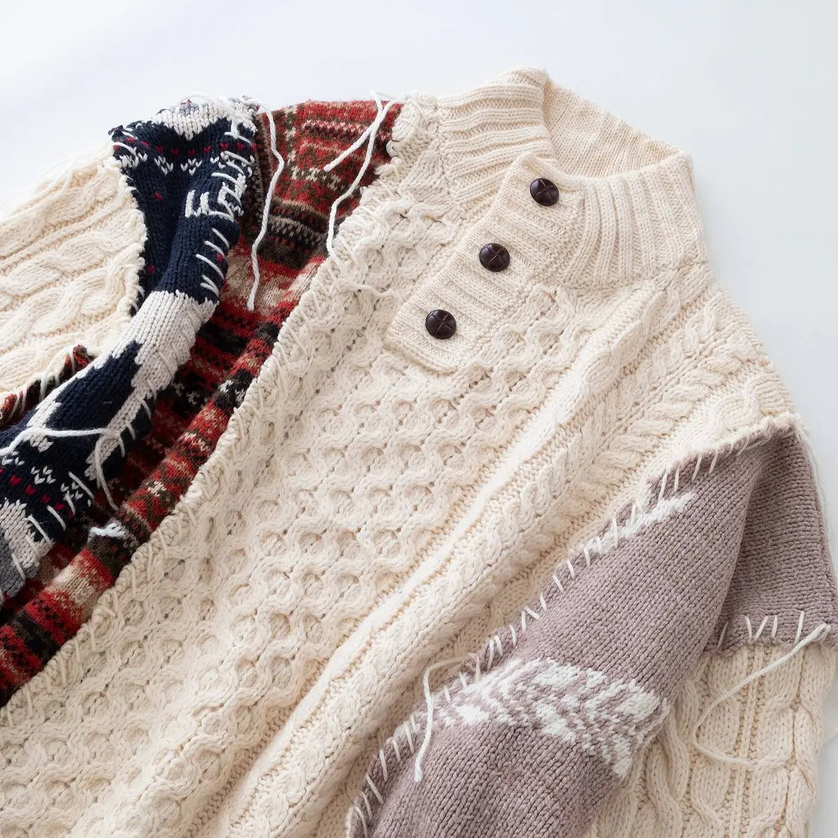 ヴィンテージのフィッシャーマンニットとノルディックニットを解体した後、コラージュニットを再構築。ポイントは、ニットのコントラストや⼿仕事の異なるステッチをアレンジしたことです。日本製。※こちらのアイテムは古着をリメイクしています。そのため、製品の多少の歪み・しわ等が見られますが、これは古着&リメイクの特徴で、そのディティールをお楽しみいただけるアイテムとなっております。