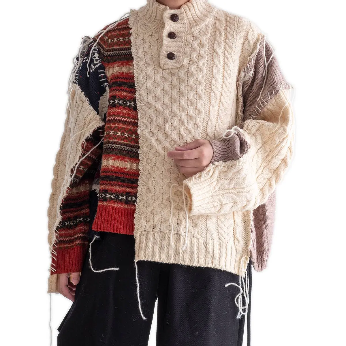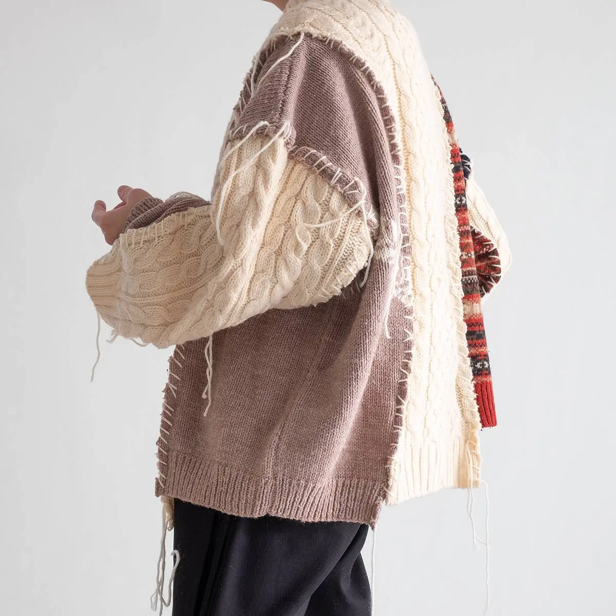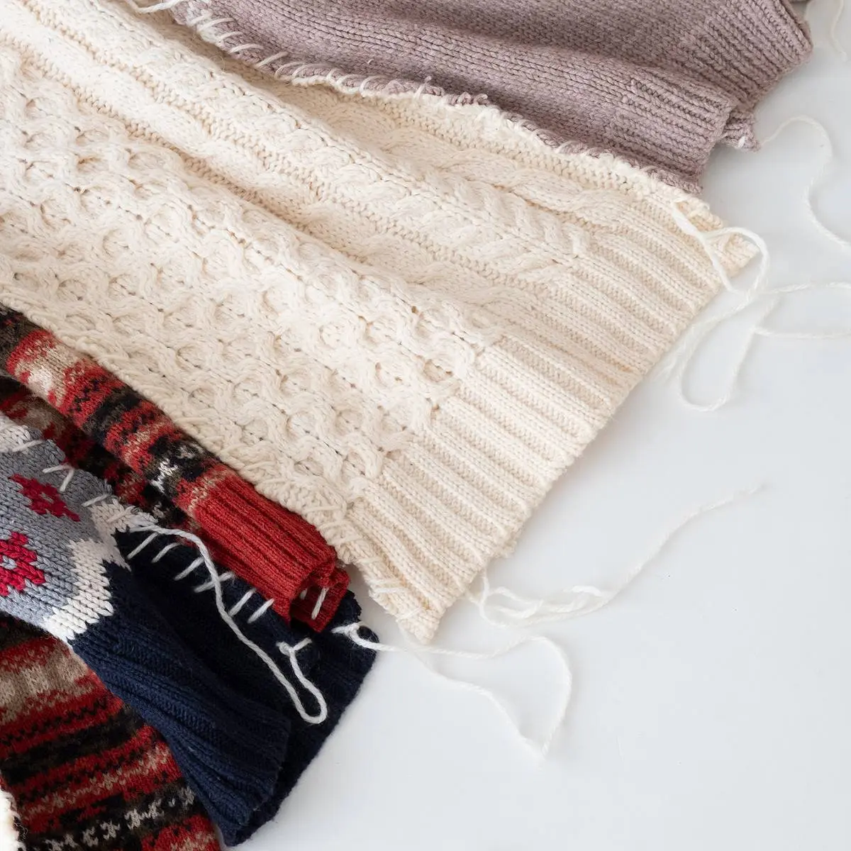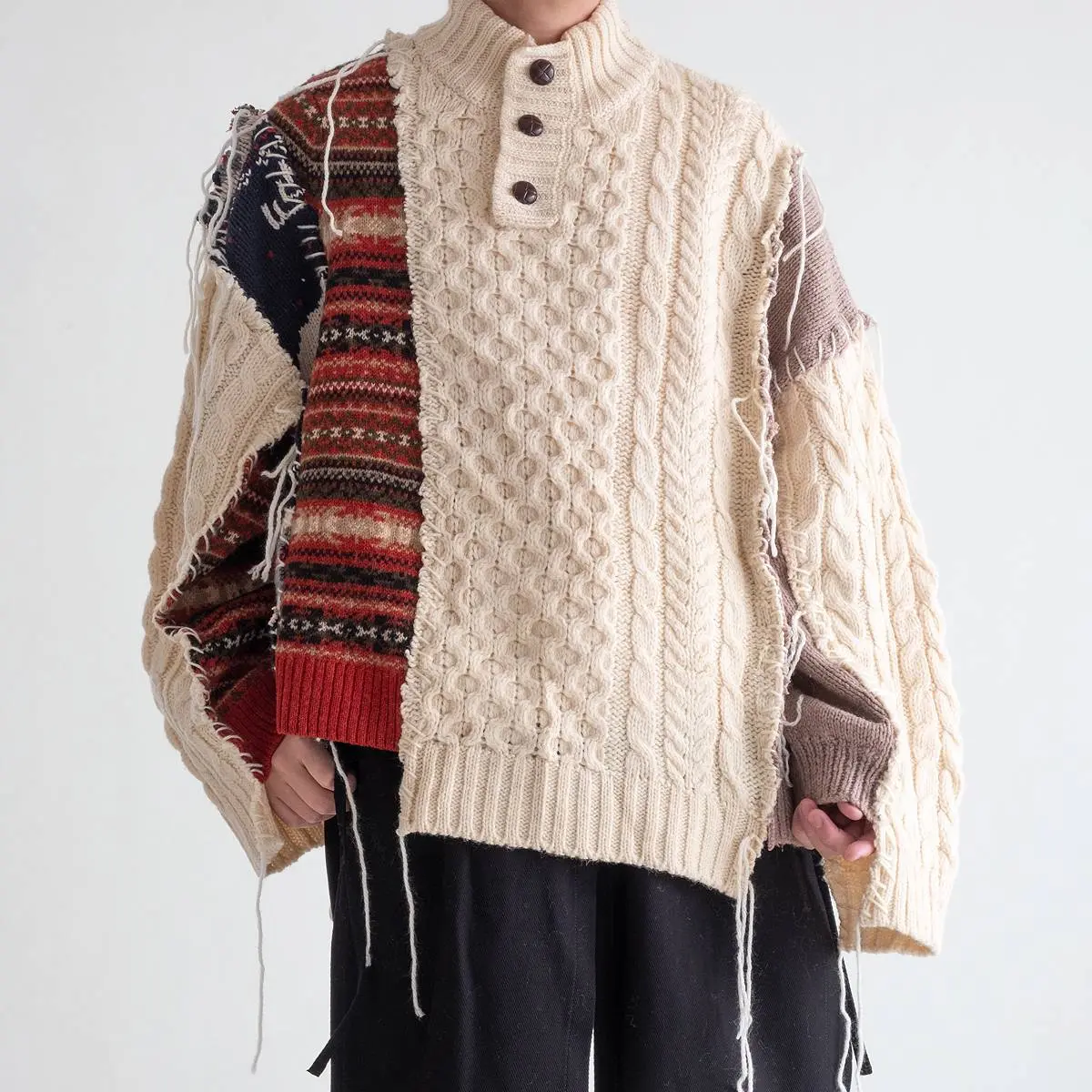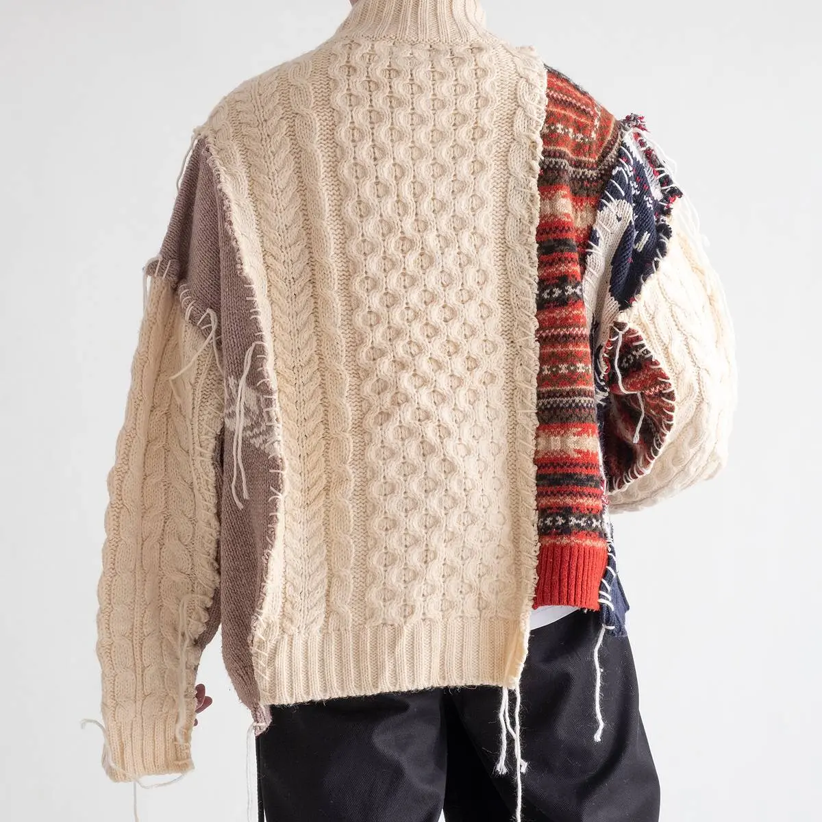 ヴィンテージのフィッシャーマンニットとノルディックニットを解体した後、コラージュニットを再構築。ポイントは、ニットのコントラストや⼿仕事の異なるステッチをアレンジしたことです。日本製。※こちらのアイテムは古着をリメイクしています。そのため、製品の多少の歪み・しわ等が見られますが、これは古着&リメイクの特徴で、そのディティールをお楽しみいただけるアイテムとなっております。