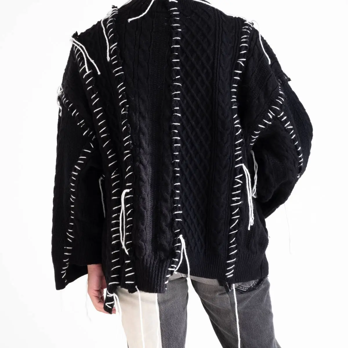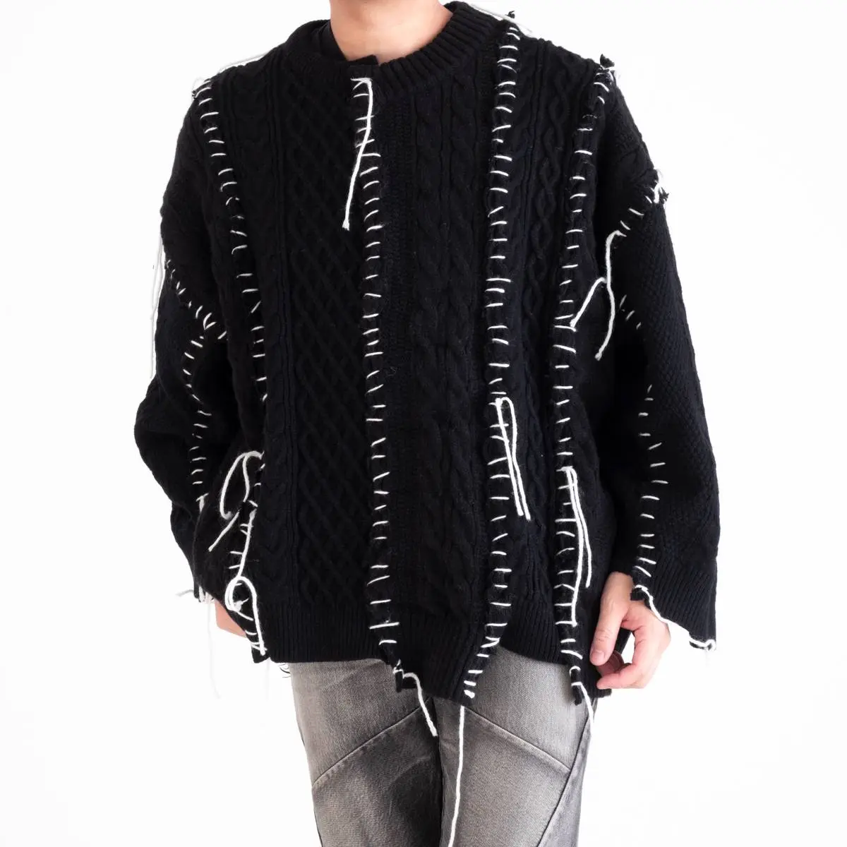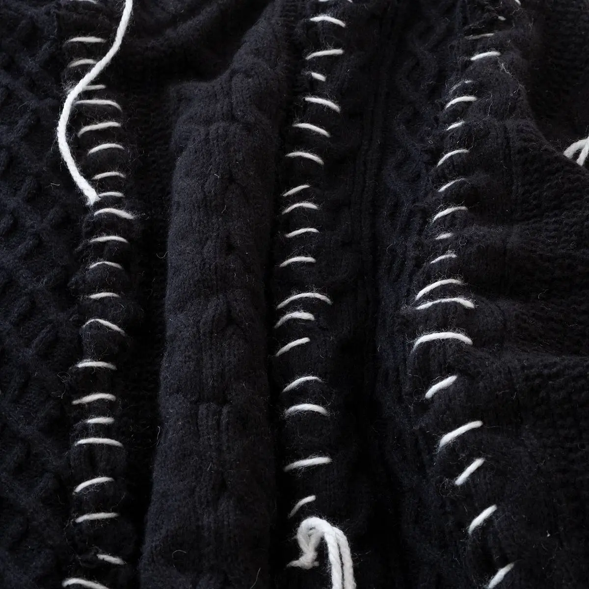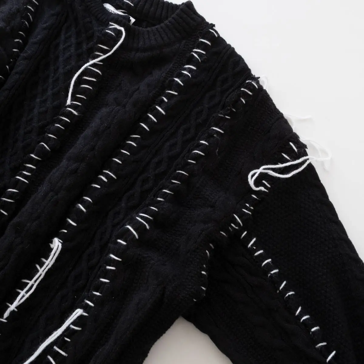 ヴィンテージのフィッシャーマンニットとノルディックニットを解体した後、コラージュニットを再構築。ポイントは、ニットのコントラストや⼿仕事の異なるステッチをアレンジしたことです。日本製。※こちらのアイテムは古着をリメイクしています。そのため、製品の多少の歪み・しわ等が見られますが、これは古着&リメイクの特徴で、そのディティールをお楽しみいただけるアイテムとなっております。