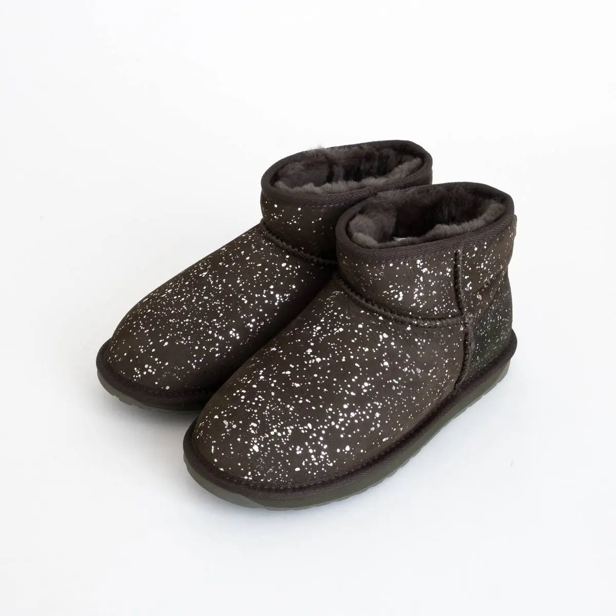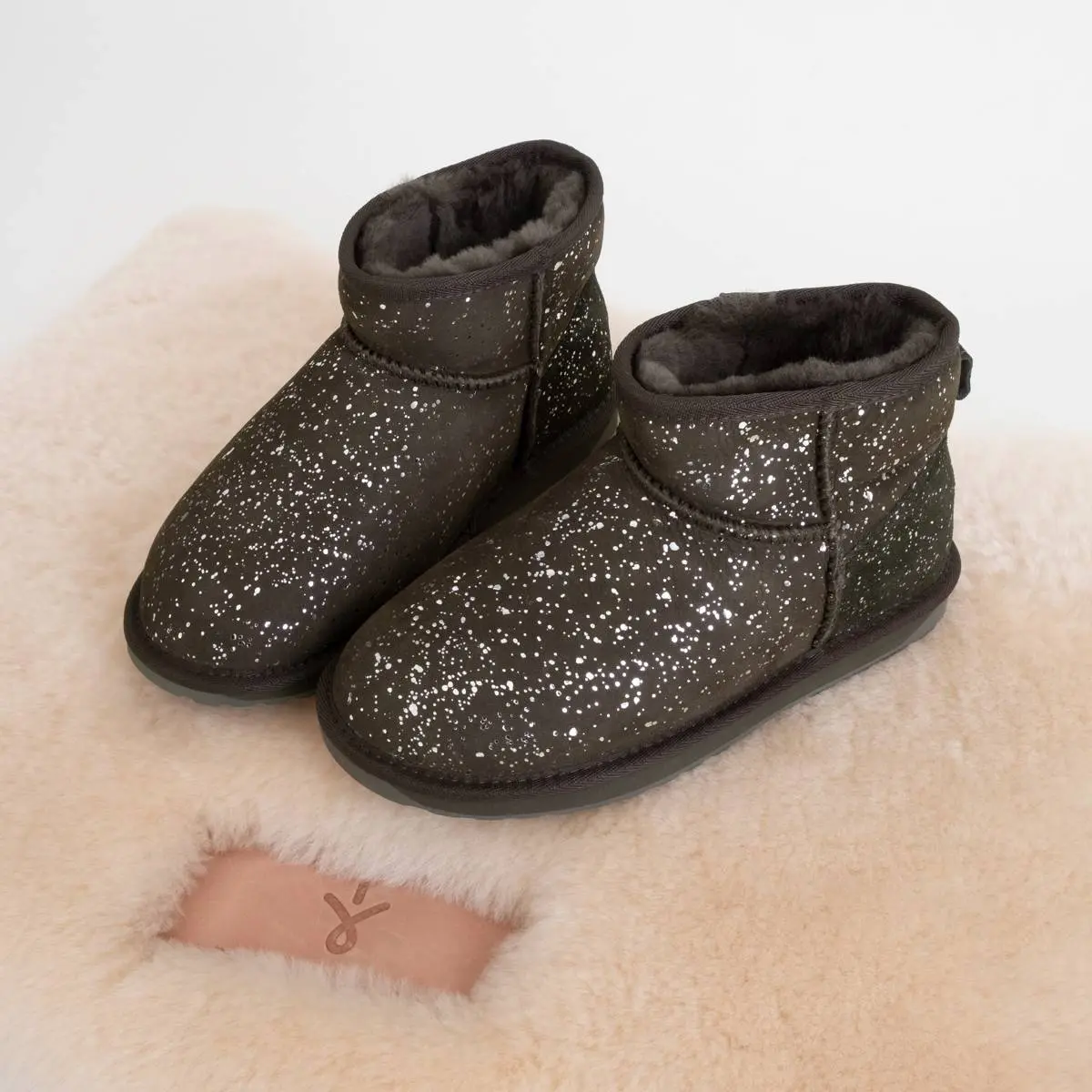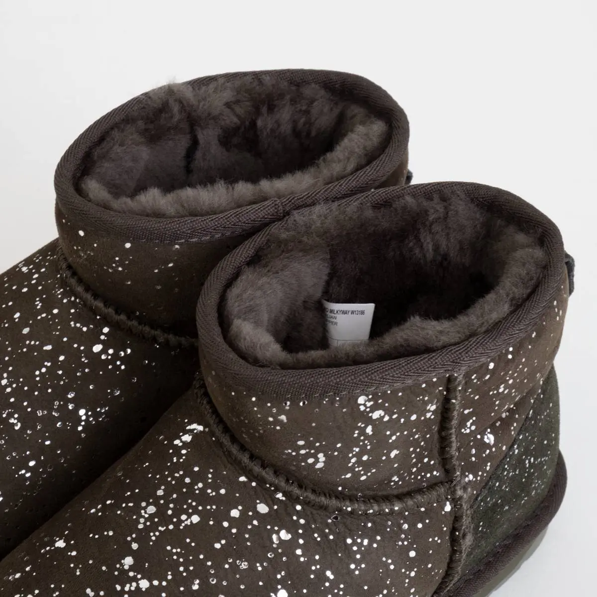 EMU Australia(エミュオーストラリア)と言えばシープスキン×ムートン。Stinger Micro MilkywayはStinger Miniから筒を少しカットした絶妙な長さの筒で、かわいらしさを印象付けるフォルムが特徴。そのフォルムにラメを散りばめた足元を華やかに魅せるスペシャルアイテムです。シープスキンは吸湿・放湿に優れているため、寒い日は温かく包み込み、暖かい日は汗などの水分を吸湿し、外に逃がす効果があり蒸れにくく快適に過ごせます。また撥水加工が施されているので、汚れが付きにくくお手入れが簡単です。防水加工ではございませんので万が一、雨など水に濡れた際はお早めに乾いたタオル等で拭き取り、陰干し等で乾かしてください。オーストラリア製。