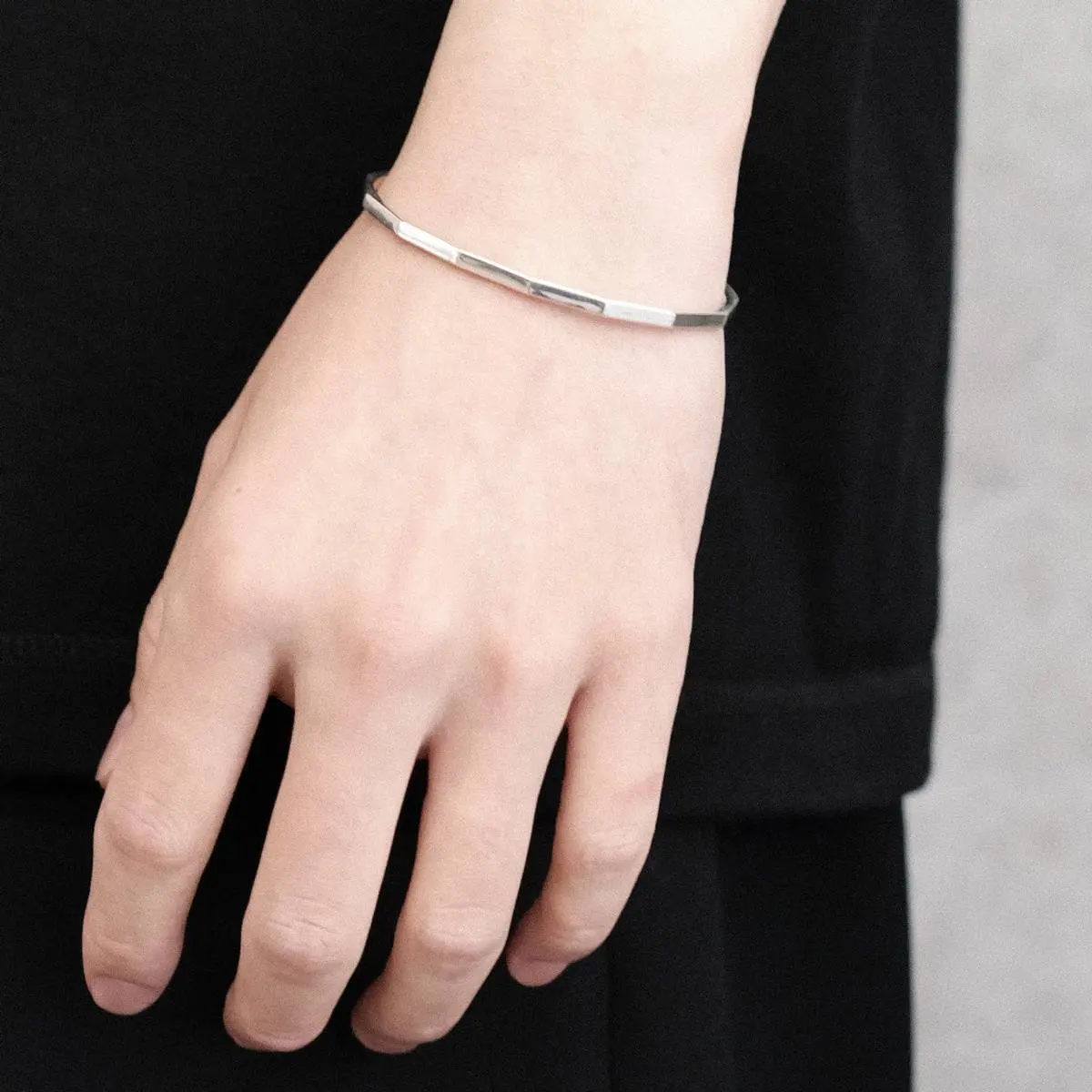 エッジデザインのバングル。型を使用せず、全行程を国内の職人にハンドメイドでの制作を依頼したジュエリー。ナットのように角を作ったエッジデザイン。内側にJuhaの刻印。Juhaのロゴを素押ししたオリジナルのポーチが付きます。日本製。