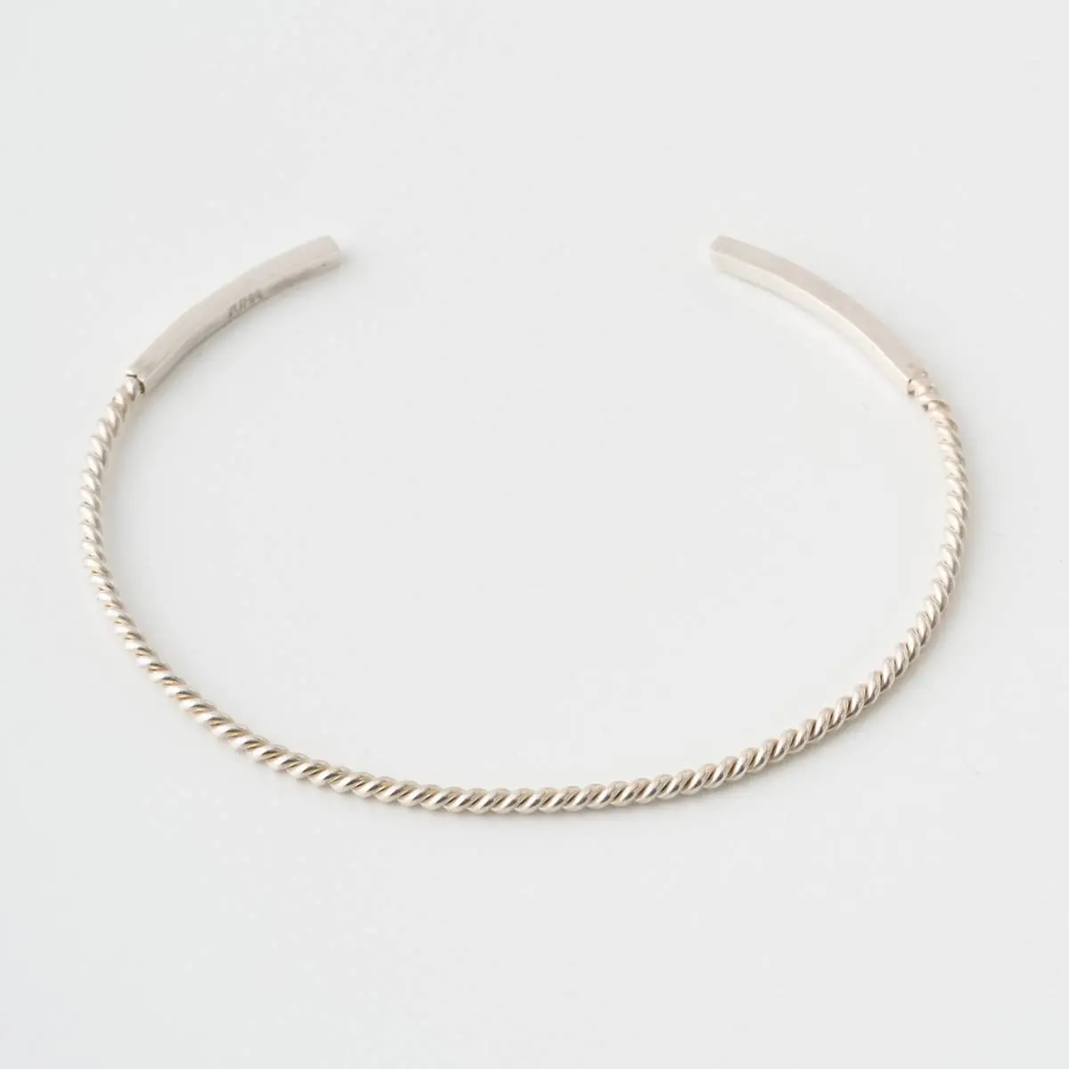ツイストデザインのバングル。型を使用せず、全行程を国内の職人にハンドメイドでの制作を依頼したジュエリー。極細の線をツイストすることで華奢なラインを表現。内側にJuhaの刻印。Juhaのロゴを素押ししたオリジナルのポーチが付きます。日本製。