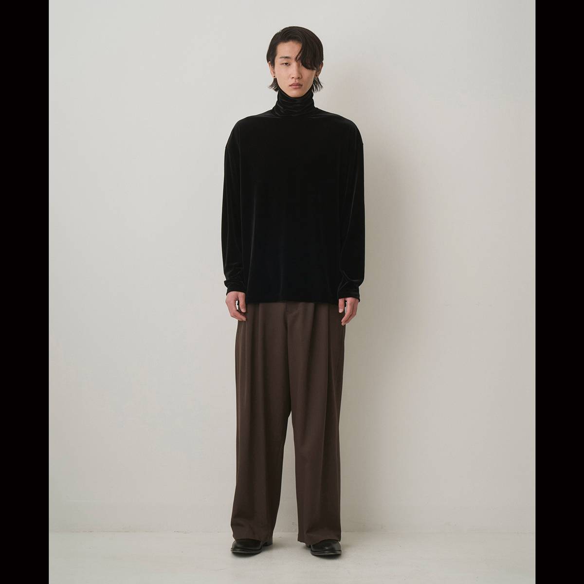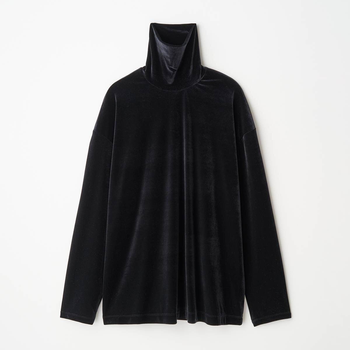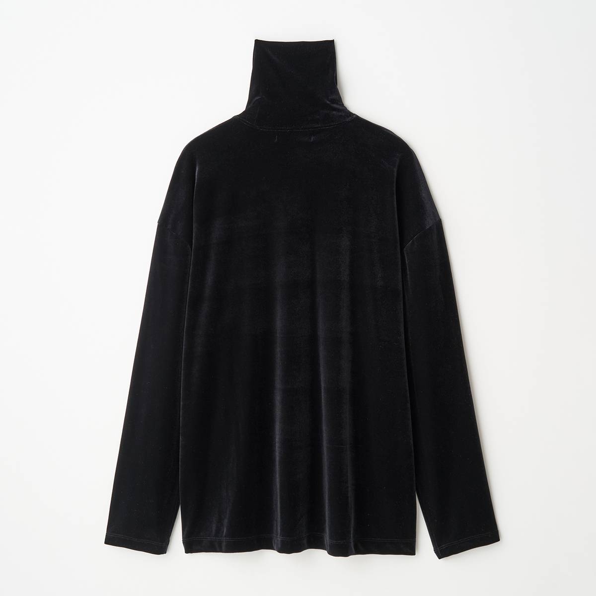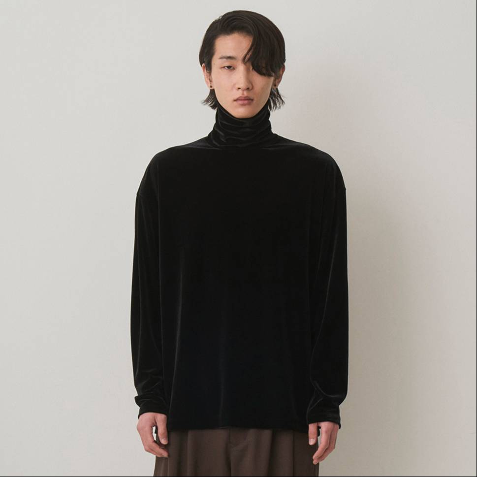 ベロアのL/Sカットソー。ネックをタイトに設定したミニマルなタートルネックデザイン。身幅とアームホールに適度なゆとりを持たせ、リラックス感のあるシルエットながらも洗練されたバランスに仕上げました。上品な光沢と繊細な毛並みを持つ丸編みベロア素材。強いキックバックによるストレッチ性があり、着心地の良い柔らかさとふくらみを両立。しなやかなドレープ感が特徴で、動きに合わせて流れるような表情を生み出します。日本製。
