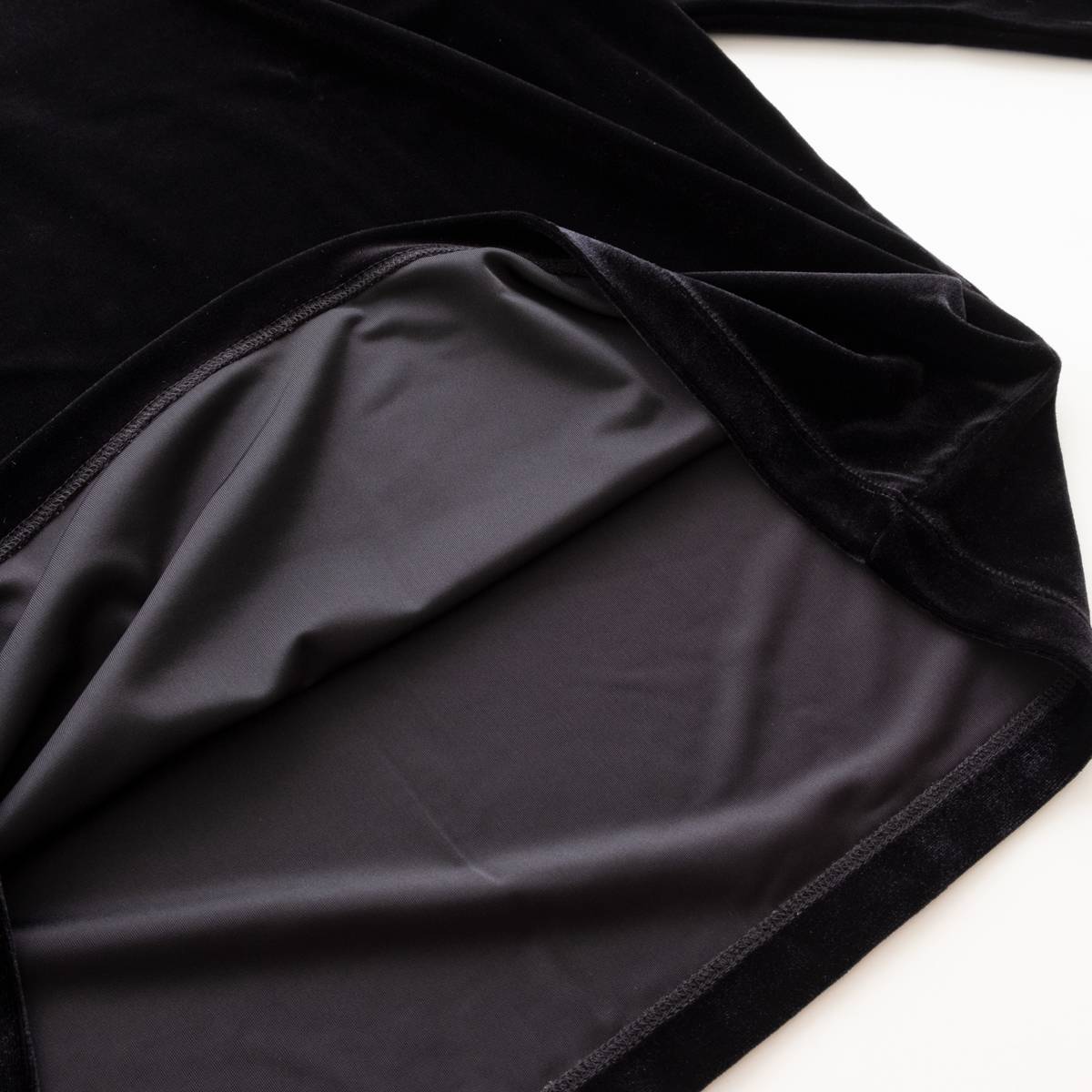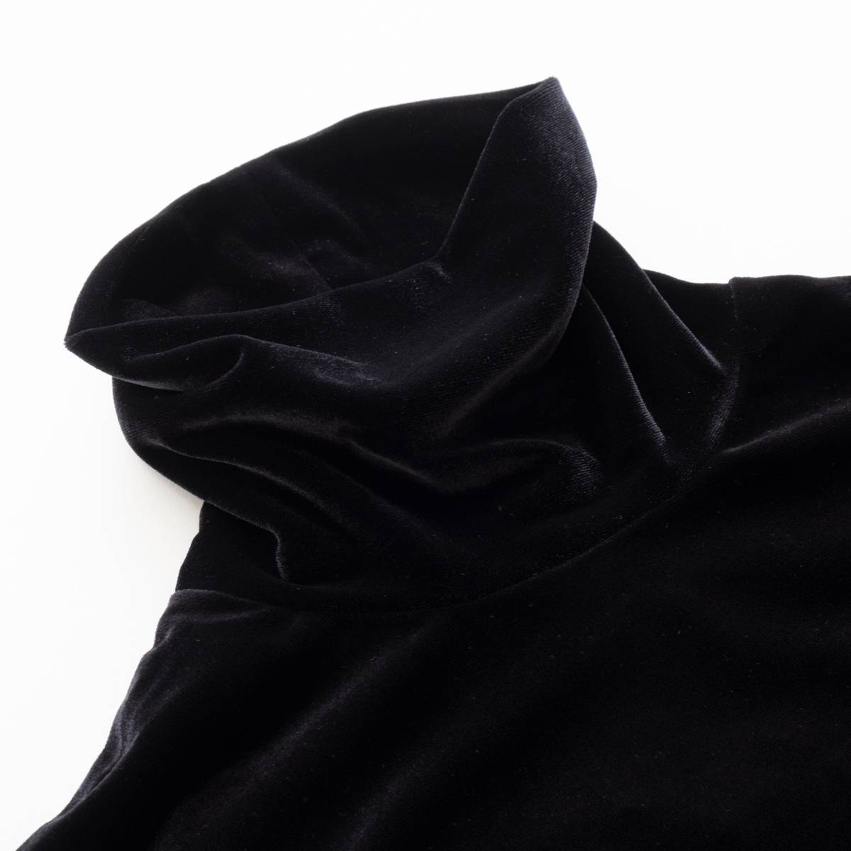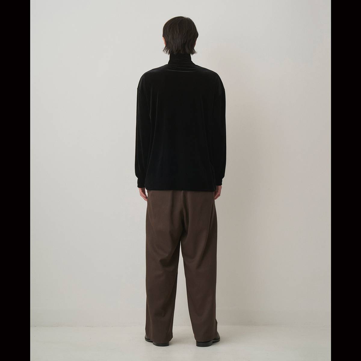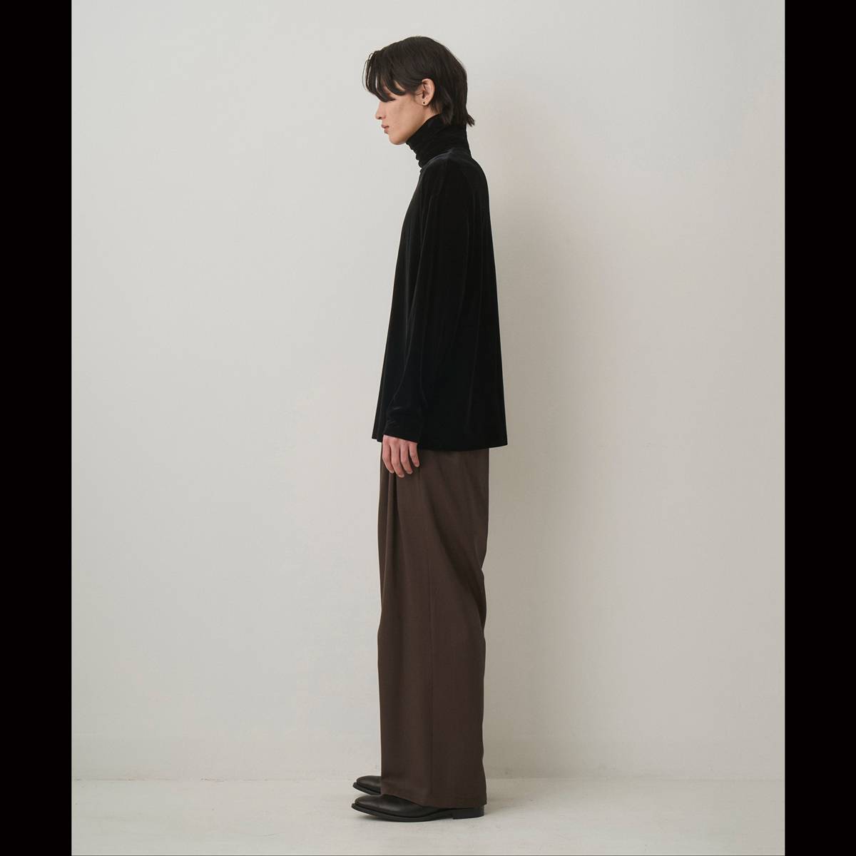 ベロアのL/Sカットソー。ネックをタイトに設定したミニマルなタートルネックデザイン。身幅とアームホールに適度なゆとりを持たせ、リラックス感のあるシルエットながらも洗練されたバランスに仕上げました。上品な光沢と繊細な毛並みを持つ丸編みベロア素材。強いキックバックによるストレッチ性があり、着心地の良い柔らかさとふくらみを両立。しなやかなドレープ感が特徴で、動きに合わせて流れるような表情を生み出します。日本製。