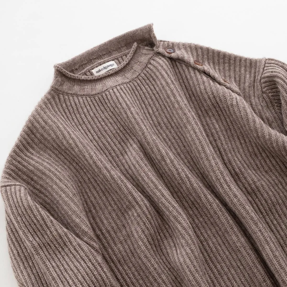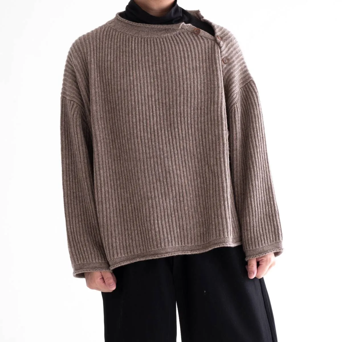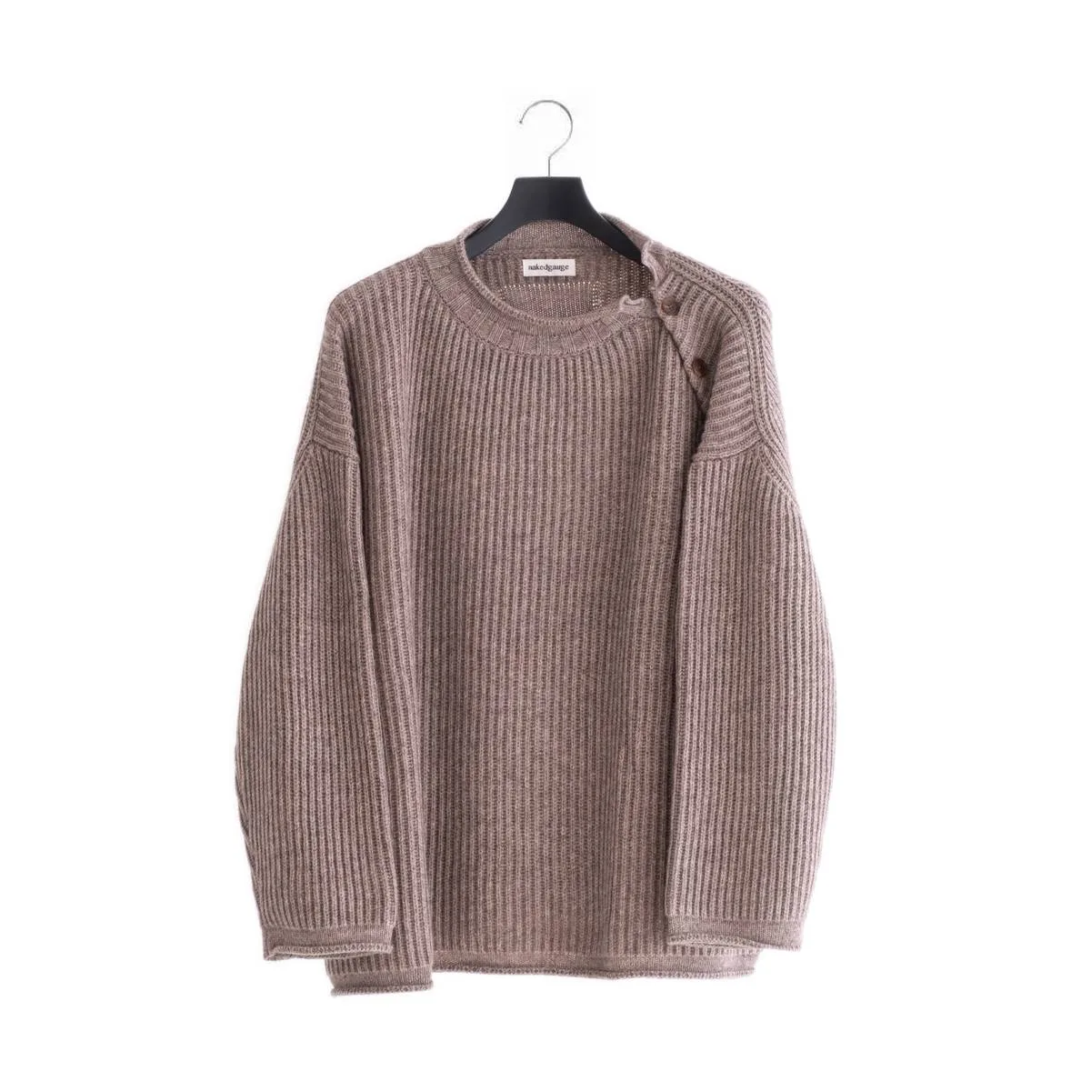 nakedgauge(ネイキッドゲージ)が得意とするニットアイテム。ウールの中でも特に柔らかく風合いのあるベビーウール、今では希少となっている上質素材のカシミヤ、さらに希少でカシミヤよりも暖かいヤクと、最高級の素材をふんだんに使って作られたニットプルオーバーです。シルエットはゆったりとしたルーズシルエット。左肩の釦を開閉してレイヤードで着こなすことができます。この最高品質の手触り、風合い、あたたかく優しい着心地をぜひ感じてほしい一品です。日本製。