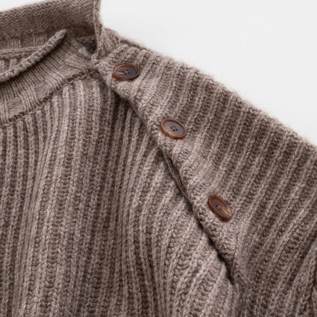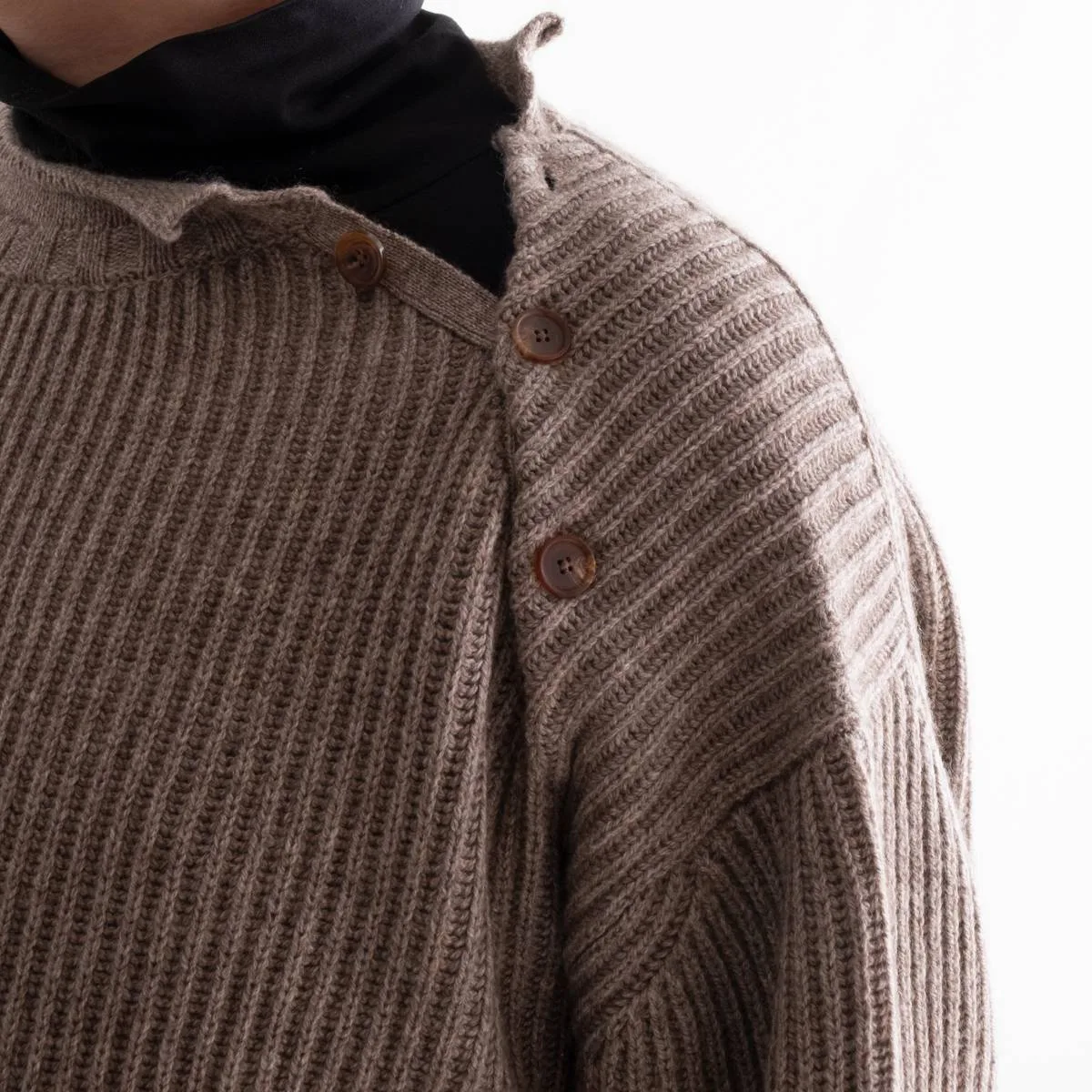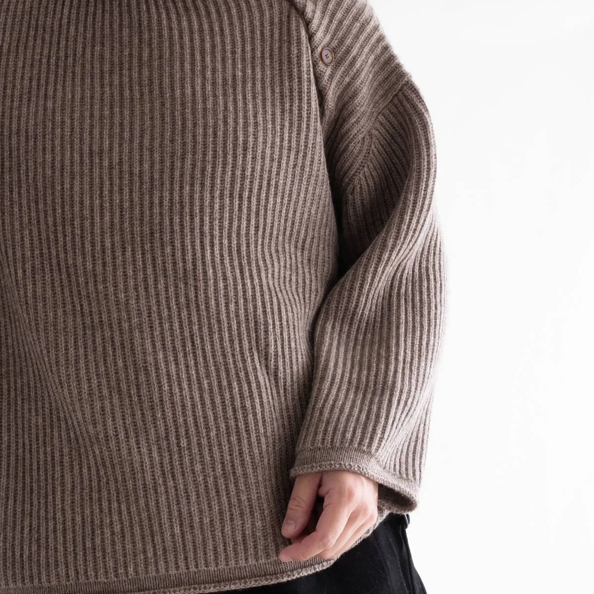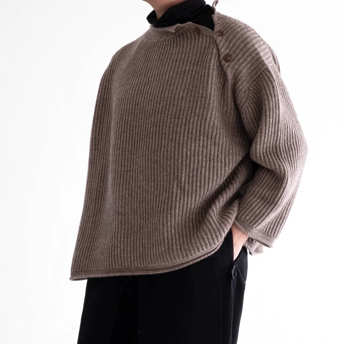 nakedgauge(ネイキッドゲージ)が得意とするニットアイテム。ウールの中でも特に柔らかく風合いのあるベビーウール、今では希少となっている上質素材のカシミヤ、さらに希少でカシミヤよりも暖かいヤクと、最高級の素材をふんだんに使って作られたニットプルオーバーです。シルエットはゆったりとしたルーズシルエット。左肩の釦を開閉してレイヤードで着こなすことができます。この最高品質の手触り、風合い、あたたかく優しい着心地をぜひ感じてほしい一品です。日本製。