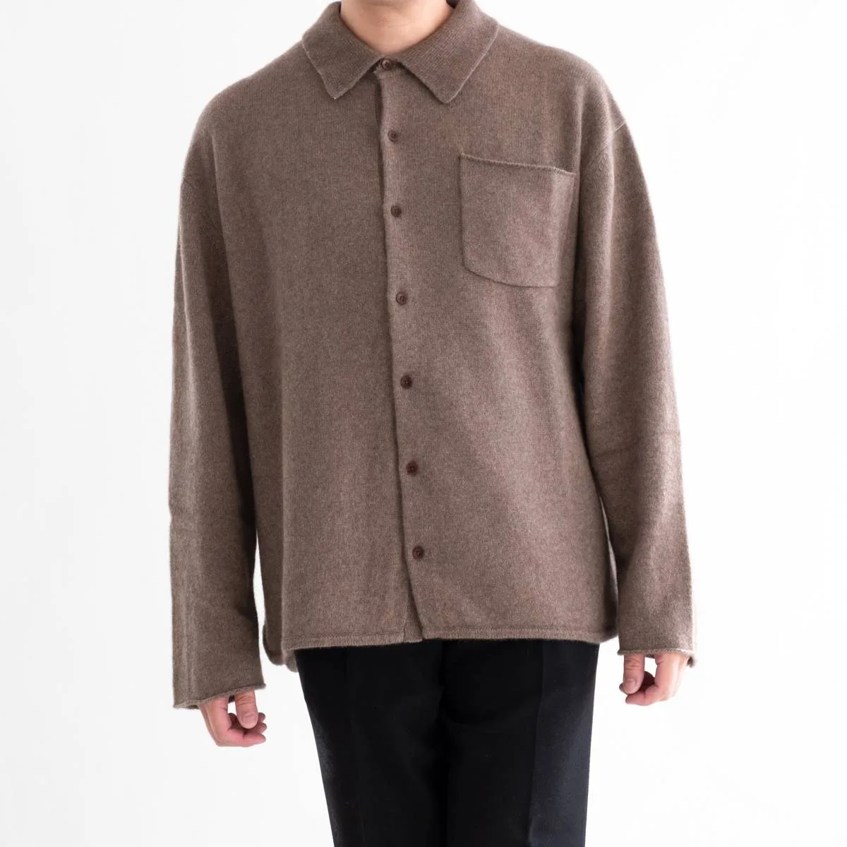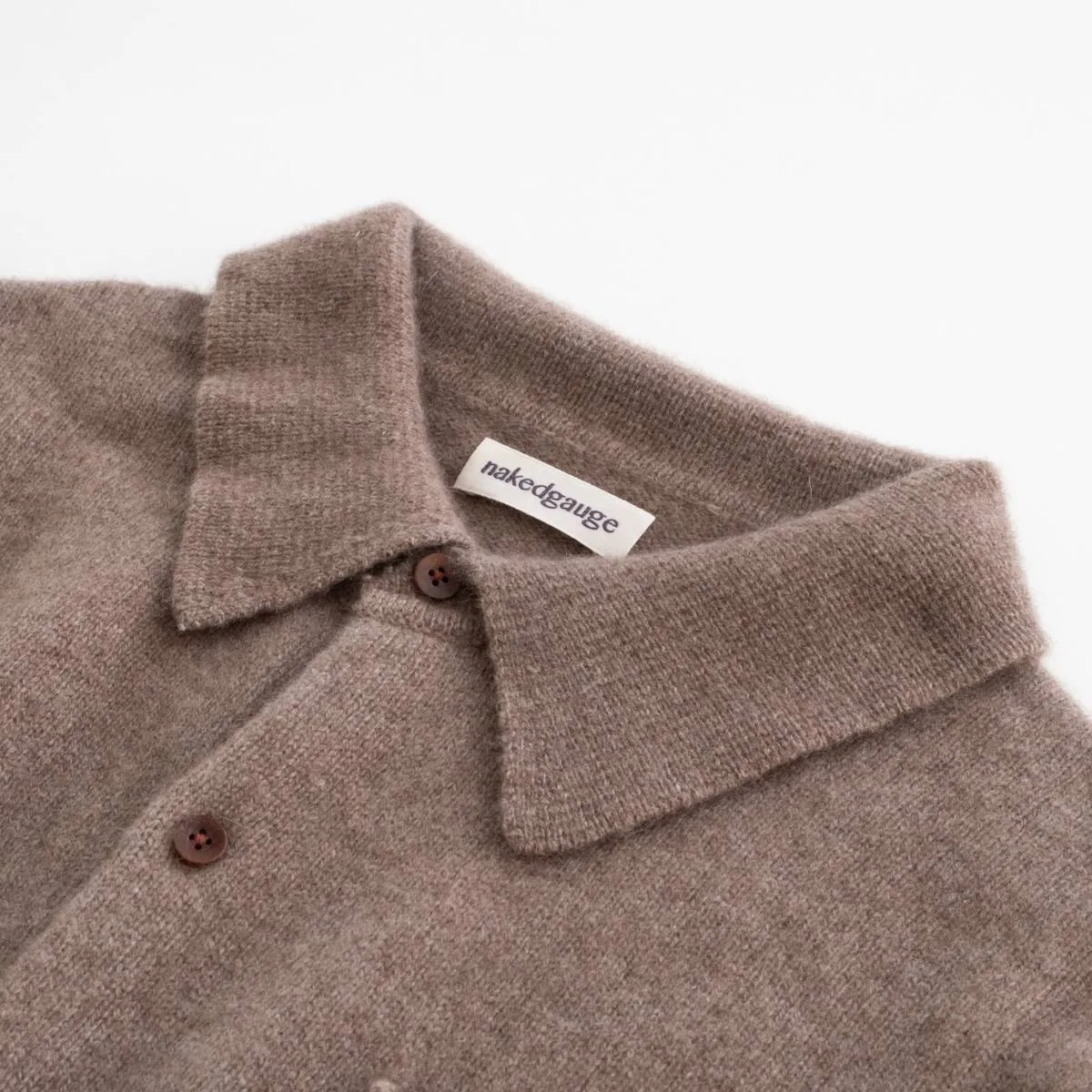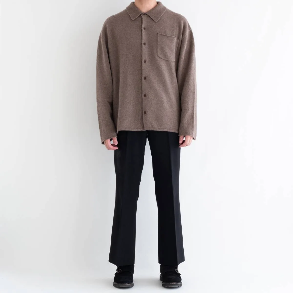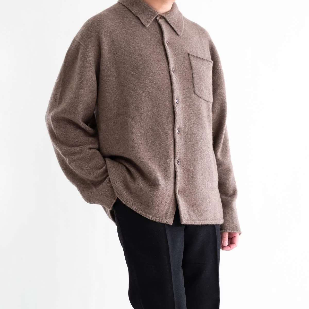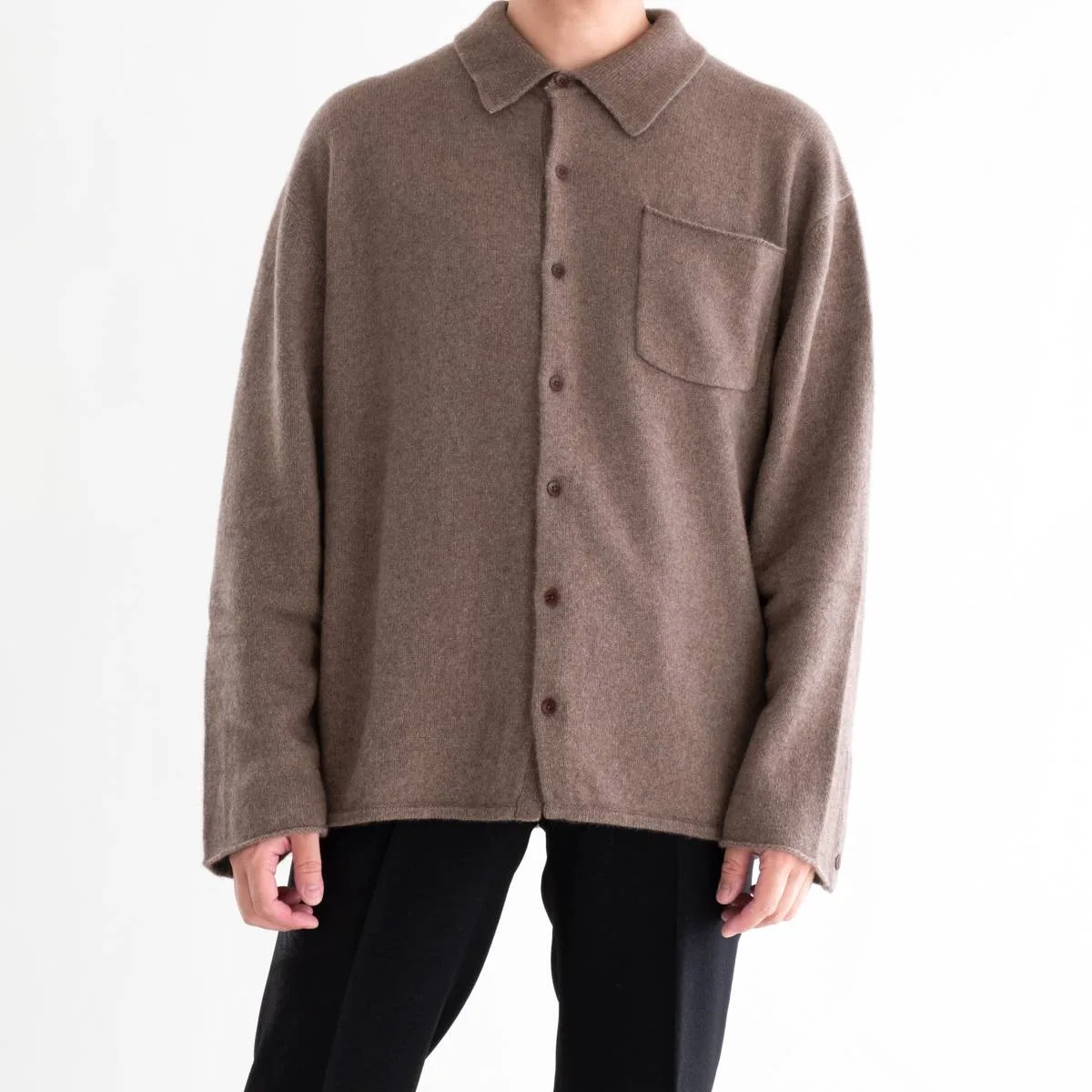 nakedgauge(ネイキッドゲージ)が得意とするニットアイテム。今では希少となっている上質素材のカシミヤと、極細で気泡の入った軽量と断熱が特徴のセーブルウールを混紡した最高級素材のニットシャツ。セーブルとはクロテンとも呼ばれるイタチ科の動物のウールです。極上の生地を贅沢に使った、ゆったりとしたシルエットのレギュラーカラーのニットシャツ。素材感と自然な色の風合いがとても上品に魅せるアイテム。日本製。