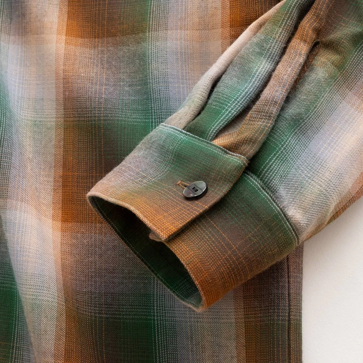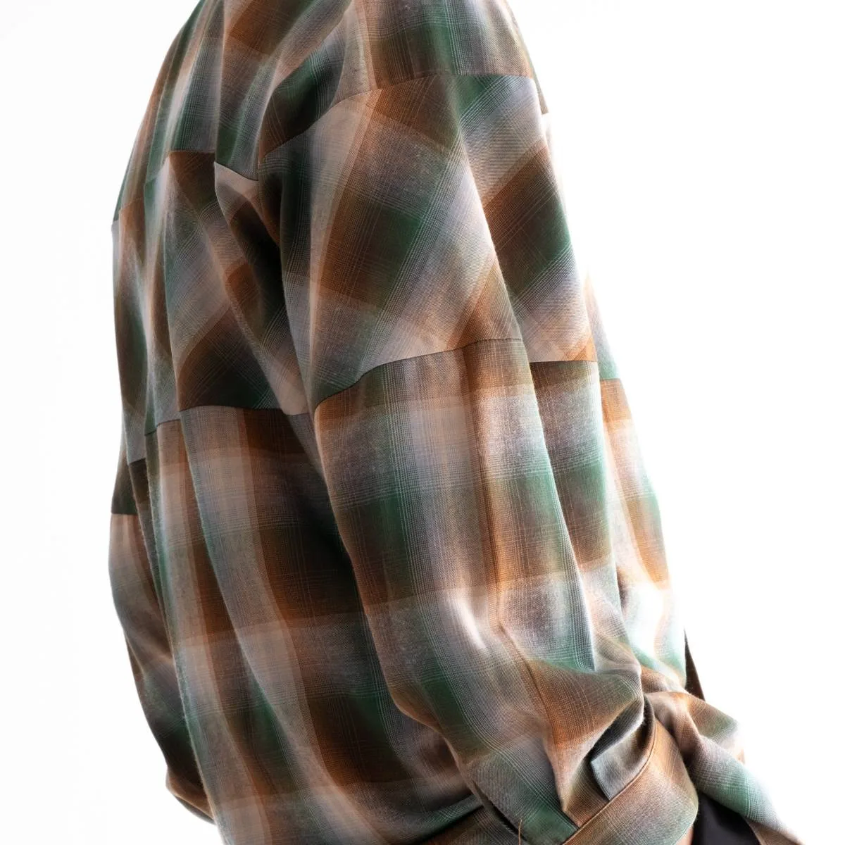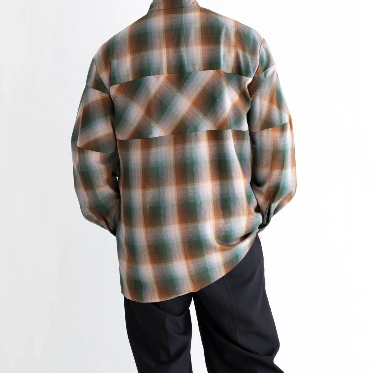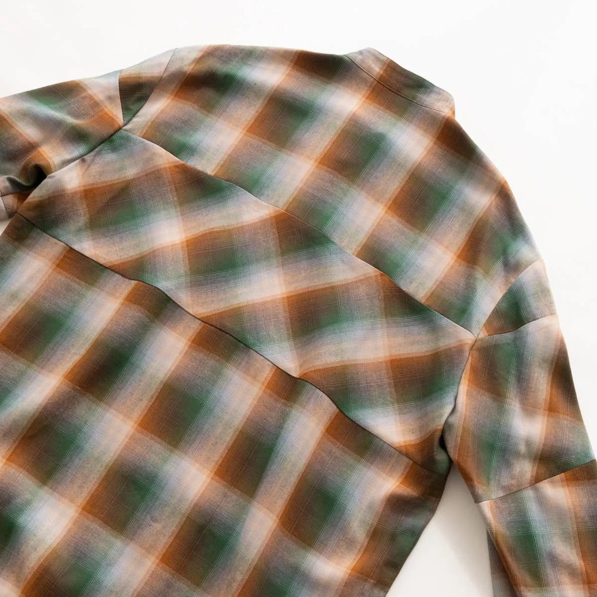 レーヨンの上品な光沢とドレープ感が美しいオンブレチェックシャツ。身頃と袖の切り替えにバイアスを使用することで、動きのあるシルエットに仕上げました。カジュアルになりすぎないモードな印象のシャツです。レーヨンならではの美しいドレープが洗練された雰囲気を演出します。手洗い可。日本製。