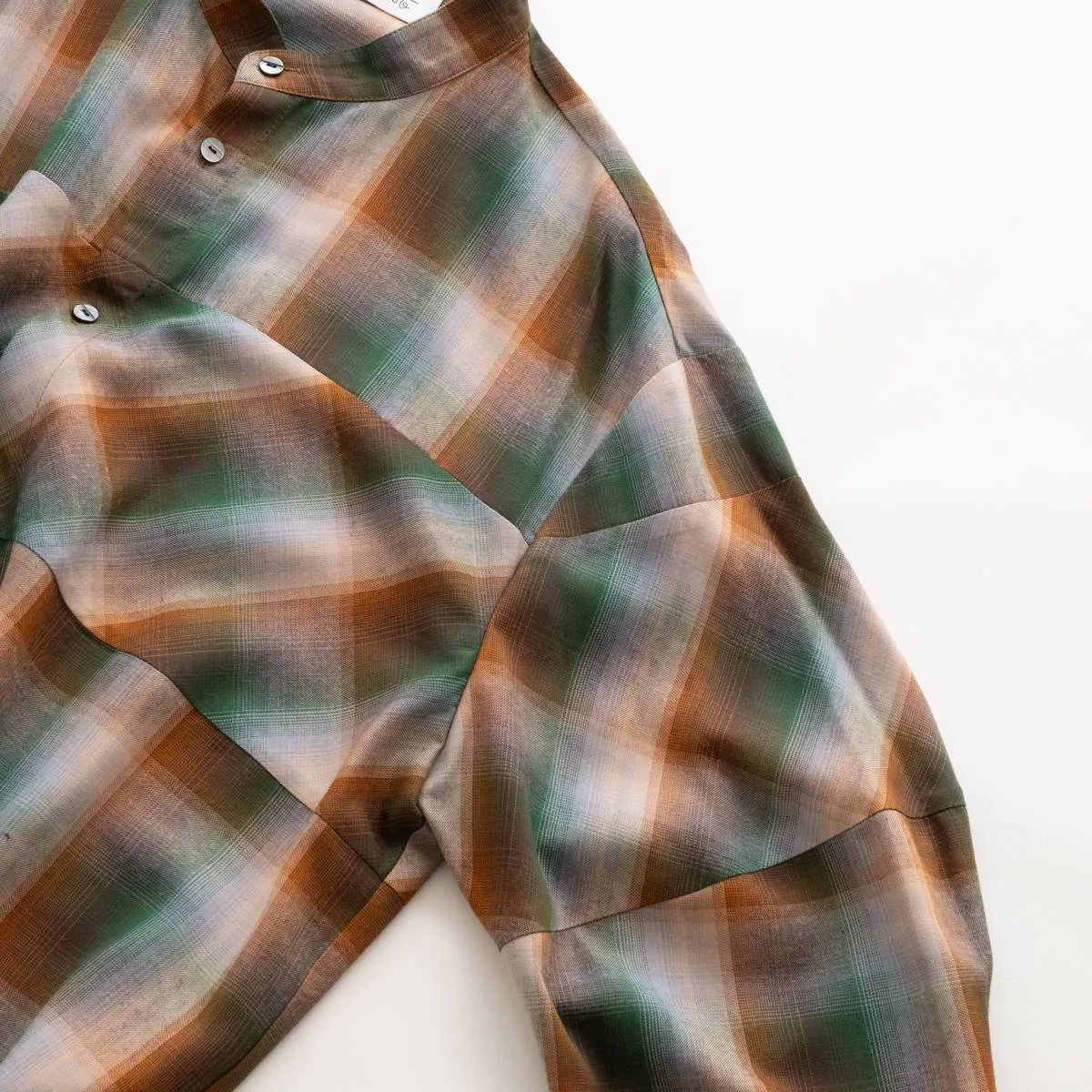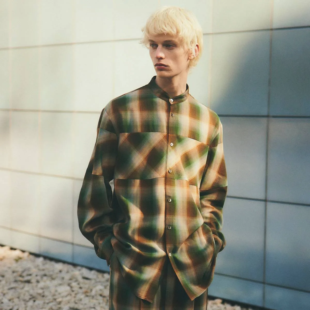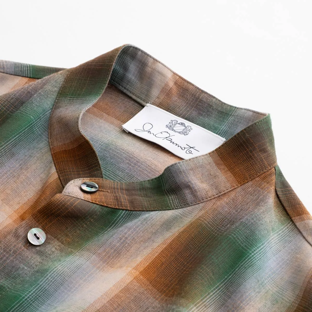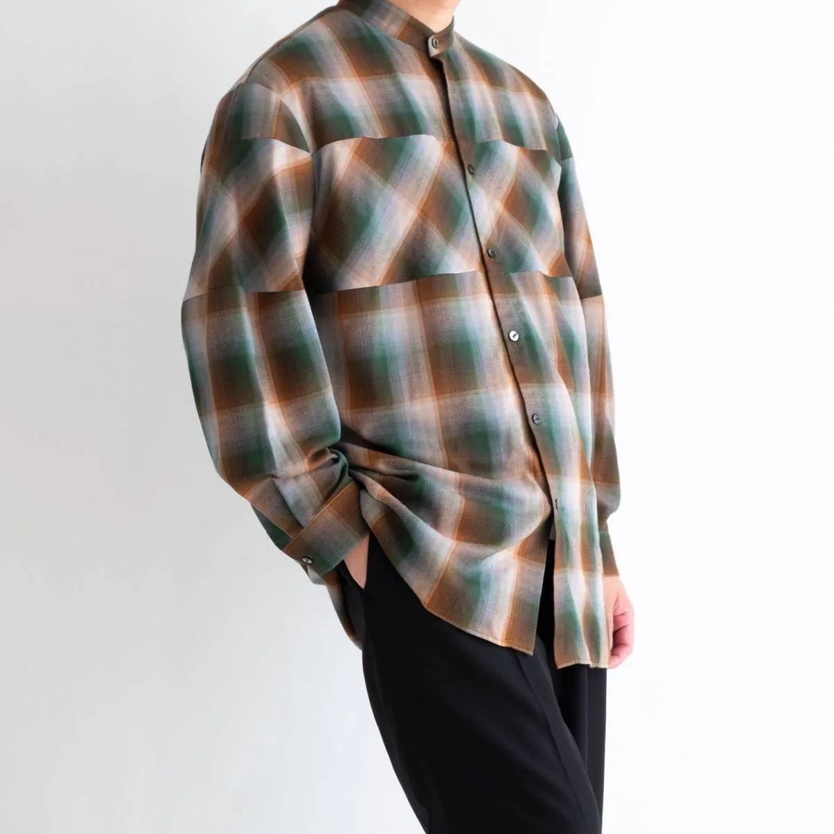 レーヨンの上品な光沢とドレープ感が美しいオンブレチェックシャツ。身頃と袖の切り替えにバイアスを使用することで、動きのあるシルエットに仕上げました。カジュアルになりすぎないモードな印象のシャツです。レーヨンならではの美しいドレープが洗練された雰囲気を演出します。手洗い可。日本製。
