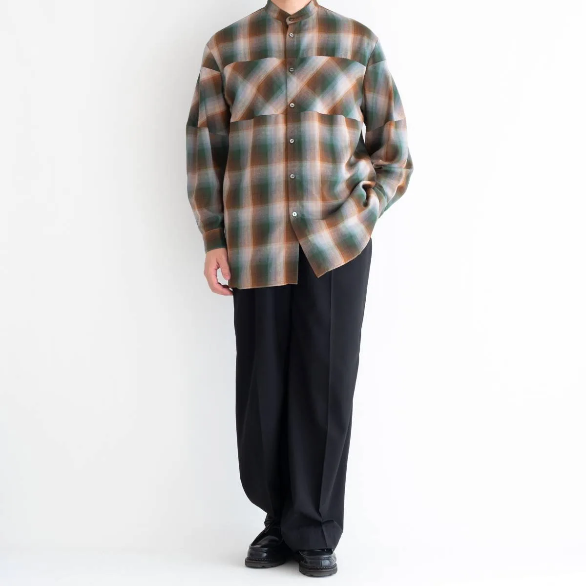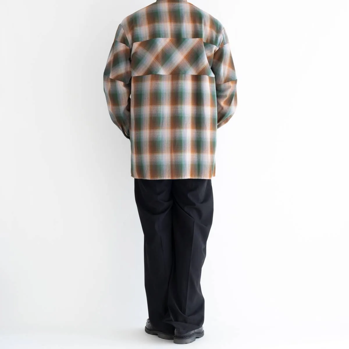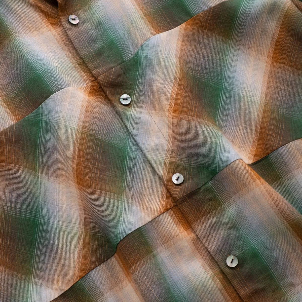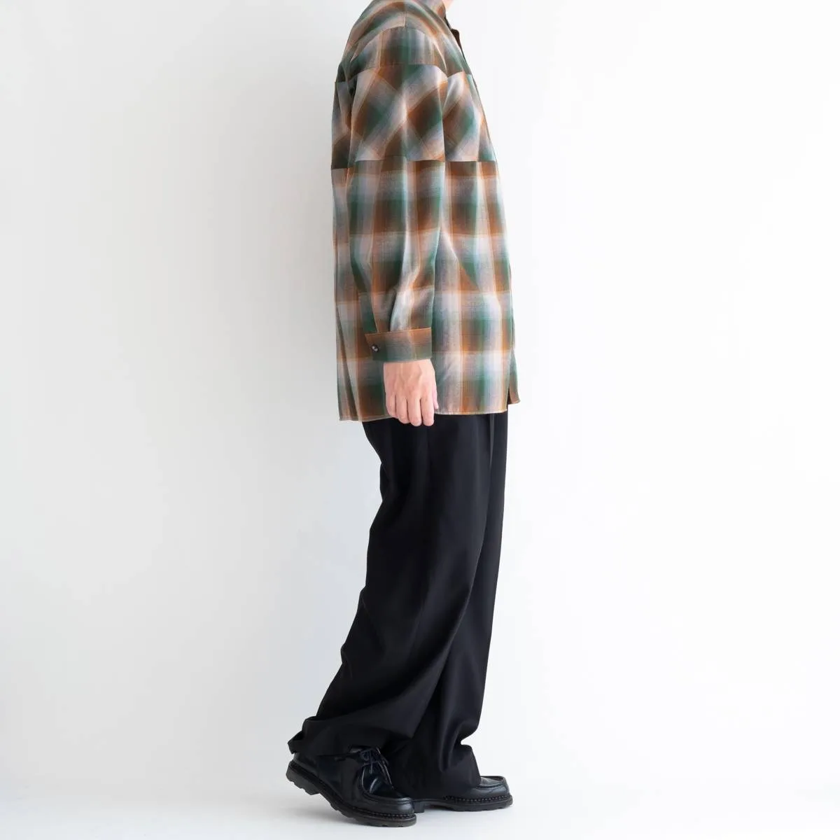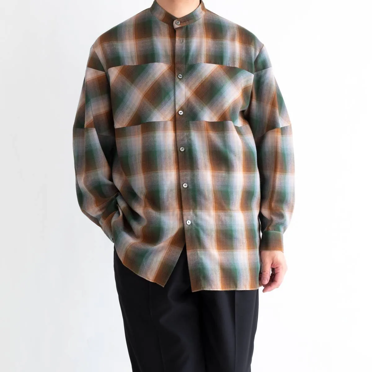 レーヨンの上品な光沢とドレープ感が美しいオンブレチェックシャツ。身頃と袖の切り替えにバイアスを使用することで、動きのあるシルエットに仕上げました。カジュアルになりすぎないモードな印象のシャツです。レーヨンならではの美しいドレープが洗練された雰囲気を演出します。手洗い可。日本製。