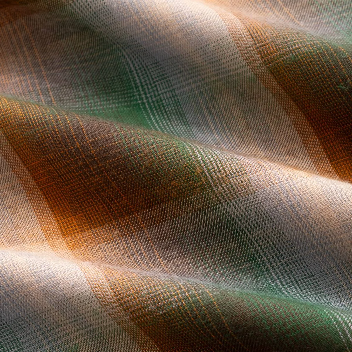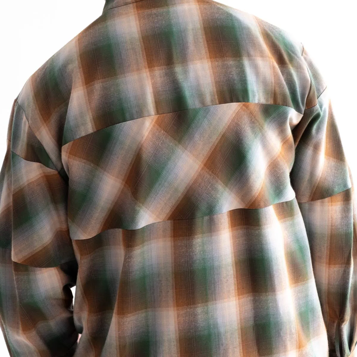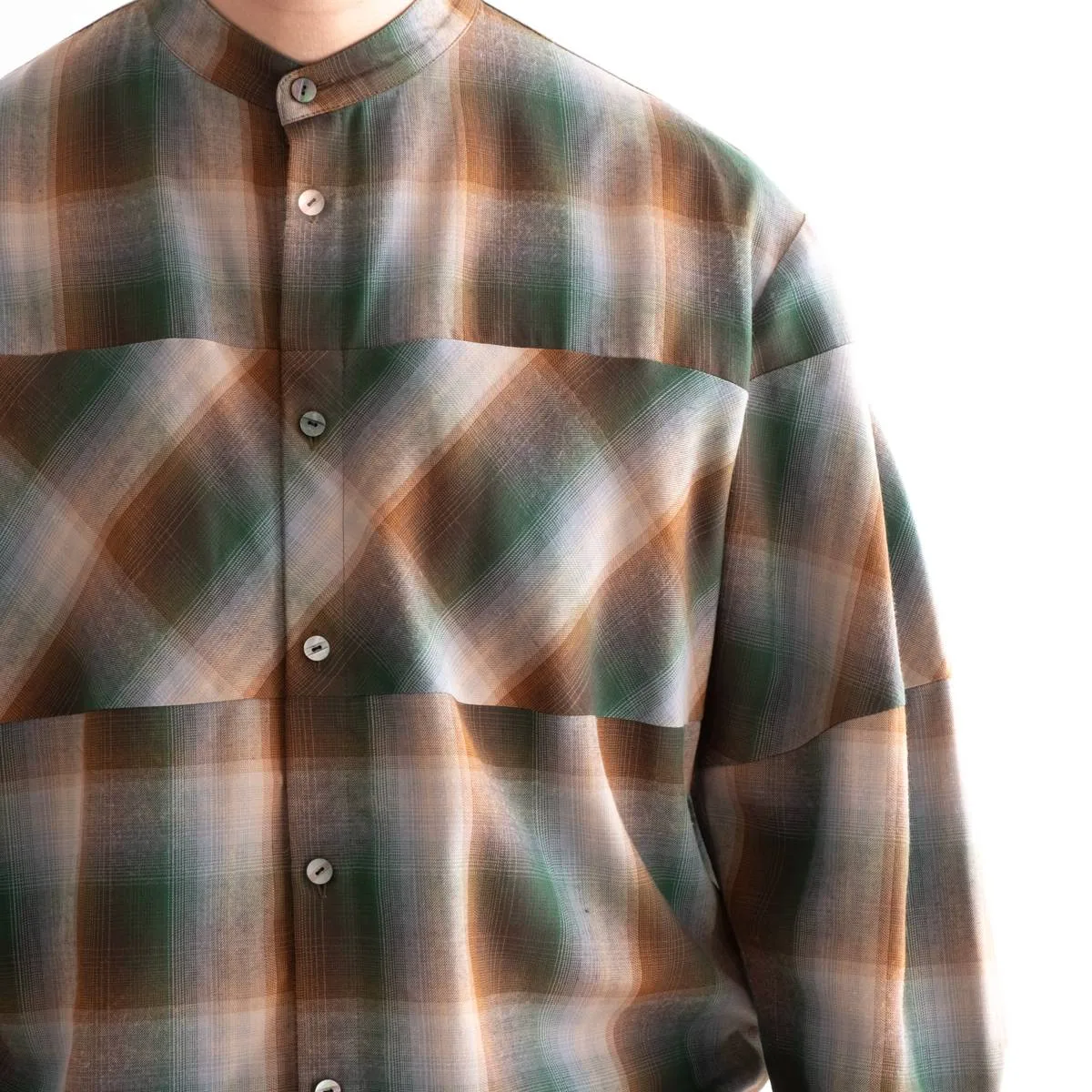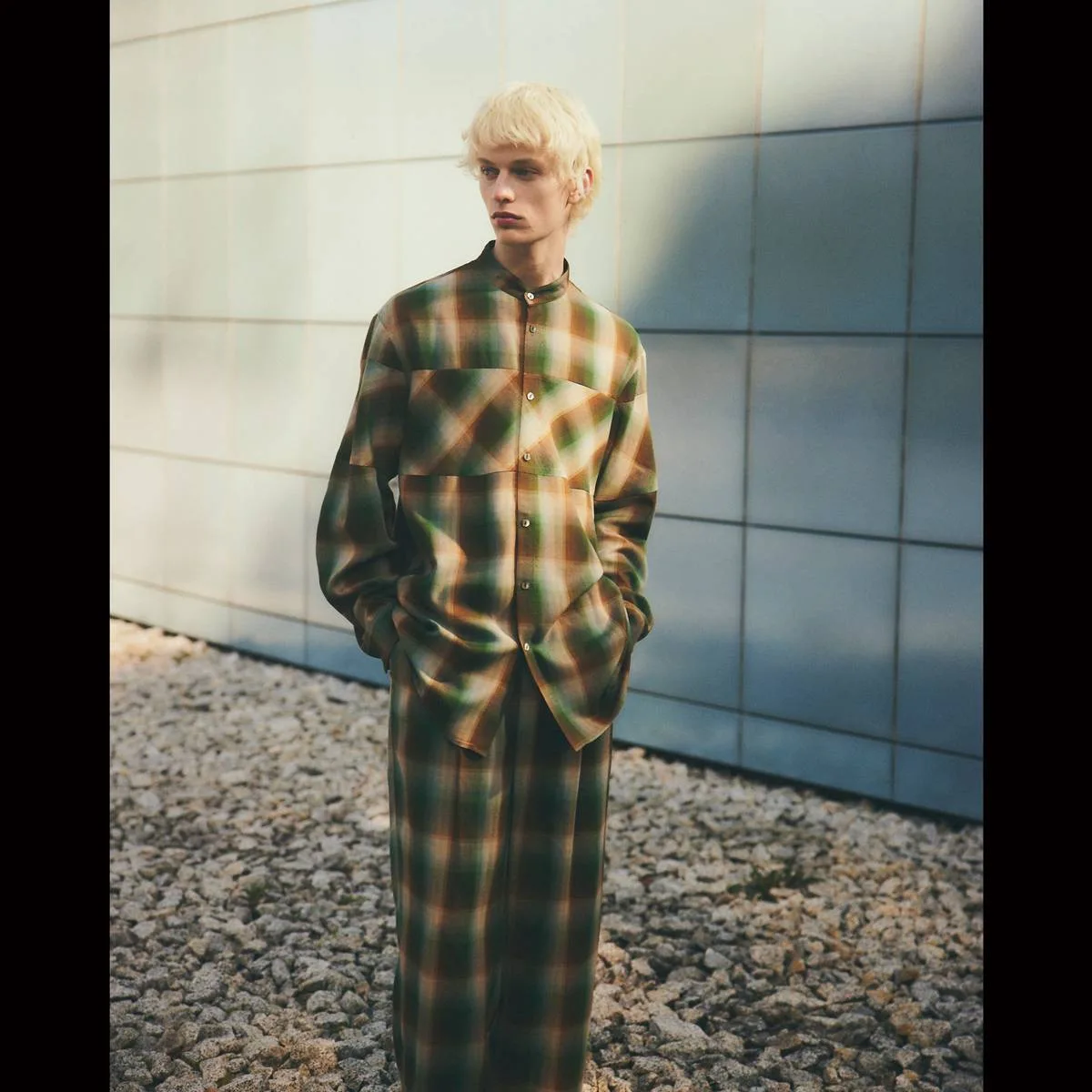 レーヨンの上品な光沢とドレープ感が美しいオンブレチェックシャツ。身頃と袖の切り替えにバイアスを使用することで、動きのあるシルエットに仕上げました。カジュアルになりすぎないモードな印象のシャツです。レーヨンならではの美しいドレープが洗練された雰囲気を演出します。手洗い可。日本製。