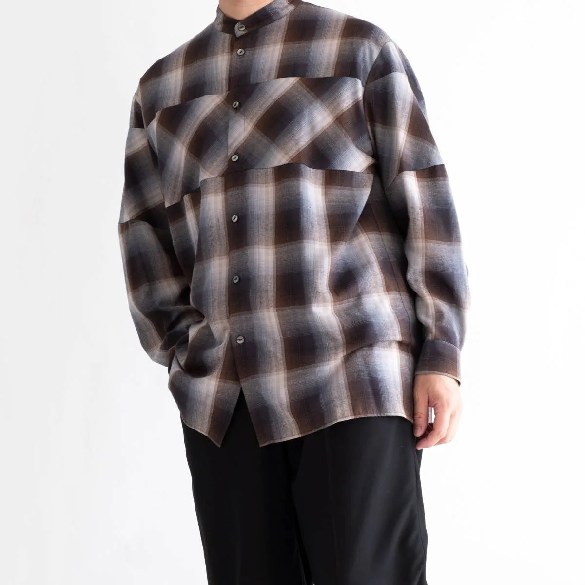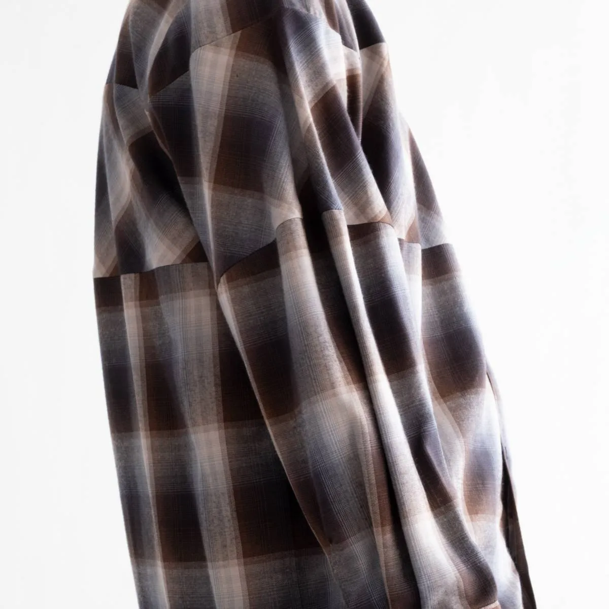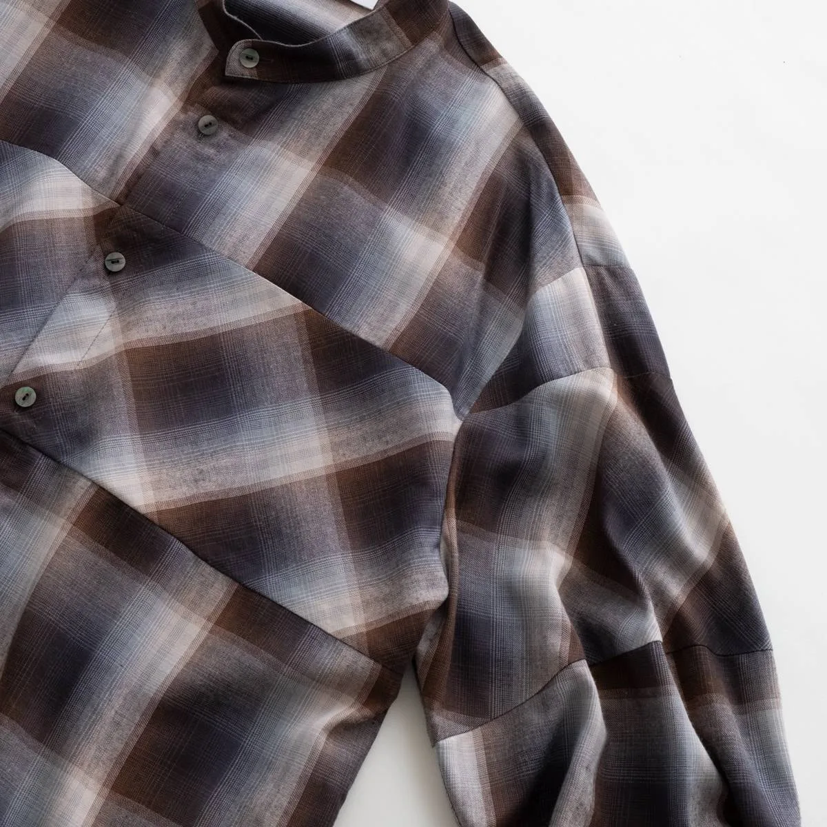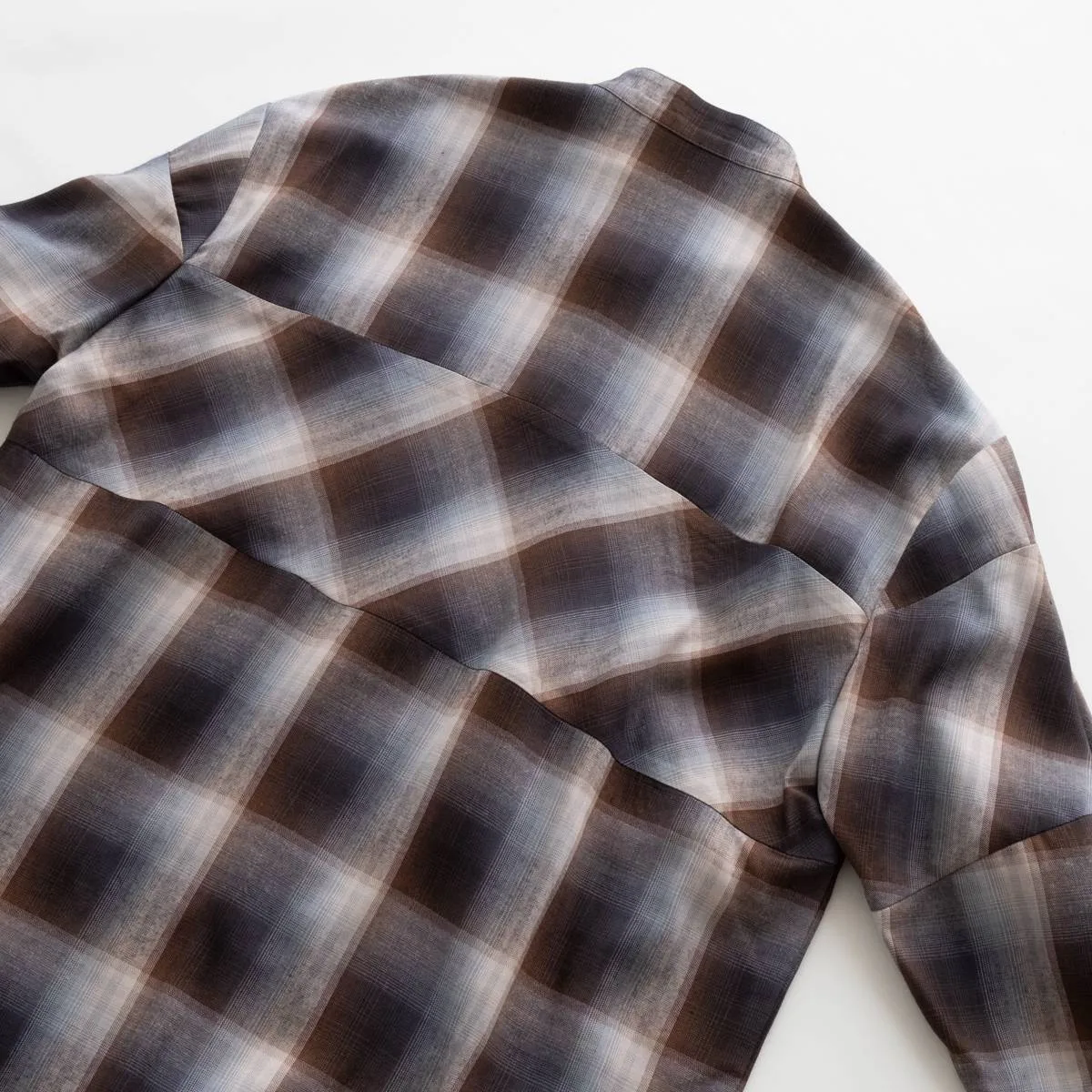 レーヨンの上品な光沢とドレープ感が美しいオンブレチェックシャツ。身頃と袖の切り替えにバイアスを使用することで、動きのあるシルエットに仕上げました。カジュアルになりすぎないモードな印象のシャツです。レーヨンならではの美しいドレープが洗練された雰囲気を演出します。手洗い可。日本製。
