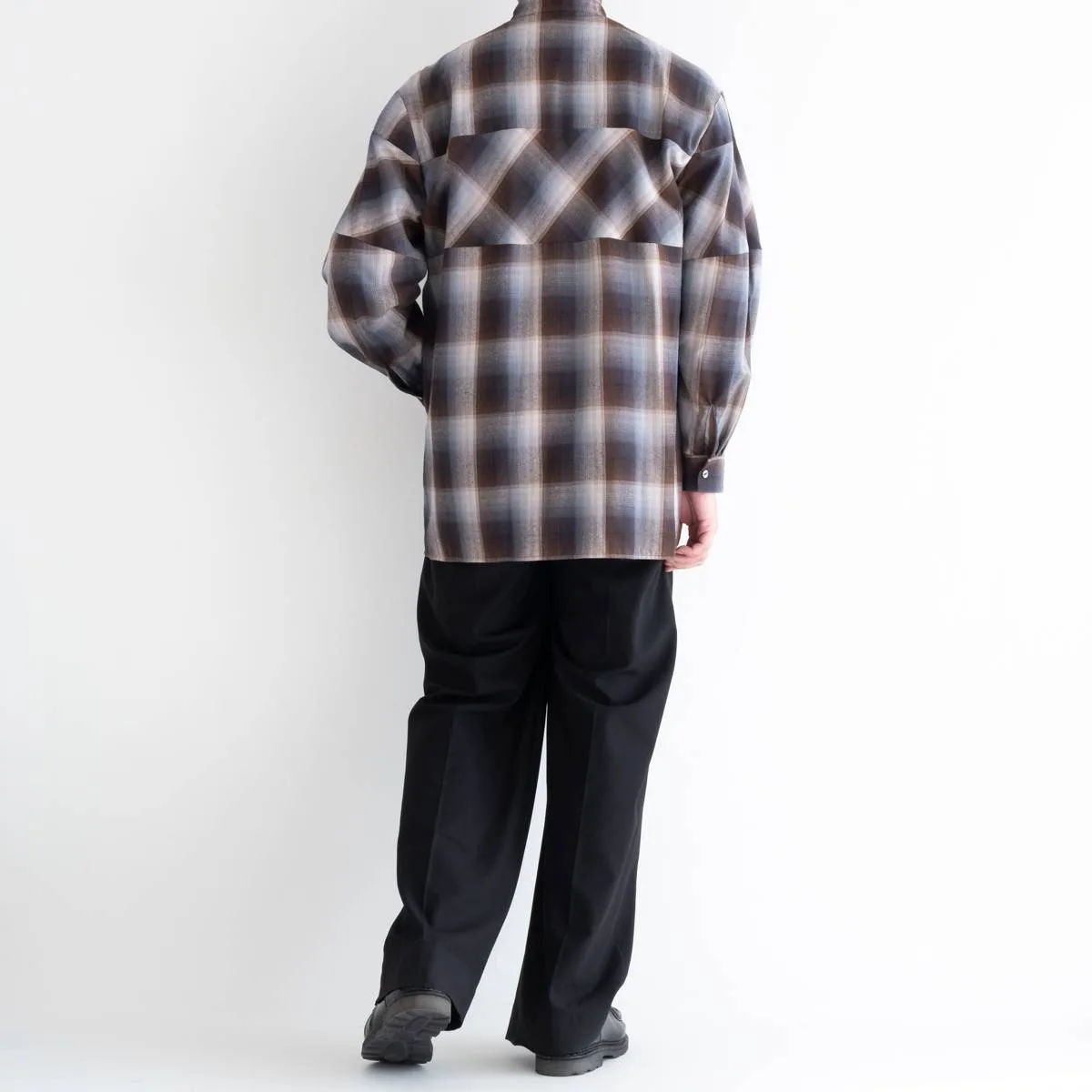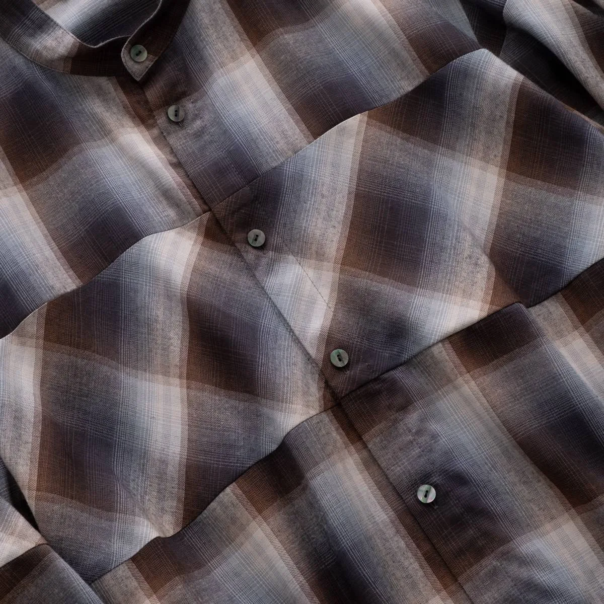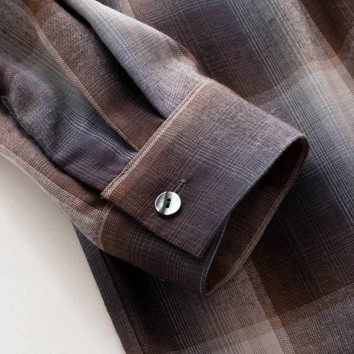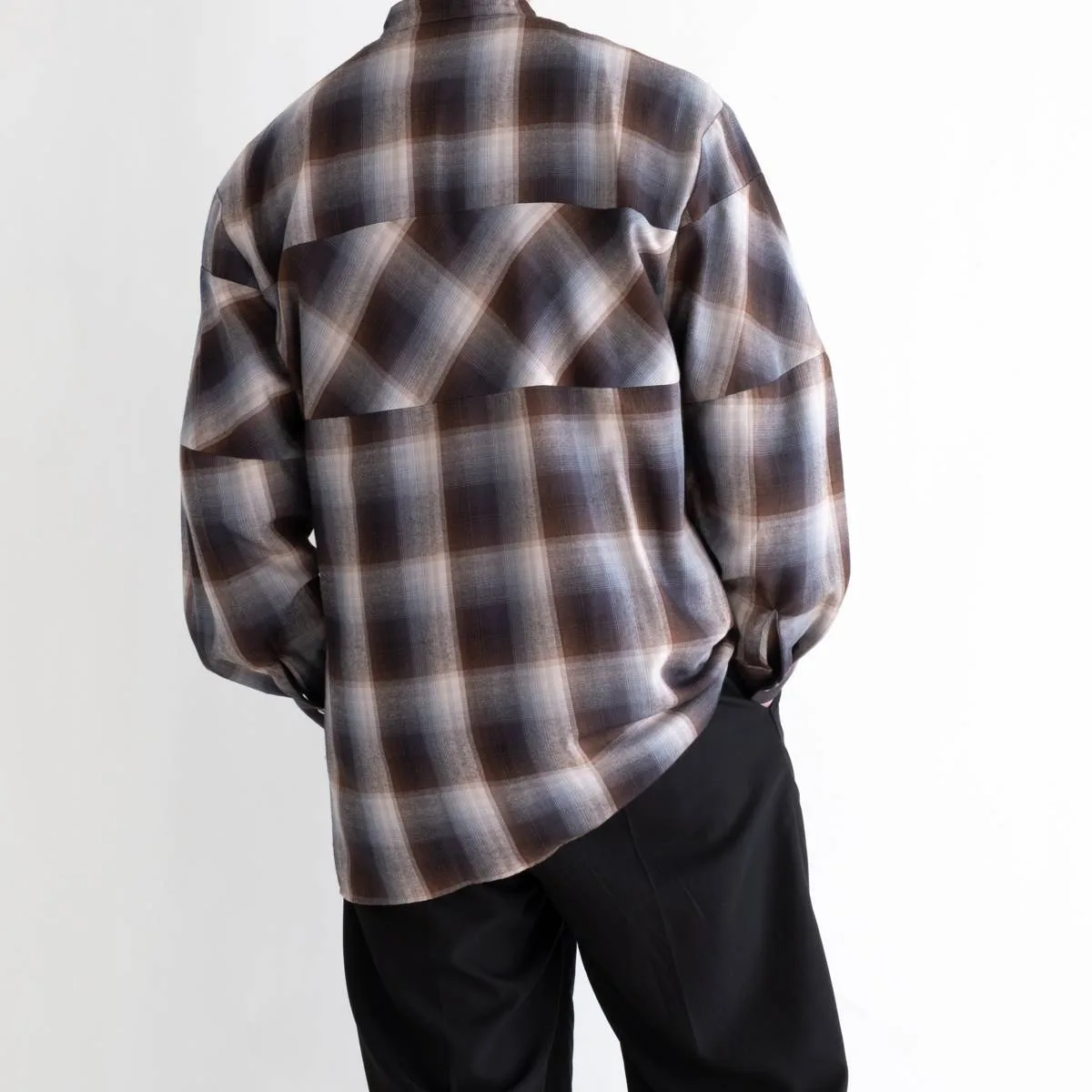 レーヨンの上品な光沢とドレープ感が美しいオンブレチェックシャツ。身頃と袖の切り替えにバイアスを使用することで、動きのあるシルエットに仕上げました。カジュアルになりすぎないモードな印象のシャツです。レーヨンならではの美しいドレープが洗練された雰囲気を演出します。手洗い可。日本製。