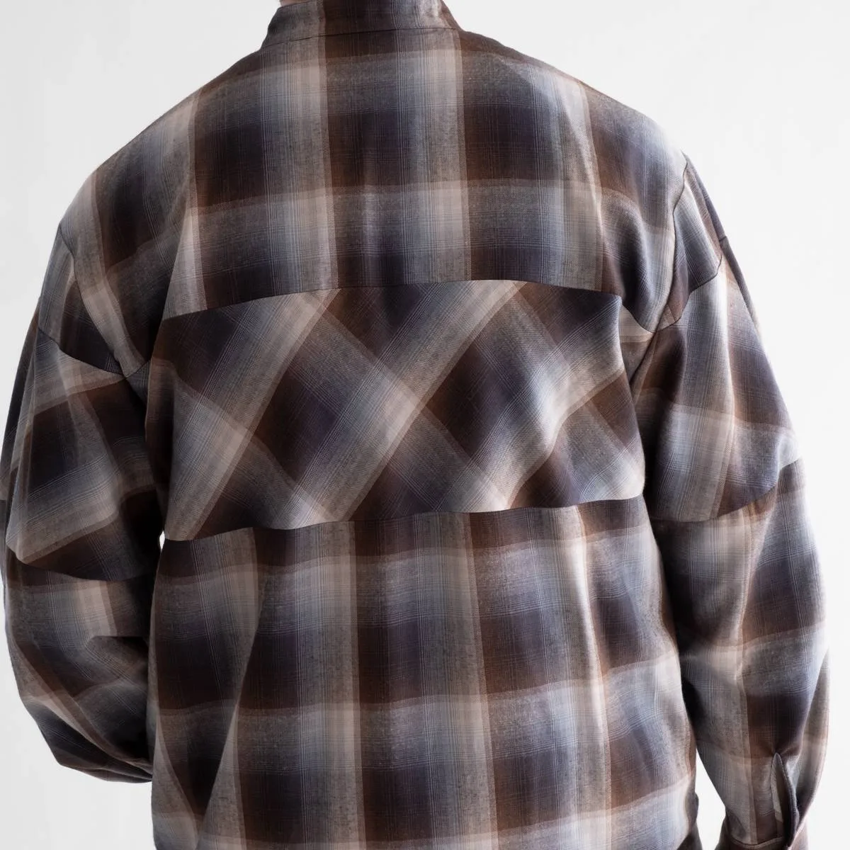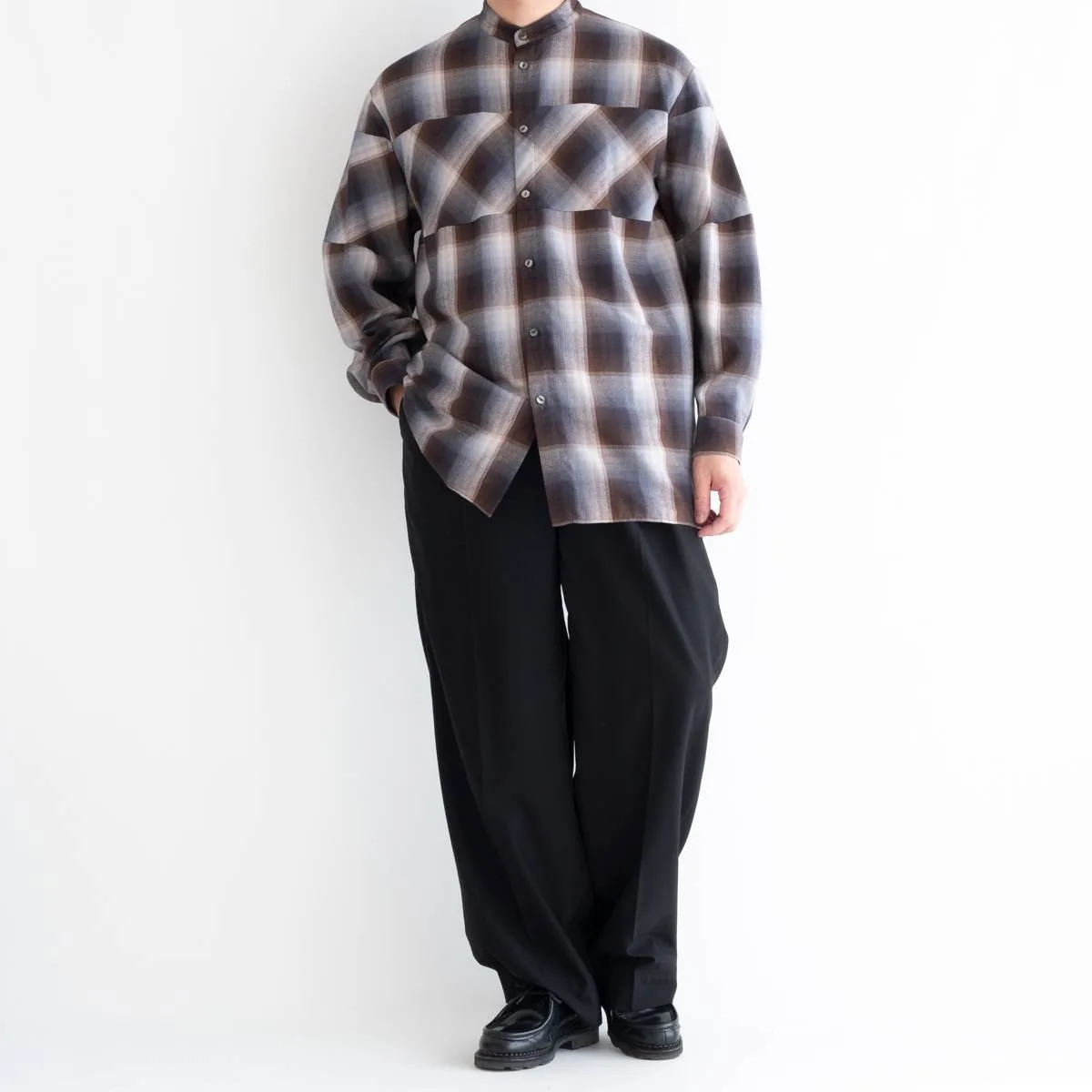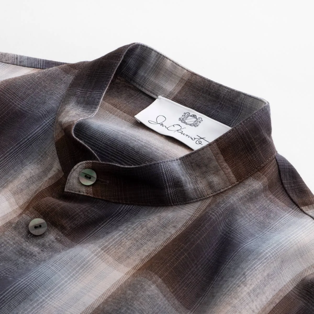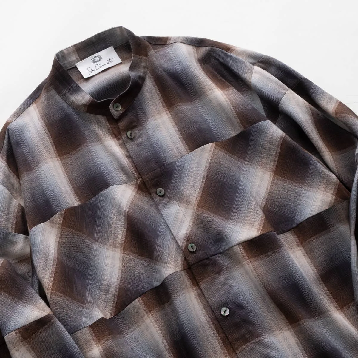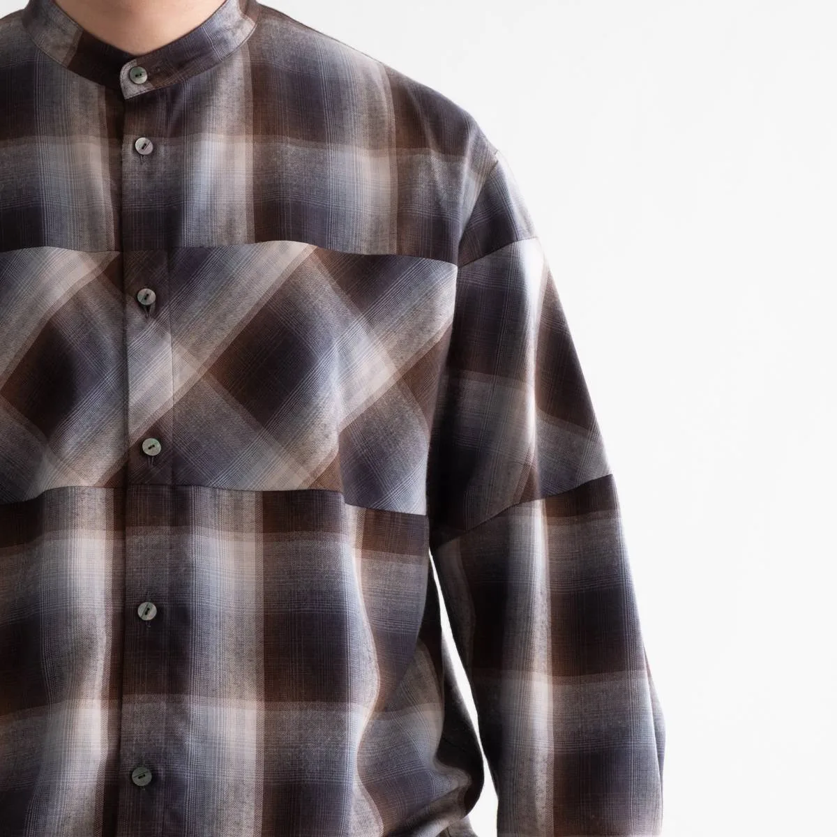 レーヨンの上品な光沢とドレープ感が美しいオンブレチェックシャツ。身頃と袖の切り替えにバイアスを使用することで、動きのあるシルエットに仕上げました。カジュアルになりすぎないモードな印象のシャツです。レーヨンならではの美しいドレープが洗練された雰囲気を演出します。手洗い可。日本製。