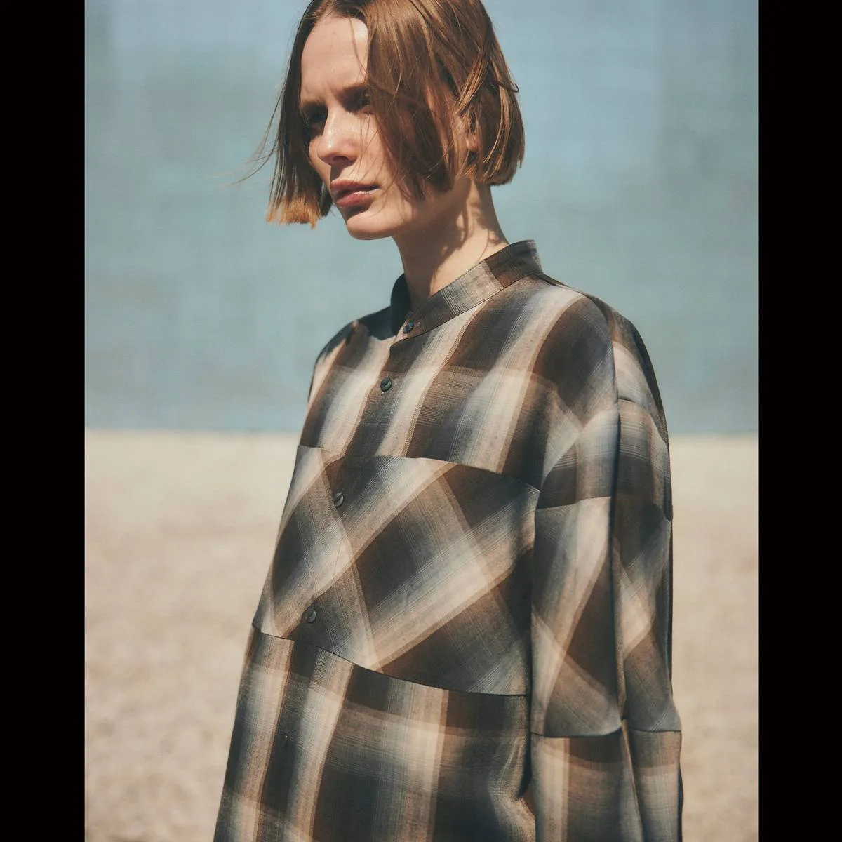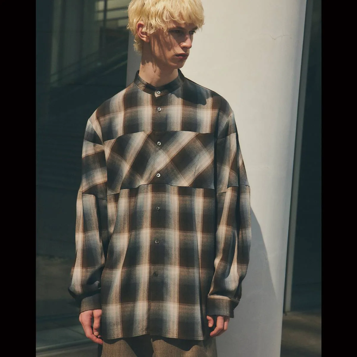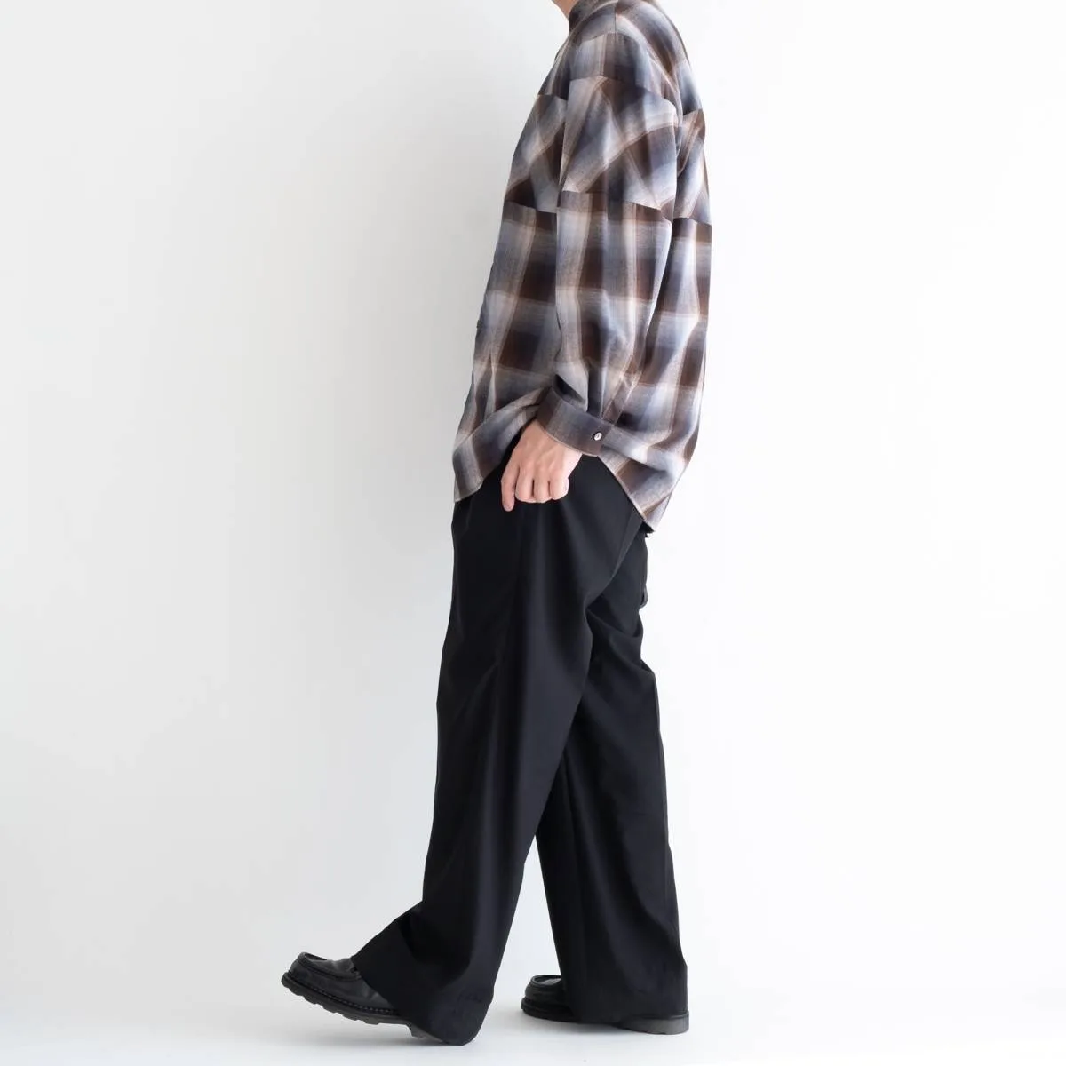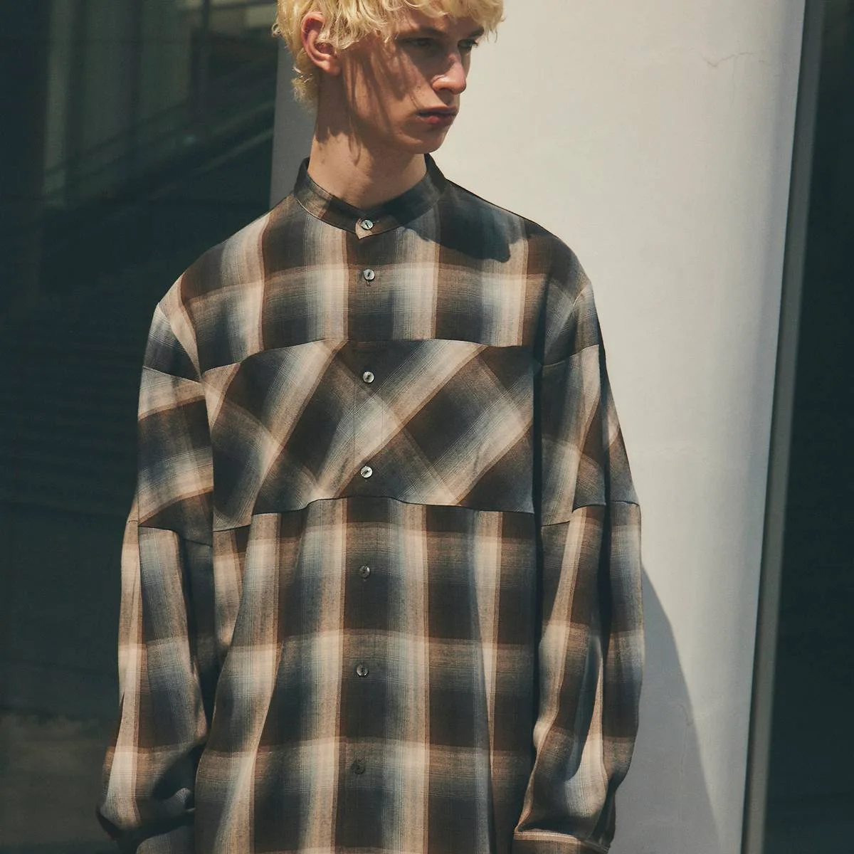 レーヨンの上品な光沢とドレープ感が美しいオンブレチェックシャツ。身頃と袖の切り替えにバイアスを使用することで、動きのあるシルエットに仕上げました。カジュアルになりすぎないモードな印象のシャツです。レーヨンならではの美しいドレープが洗練された雰囲気を演出します。手洗い可。日本製。