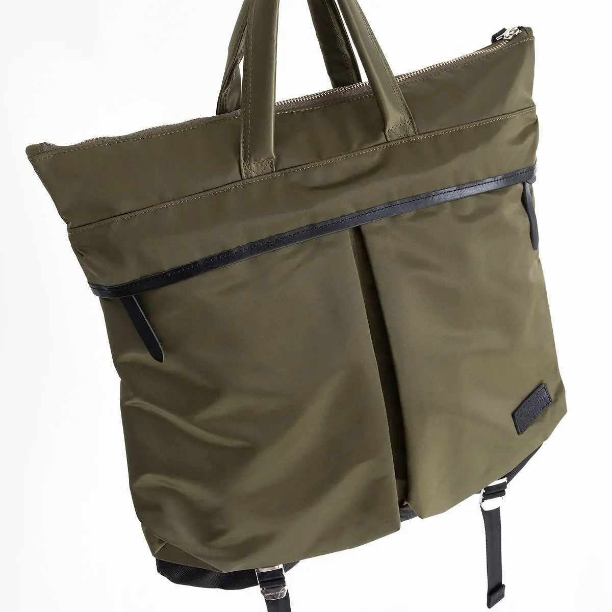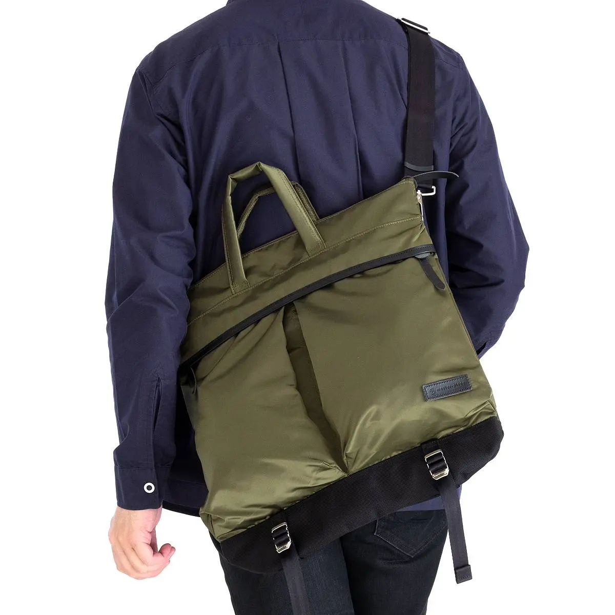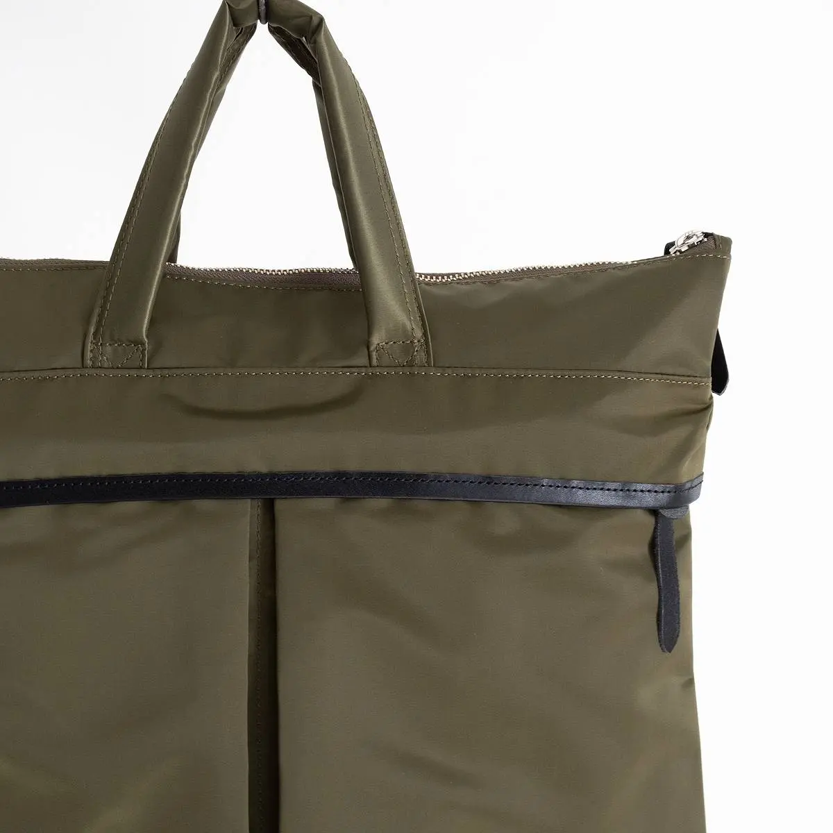 上品なツヤ感を持った超高密度ナイロンツイルと金属パーツを効かせたミリタリーテイストのシリーズです。本体素材には、タテ糸に70d・ヨコ糸に210dのナイロンセミダル糸をインチ間でタテ275本、ヨコ82本の高密度で織り上げてハリ・コシを持たせた超高密度ナイロンツイルを使用しています。タテ糸が表2本飛ばし、裏2本飛ばしの特殊な織り方をすることで柔らかな光沢感に仕上げております。付属素材には通常のナイロンよりも耐久性を持ち、摩擦・引き裂きに強いCORDURA Ballistic fabric 1680dナイロンを使用し、タテ840d・横ヨコ40dの撚った糸を二本ずつ引き揃えることで、より摩擦・引き裂き強度が強化され、表面には撥水加工、裏面にはPUコーティングを施しています。また付属レザーには、日本皮革技術協会の13種の基準がある有害物質検査(JES)済みで人体に有害な物質・六価クロムを一切使用せず、ベジタブルタンニンで鞣されたエコカウレザーを使用しています。日本製。