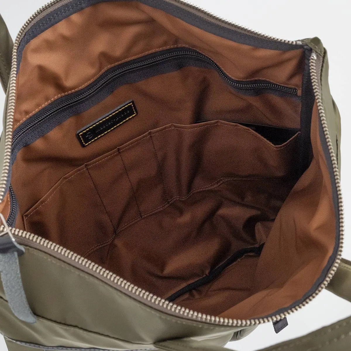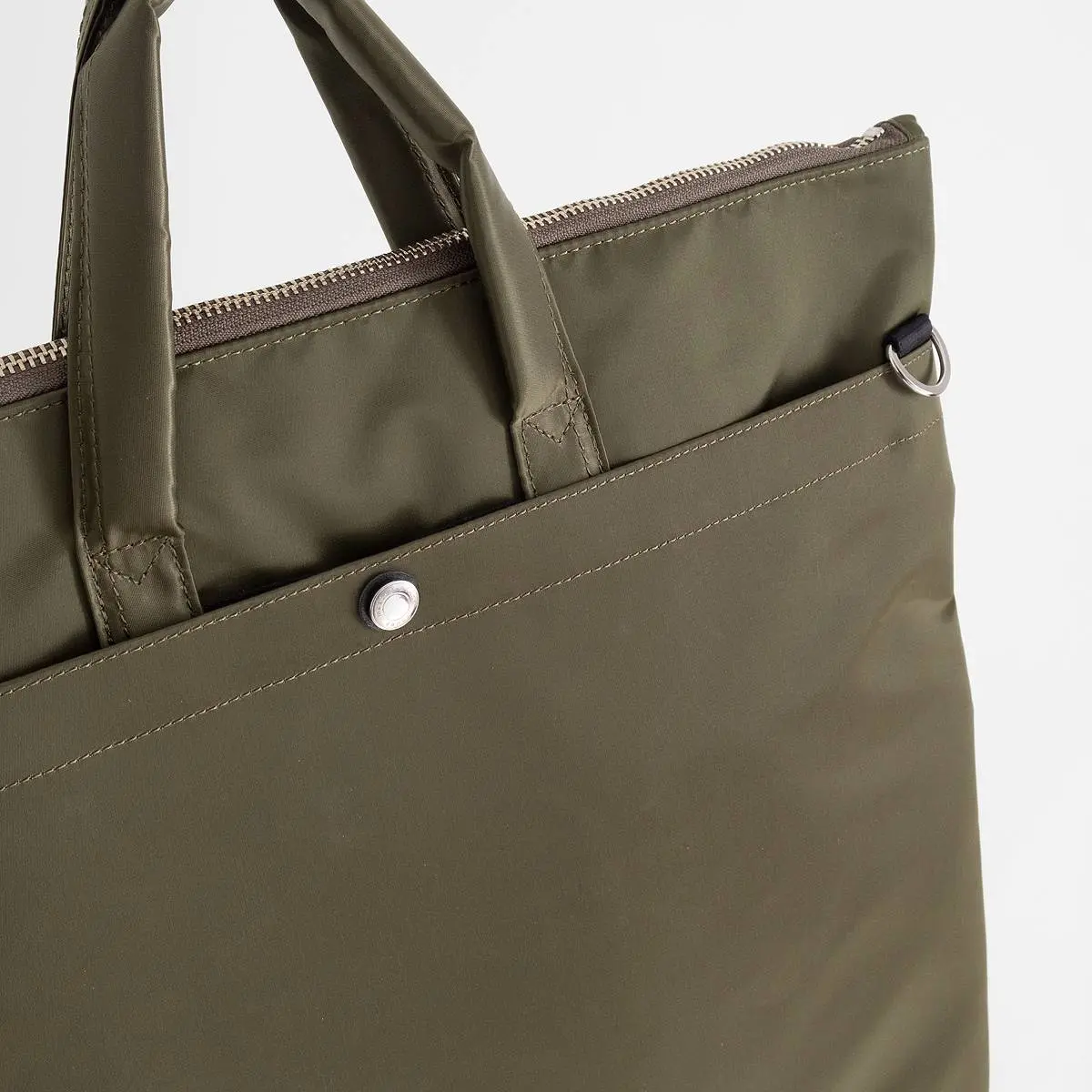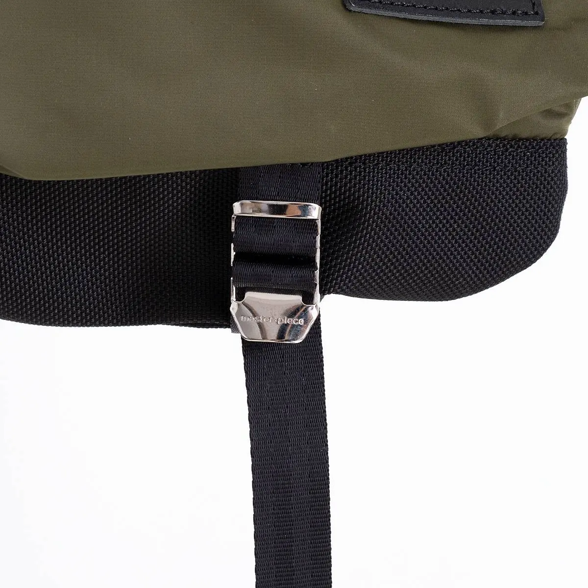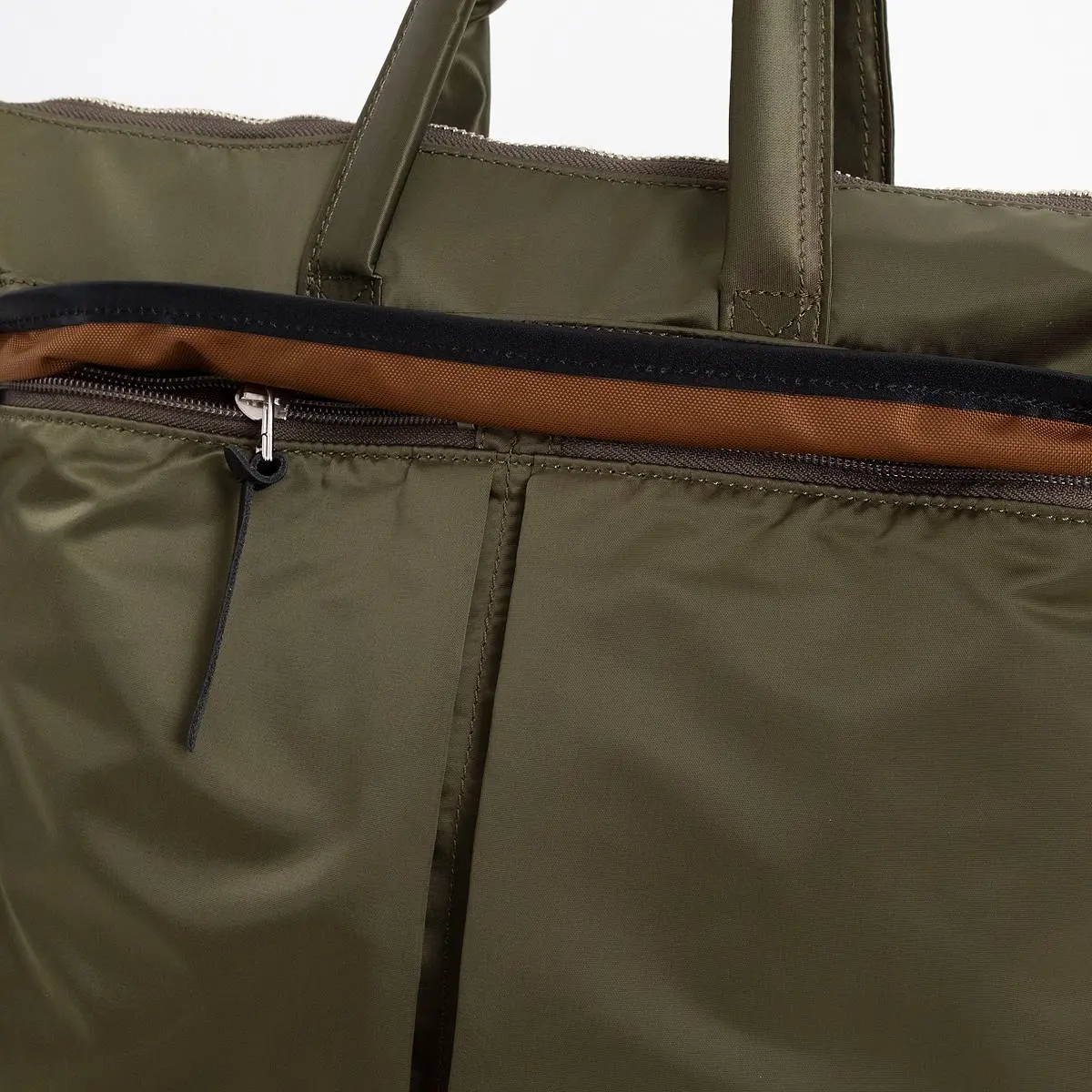 上品なツヤ感を持った超高密度ナイロンツイルと金属パーツを効かせたミリタリーテイストのシリーズです。本体素材には、タテ糸に70d・ヨコ糸に210dのナイロンセミダル糸をインチ間でタテ275本、ヨコ82本の高密度で織り上げてハリ・コシを持たせた超高密度ナイロンツイルを使用しています。タテ糸が表2本飛ばし、裏2本飛ばしの特殊な織り方をすることで柔らかな光沢感に仕上げております。付属素材には通常のナイロンよりも耐久性を持ち、摩擦・引き裂きに強いCORDURA Ballistic fabric 1680dナイロンを使用し、タテ840d・横ヨコ40dの撚った糸を二本ずつ引き揃えることで、より摩擦・引き裂き強度が強化され、表面には撥水加工、裏面にはPUコーティングを施しています。また付属レザーには、日本皮革技術協会の13種の基準がある有害物質検査(JES)済みで人体に有害な物質・六価クロムを一切使用せず、ベジタブルタンニンで鞣されたエコカウレザーを使用しています。日本製。