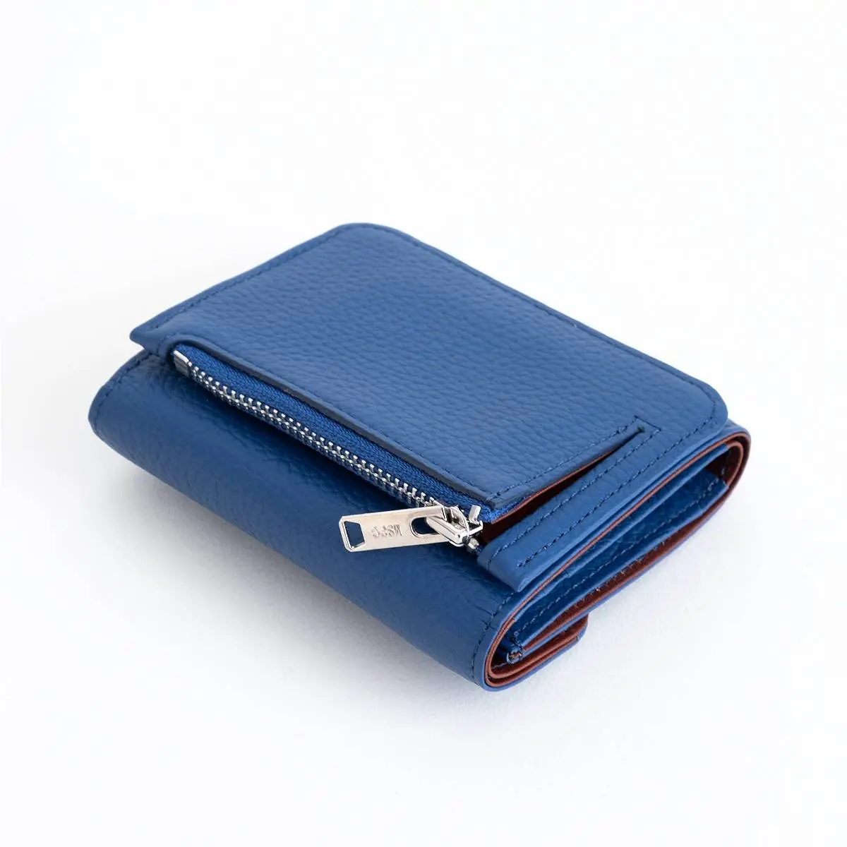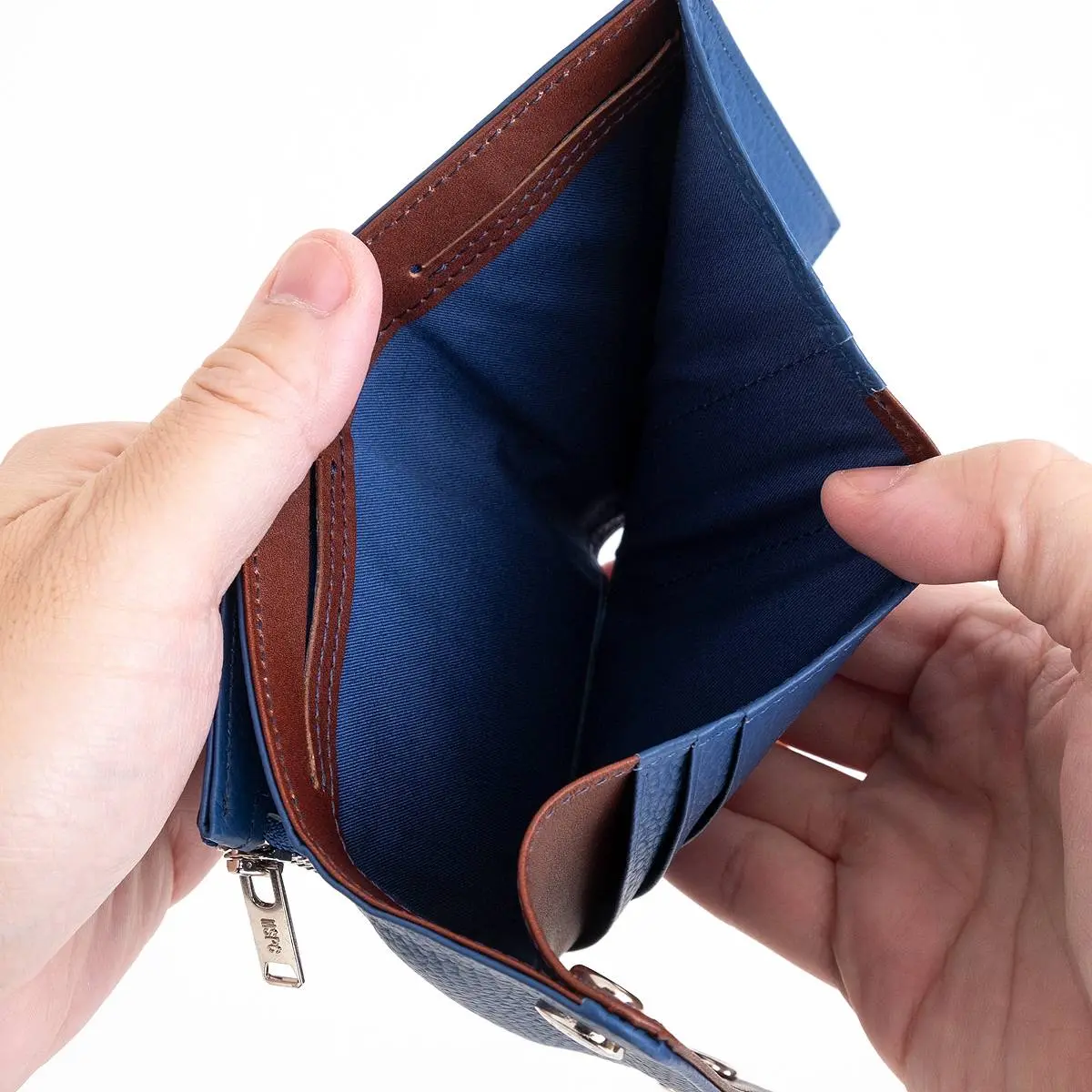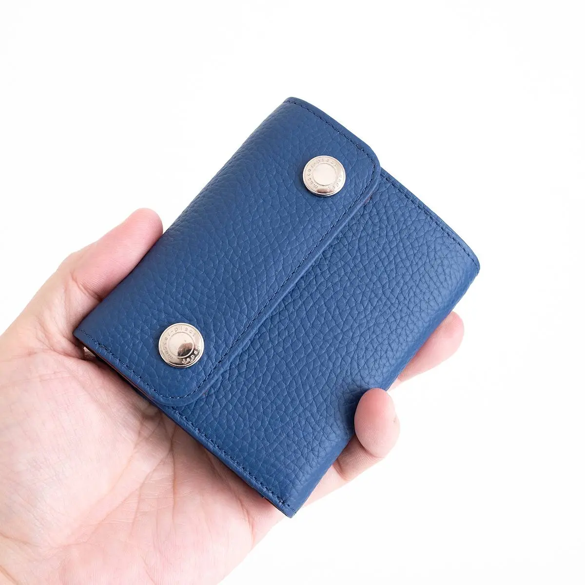 アメリカのトラッカーウォレットのイメージをベースに、現在の生活環境で使いやすい機能性とサイズ感に落とし込んだ小物シリーズ。ポケットにも収めやすいサイズ感でありながら、充実の収納力が特徴のミドルウォレット。本体素材は国産・北米・ヨーロッパのその時の良質な原皮を厳選し使用しています。クロム鞣し後に染色を行い、ヨーロッパの微粒子顔料(マイクロピグメント)を使用することにより透明感があるにも関わらず色落ち・色褪せがしにくい仕上げとなっています。家具用革としても使用されており、堅牢性・耐光性に優れ、柔らかい風合いと手触りが特徴です。内装で使用しているレザーは国産・北米・ヨーロッパのその時の良質な原皮を使用し、コンビネーション鞣し(クロム鞣し後、多めのタンニンで再鞣しをしたもの)で染色段階からオイルをたっぷりと浸透させています。染色後に染料のみで仕上げ、最終工程にベタツキが出ない特殊オイルを含ませるダブルオイル(再加脂)の手法を取っているため、革が柔軟で銀面もしっとりとしたオイルタッチが楽しめます。革本来の特徴を活かしたアニリン製法とオイルの深み、重厚さを兼ね備えた素材になります。アメリカのトラッカーウォレットのイメージをベースに、現在の生活環境で使いやすい機能性とサイズ感に落とし込んでいます。芯の使い方を極力ソフトにするなど布帛製品のようなカジュアル感を意識しつつ、レザー製品ならではの製造テクニックを駆使することで他にはないレザー小物シリーズとなっています。本体の3色のカラーは、ブラックはレザージャケットやレザーシューズに用いられるスタンダードカラー、ブルーはデニム、オリーブはミリタリーをイメージしています。日本製。