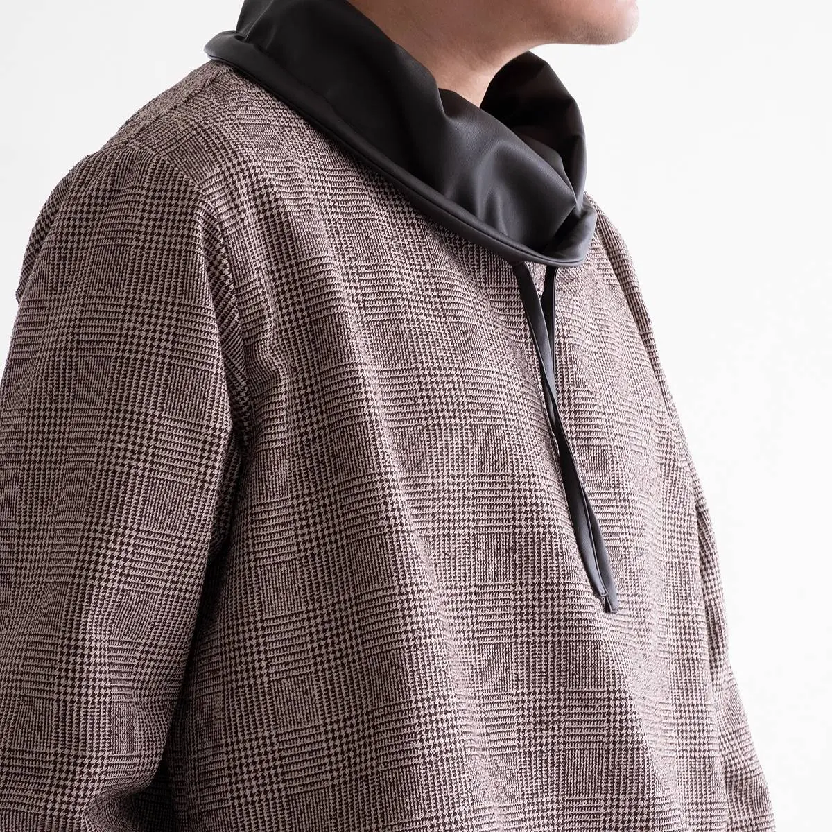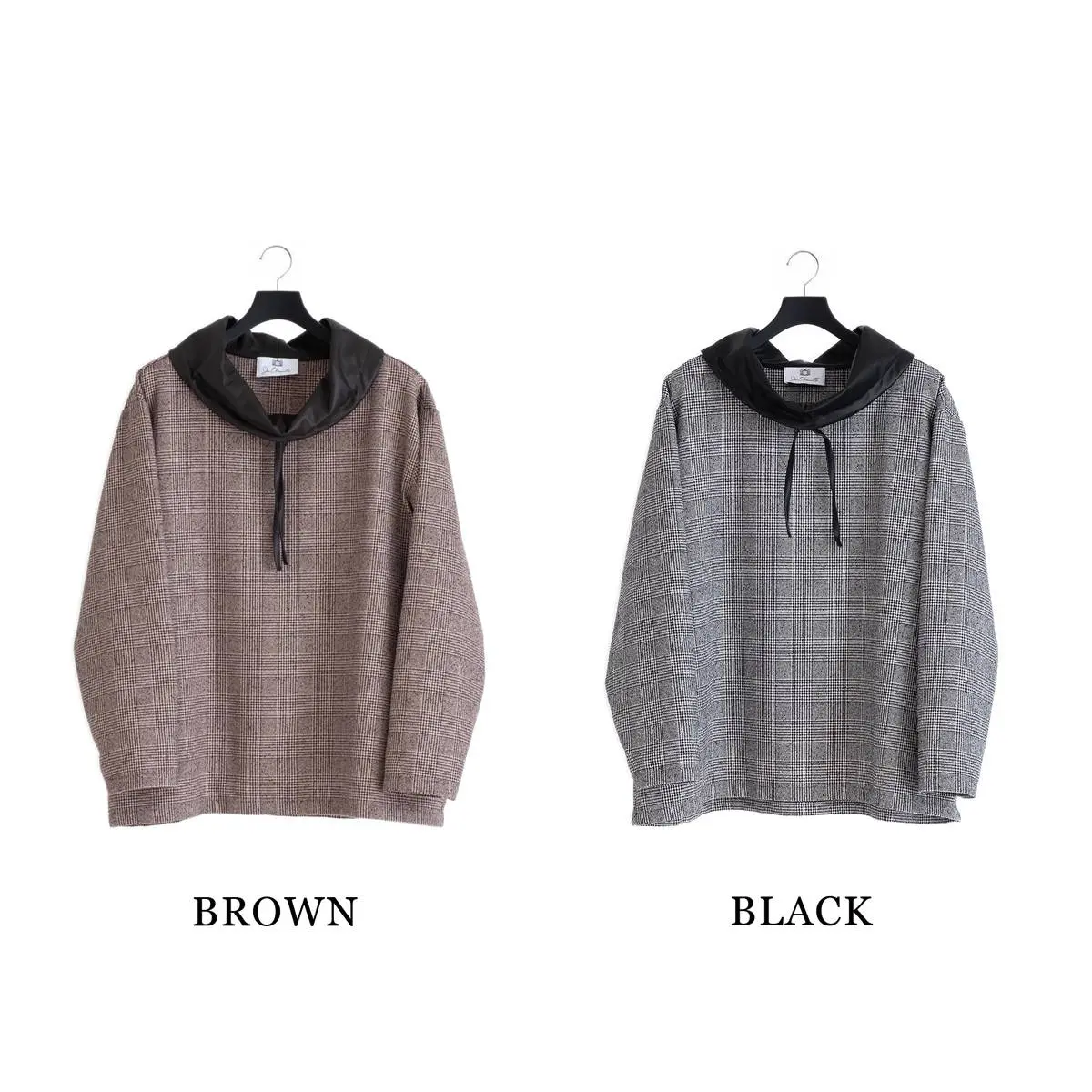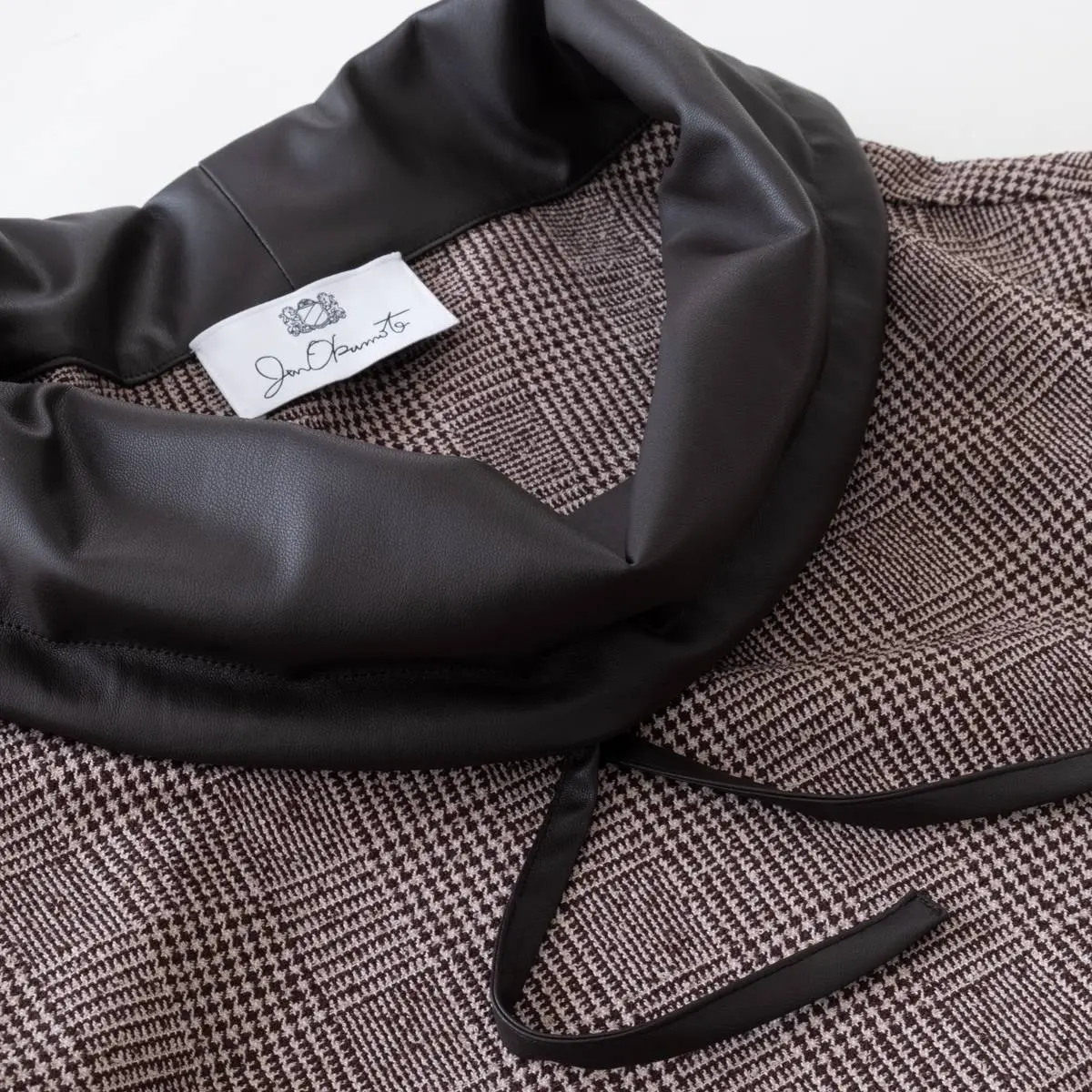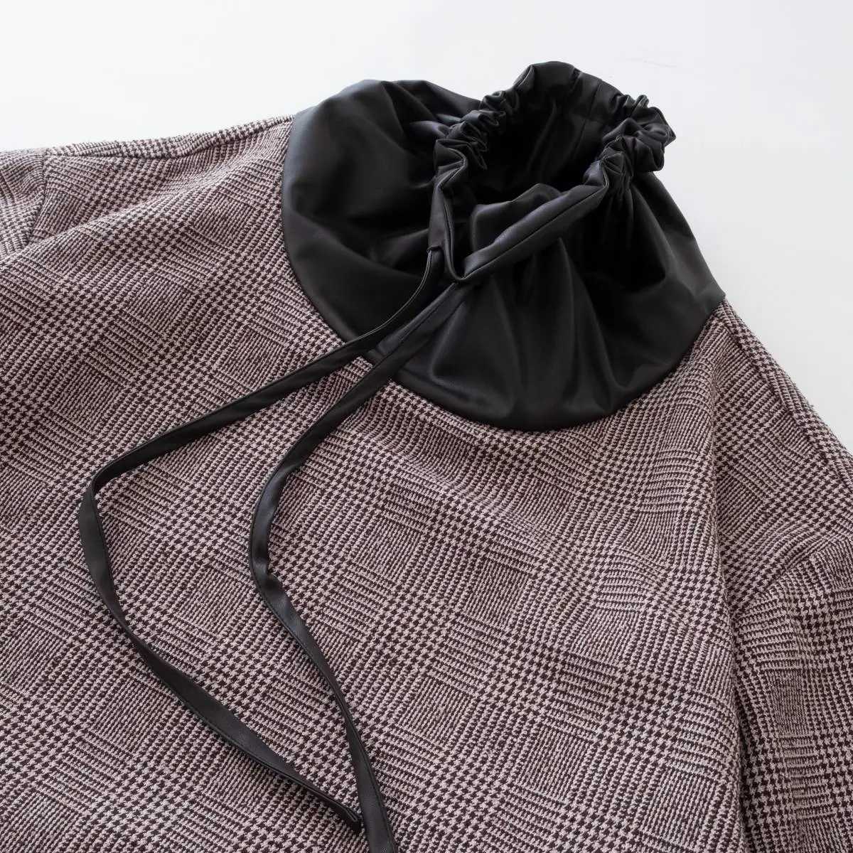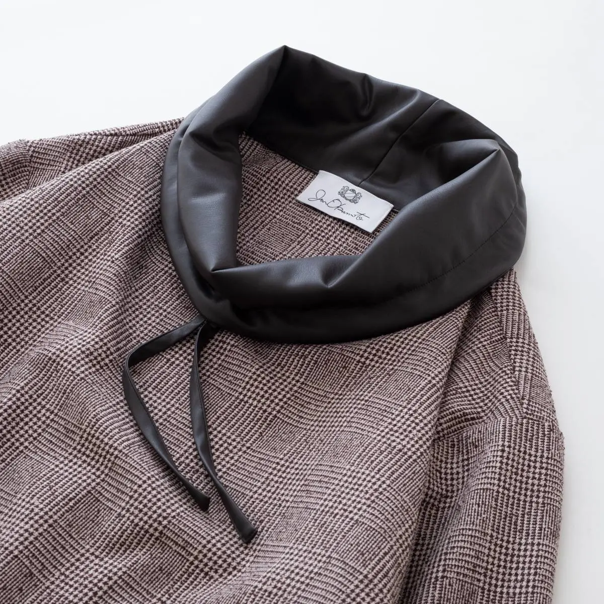 レーヨンリング糸でツィード調に仕上げたグレンチェック生地と、フェイクレザーの異素材使いが、洗練された印象を与えるトップス。首元のレザー切り替え部分を絞めることにより、モードな印象を与え、風の侵入も防ぎます。一枚でさらりと着こなすのはもちろん、ジャケットのインナーとしてもおすすめです。手洗い可。日本製。