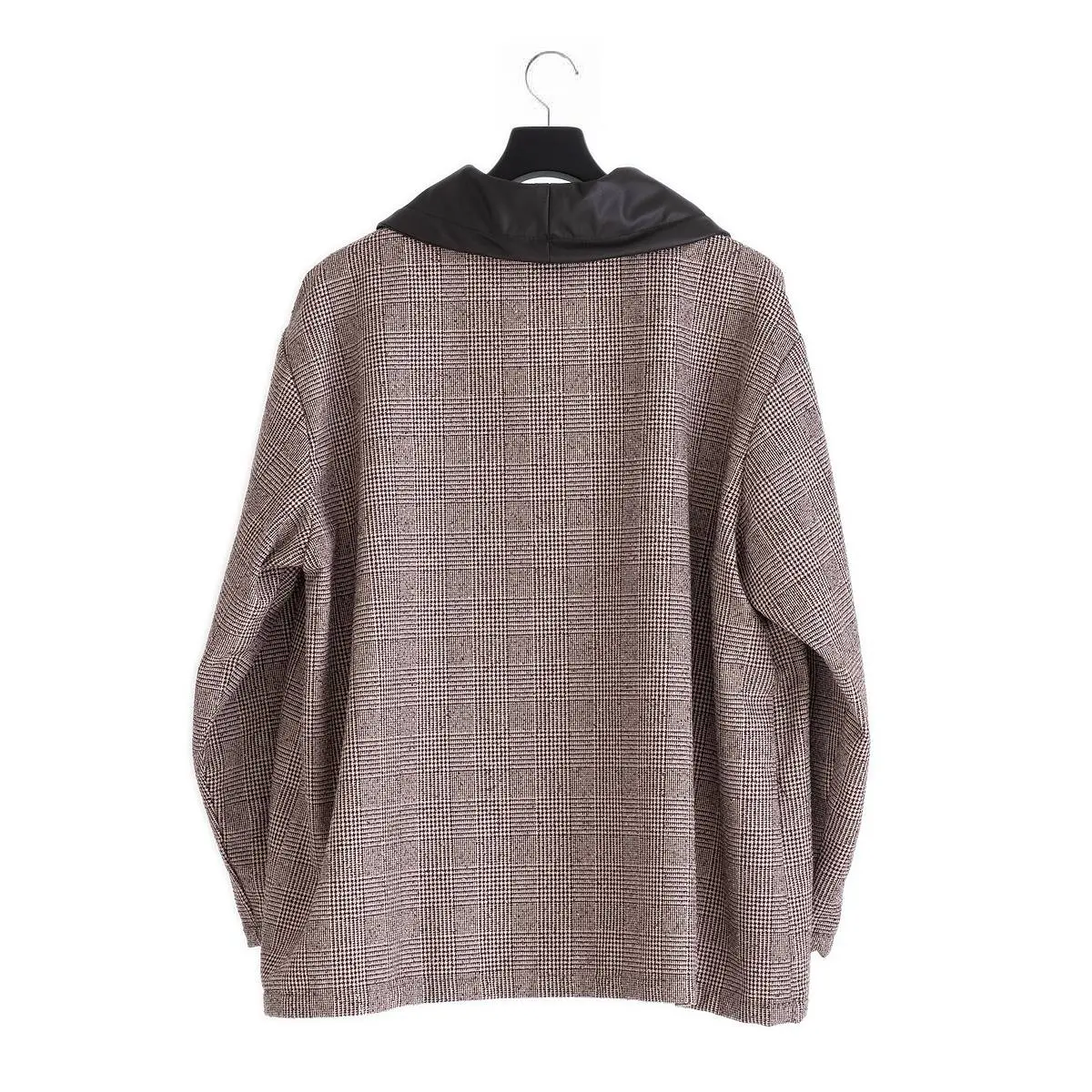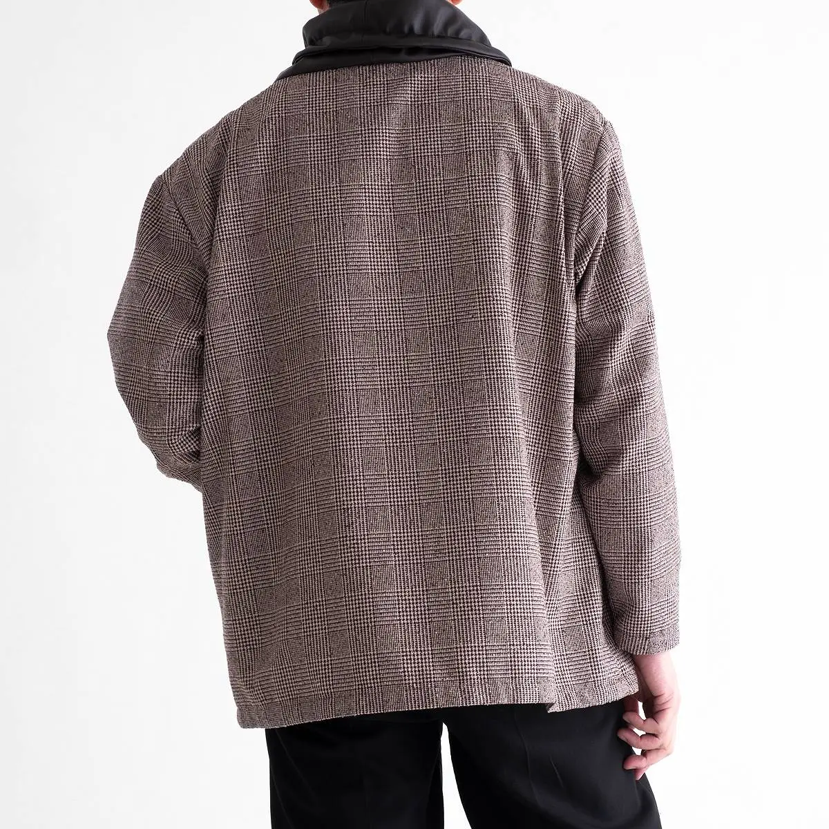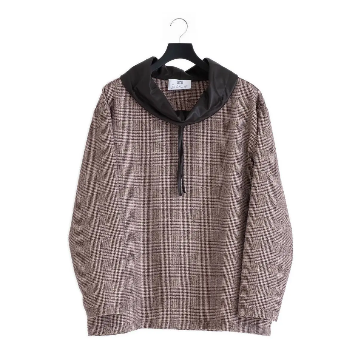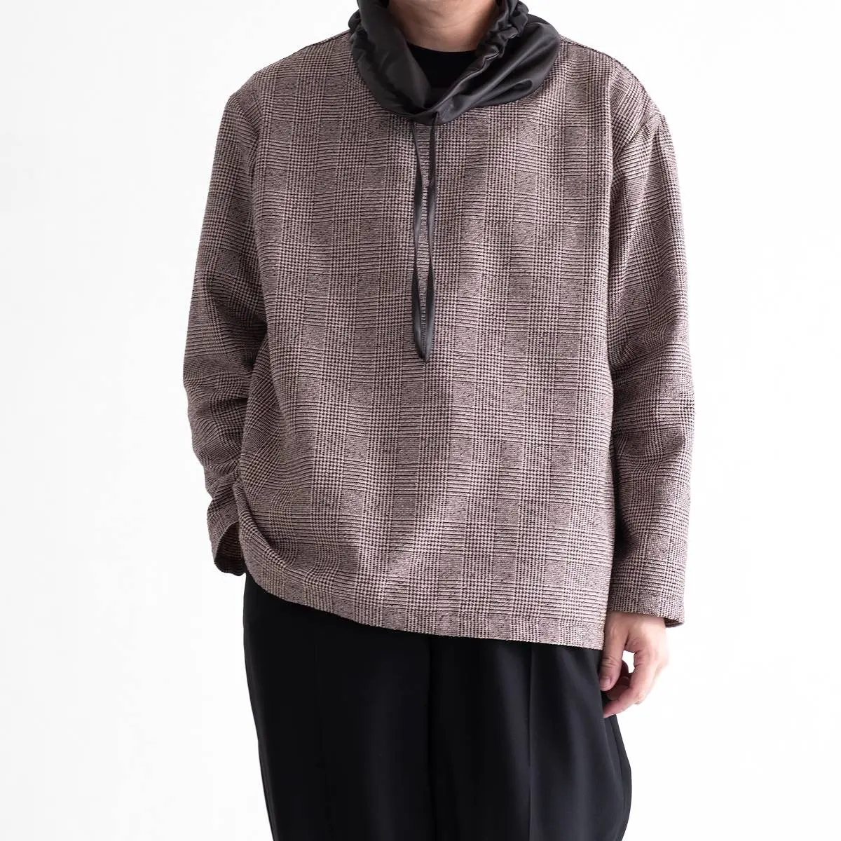 レーヨンリング糸でツィード調に仕上げたグレンチェック生地と、フェイクレザーの異素材使いが、洗練された印象を与えるトップス。首元のレザー切り替え部分を絞めることにより、モードな印象を与え、風の侵入も防ぎます。一枚でさらりと着こなすのはもちろん、ジャケットのインナーとしてもおすすめです。手洗い可。日本製。