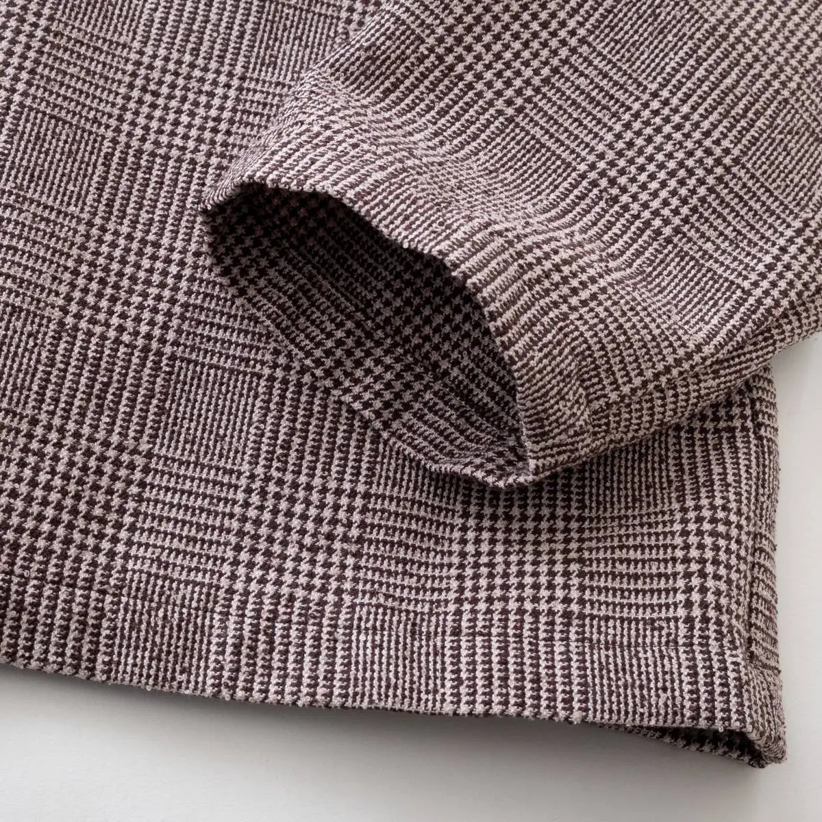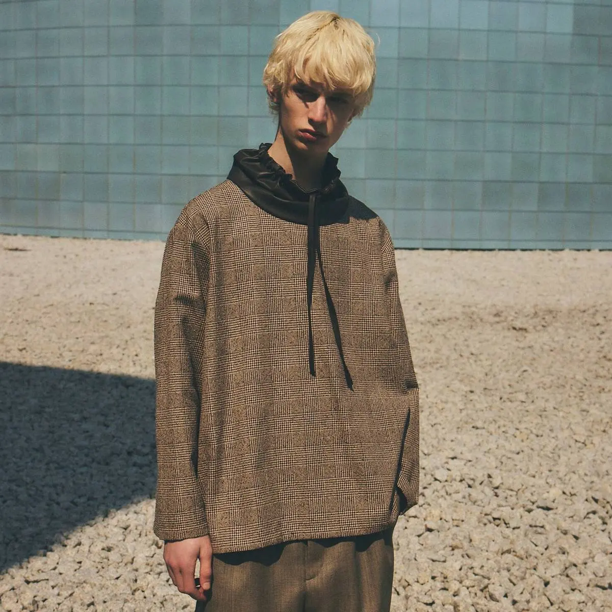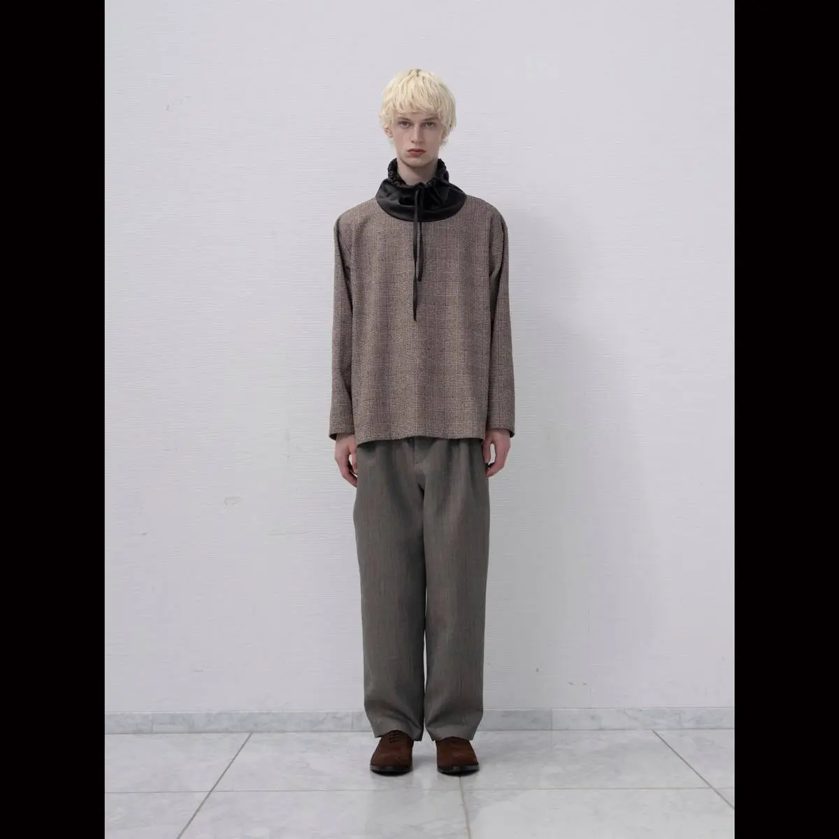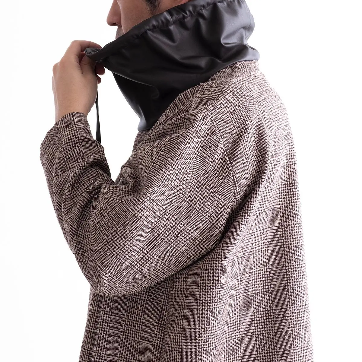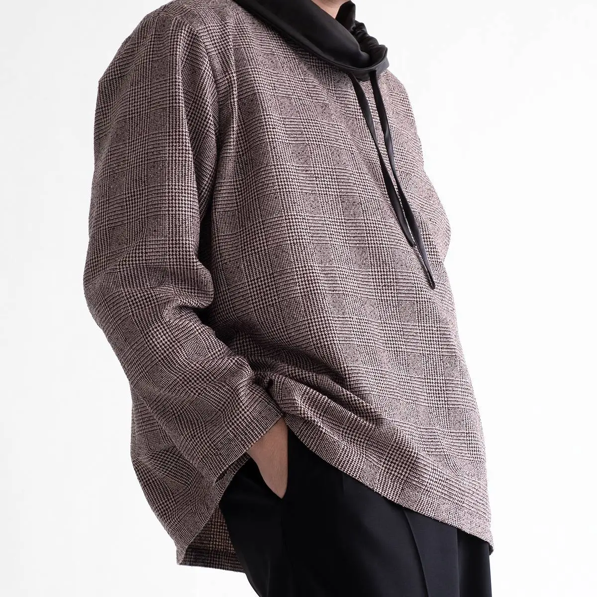 レーヨンリング糸でツィード調に仕上げたグレンチェック生地と、フェイクレザーの異素材使いが、洗練された印象を与えるトップス。首元のレザー切り替え部分を絞めることにより、モードな印象を与え、風の侵入も防ぎます。一枚でさらりと着こなすのはもちろん、ジャケットのインナーとしてもおすすめです。手洗い可。日本製。